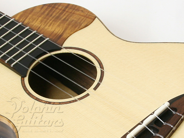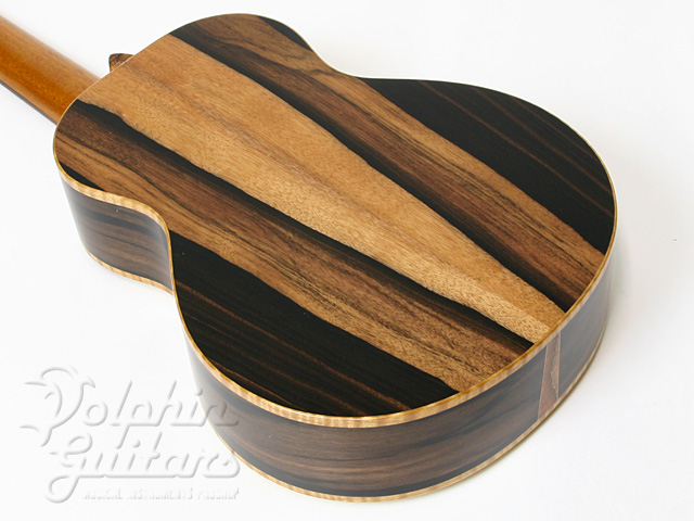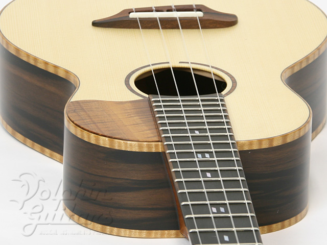 均整の取れた美しいヨーロピアン・スプルースをトップに、ワイルドな木目のストライプド・エボニーをサイド&バックに使用、ホンジュラス・マホガニー・ネック、エボニー指板、マダガスカル・ローズウッド駒、コア・ピックガード。