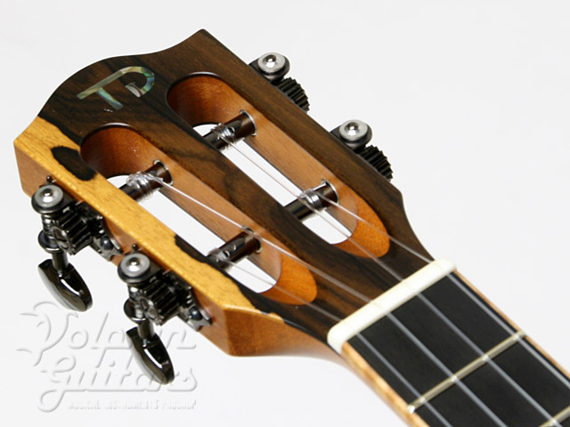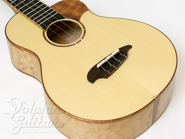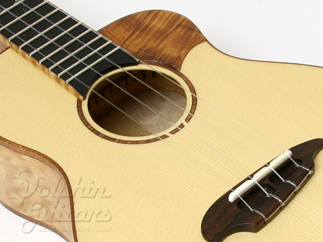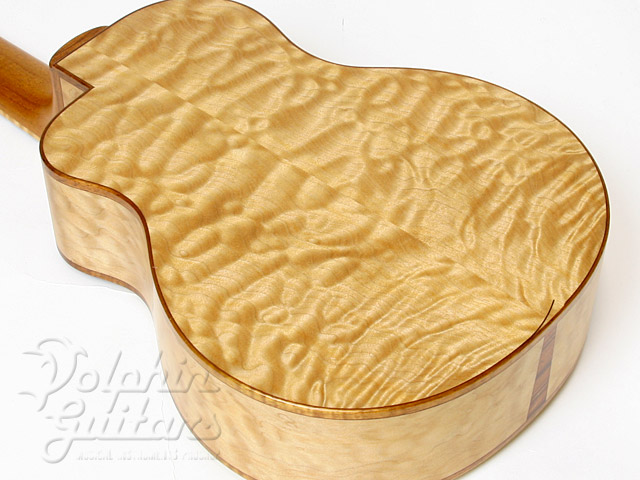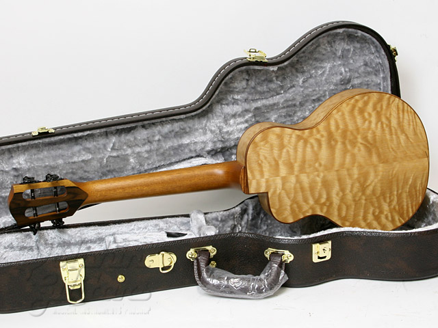トップには木目の詰まったヨーロピアン・スプルースを、3Aグレード(最高級)の美しいキルテッド・メイプル・サイド&バック、付き板には特徴的な木目のジリコーテを、スロテッド・ヘッド、エボニー指板、マダガスカルローズ駒、コア・ピックガード、
