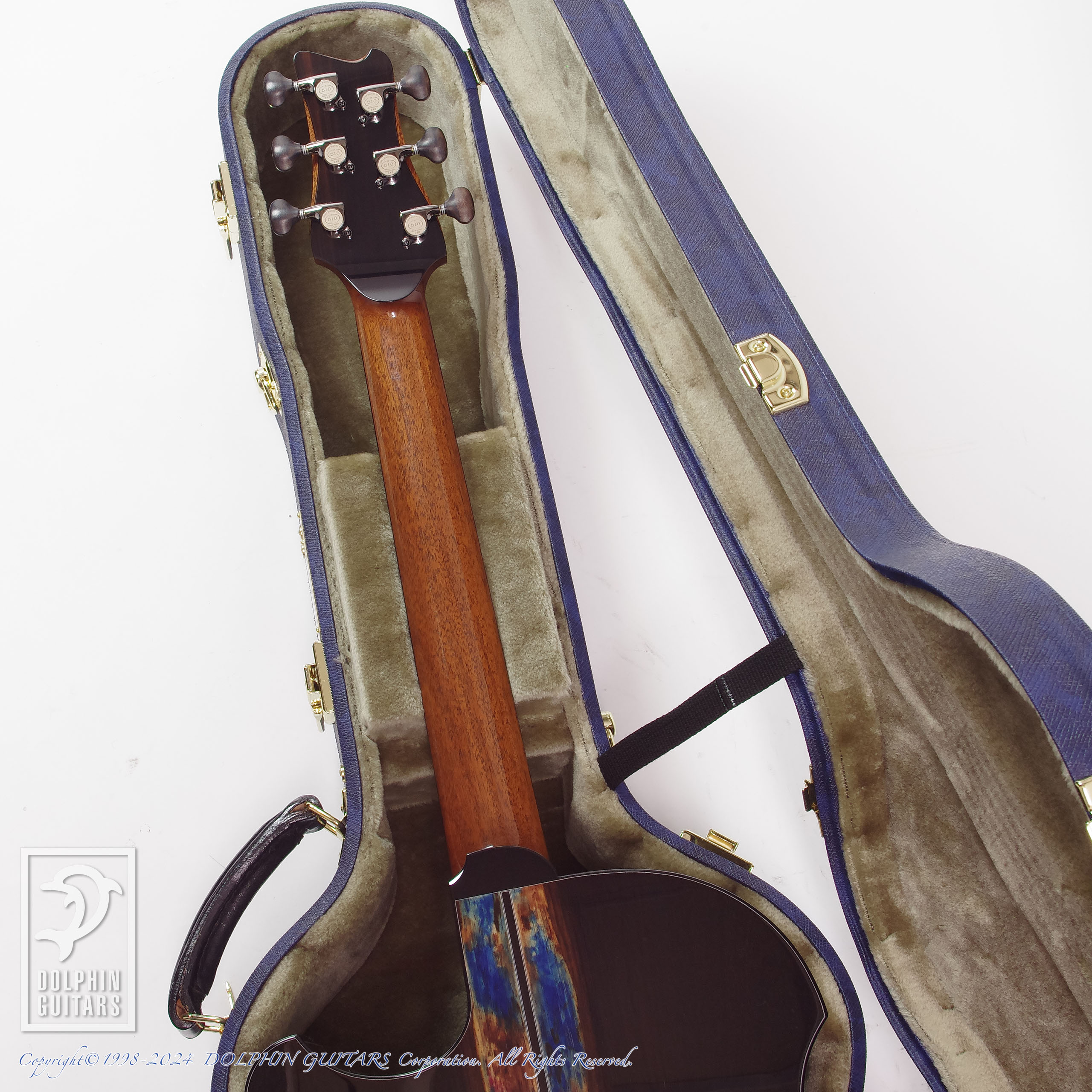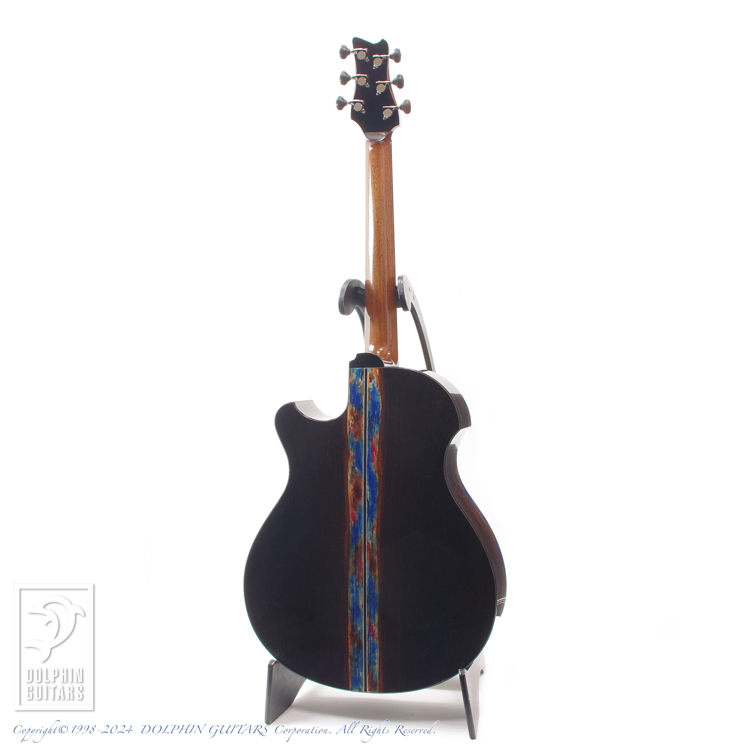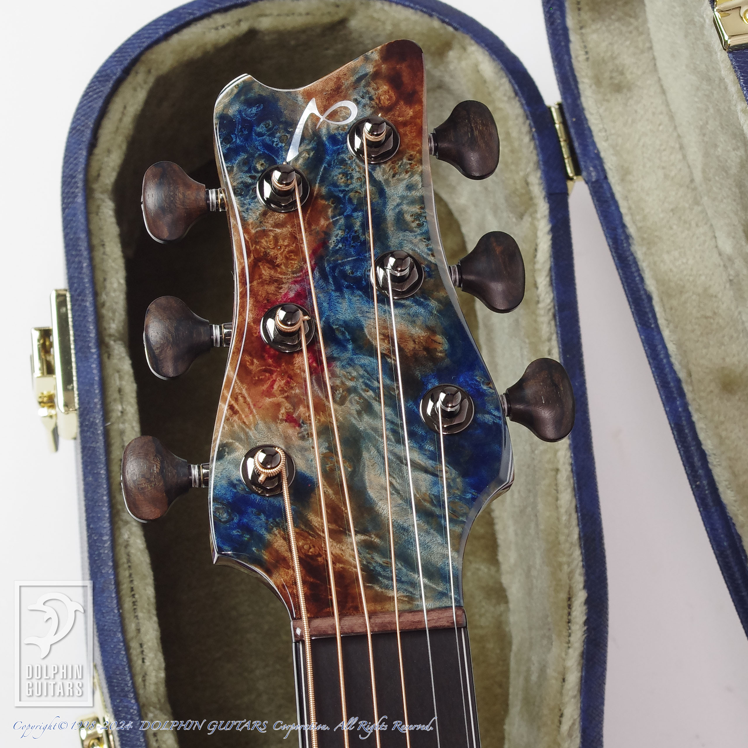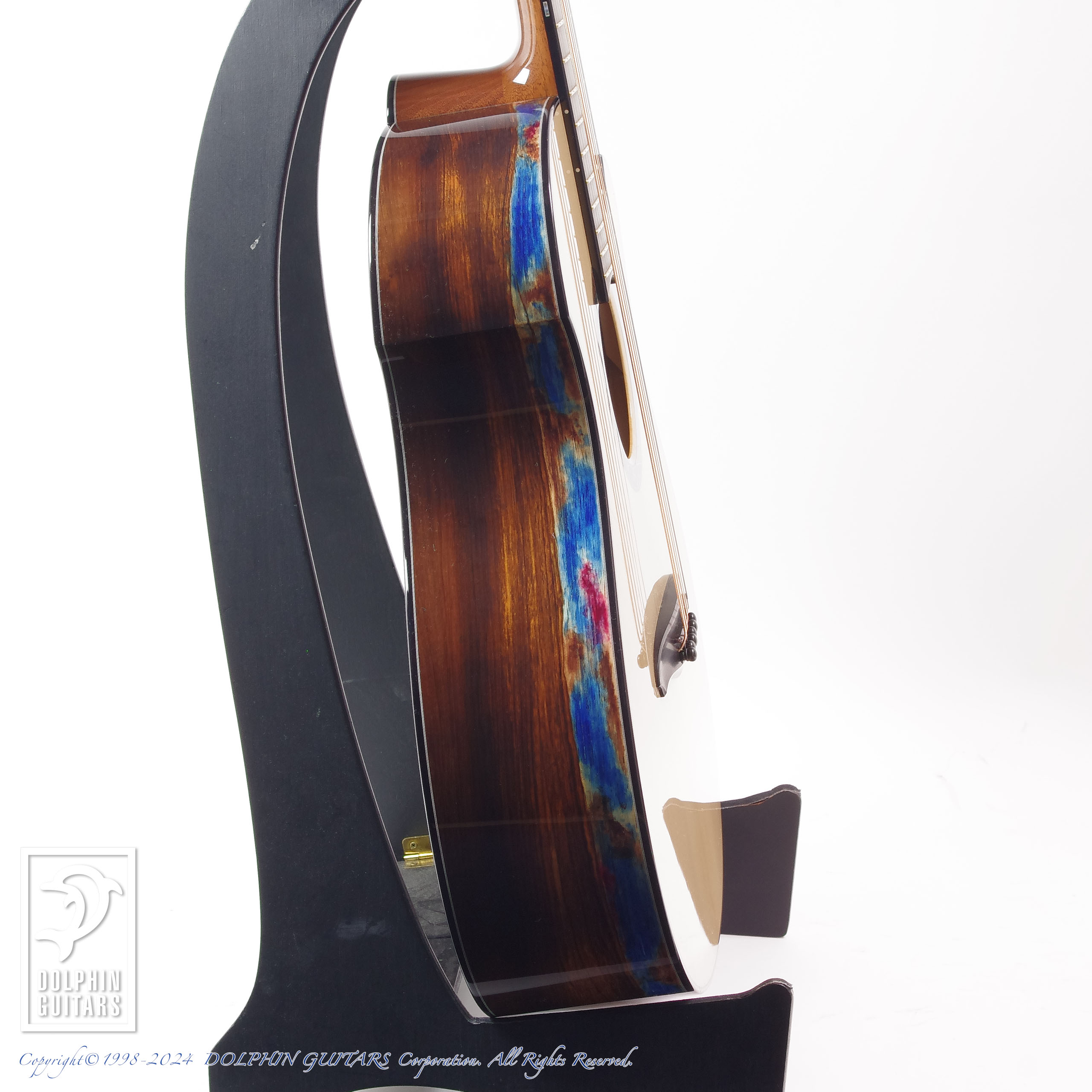 ハカランダ材のサップ(白太)部分やバールウッドのヘッドプレート・ロゼッタを染色。独創的なボディシェイプに染色という独自のカラーを施し、他メーカーにはない個性溢れるモデルであります。