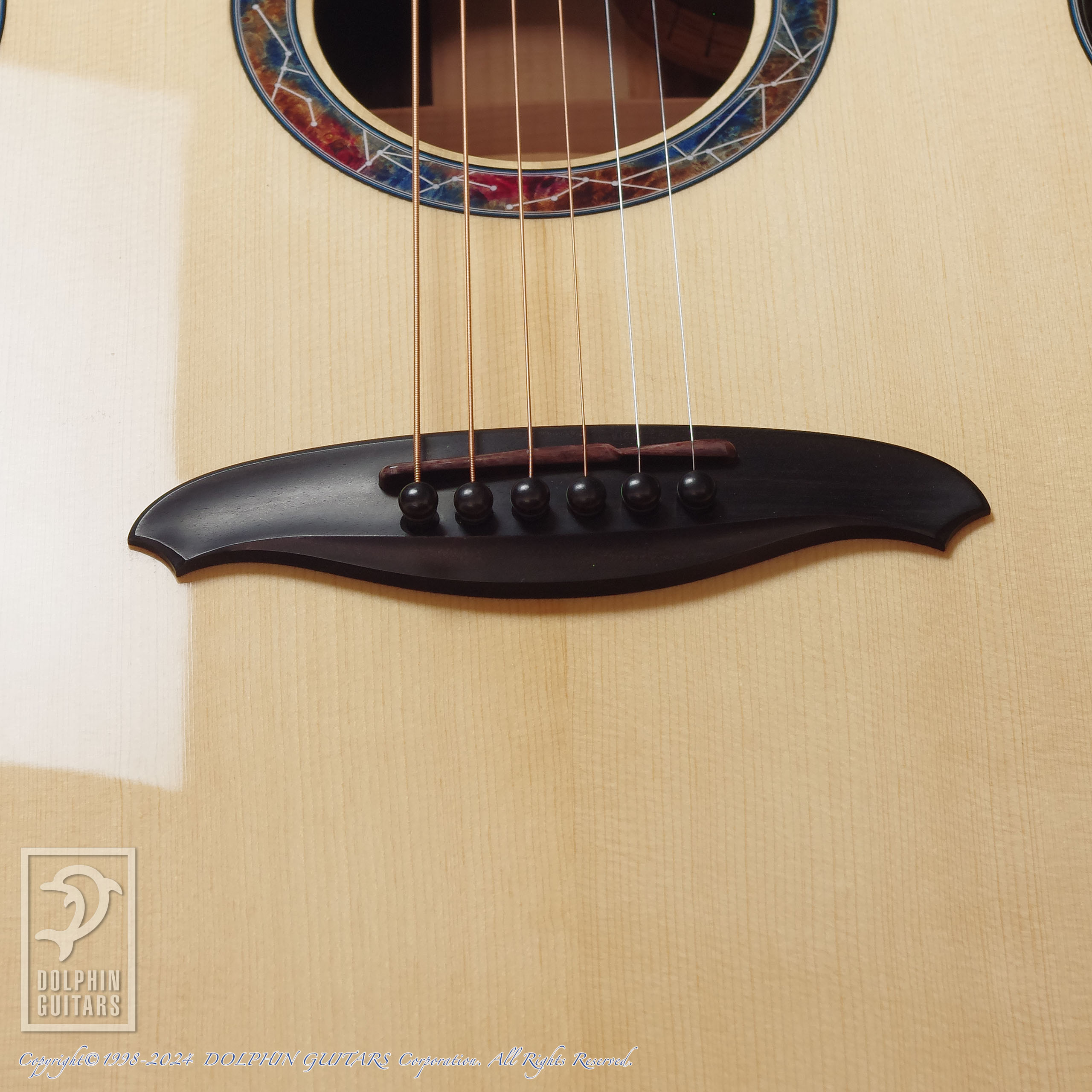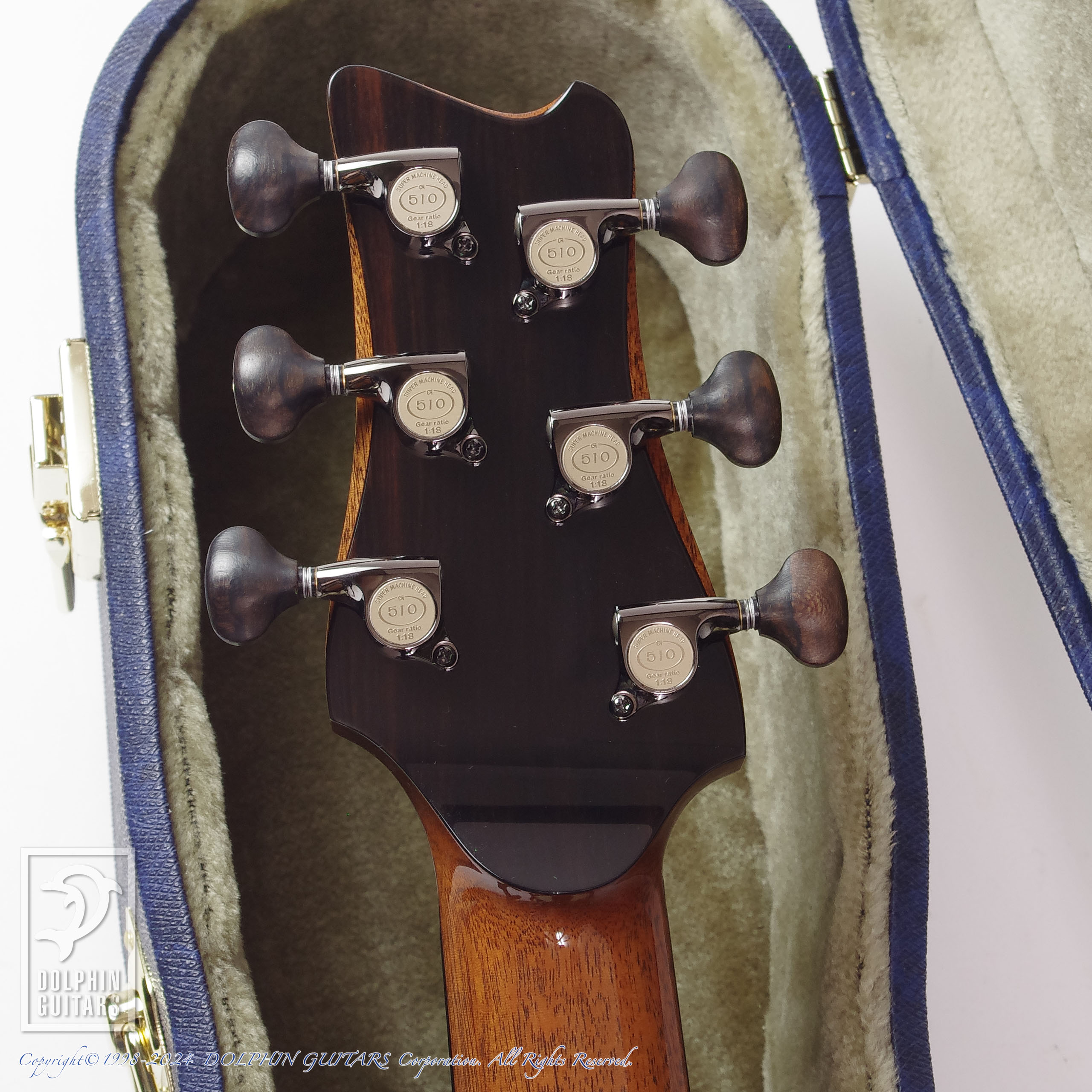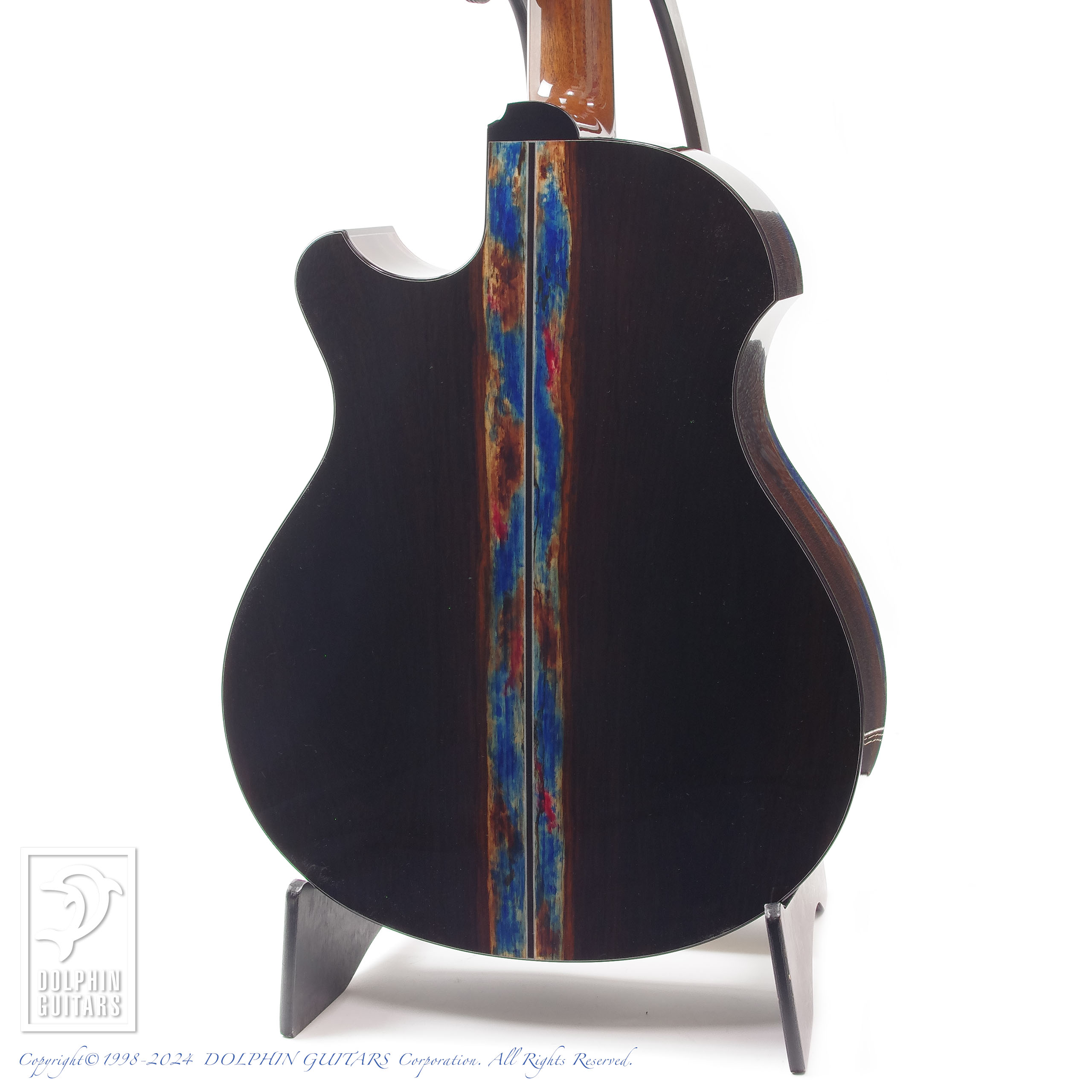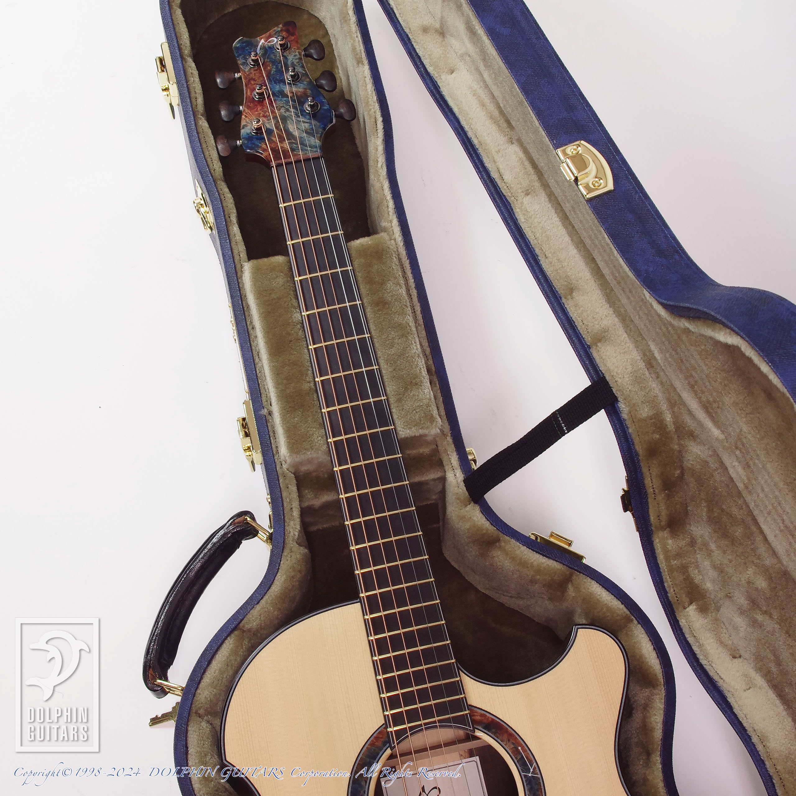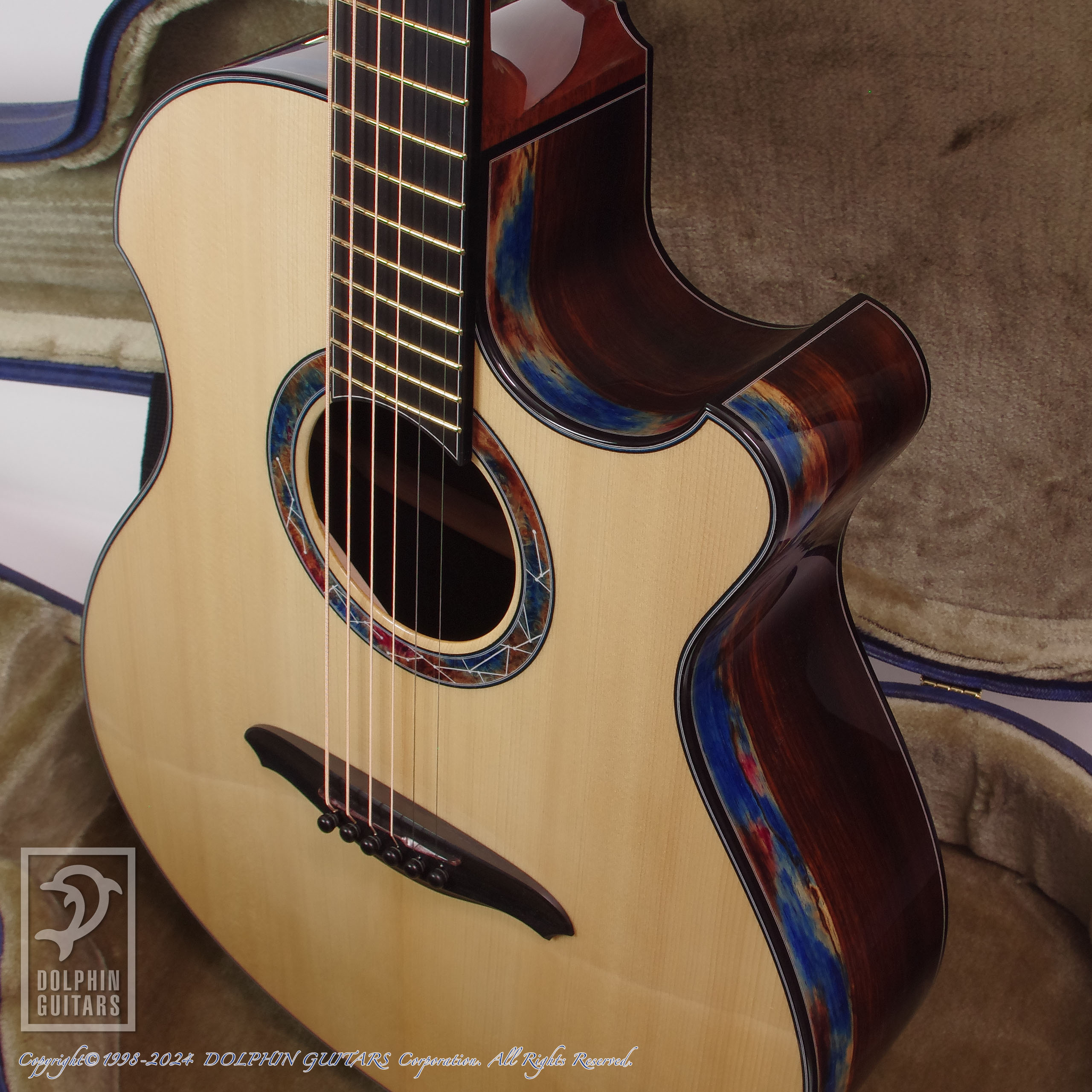 ハカランダ材のサップ(白太)部分やバールウッドのヘッドプレート・ロゼッタを染色。独創的なボディシェイプに染色という独自のカラーを施し、他メーカーにはない個性溢れるモデルであります。