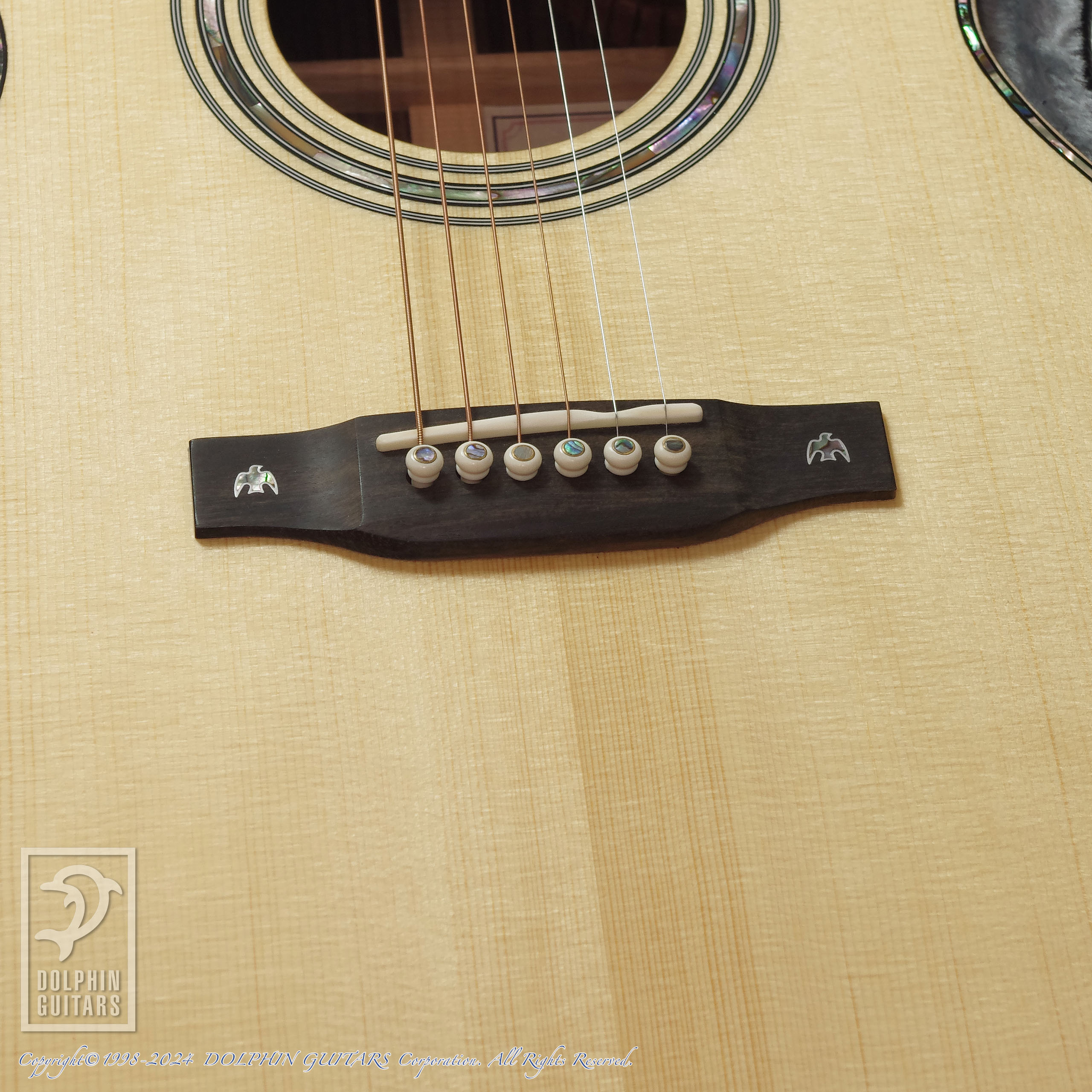 ロゼッタやインレイ、パーフリング等にアバロンの装飾が施されており、ルックスの華やかさが際立つ本モデル。他にも、ボディと指板のバインディングにはウッドバインディングを、ブリッジピンにはアバロンドットの装飾が入ったボーンピンが使用されています。