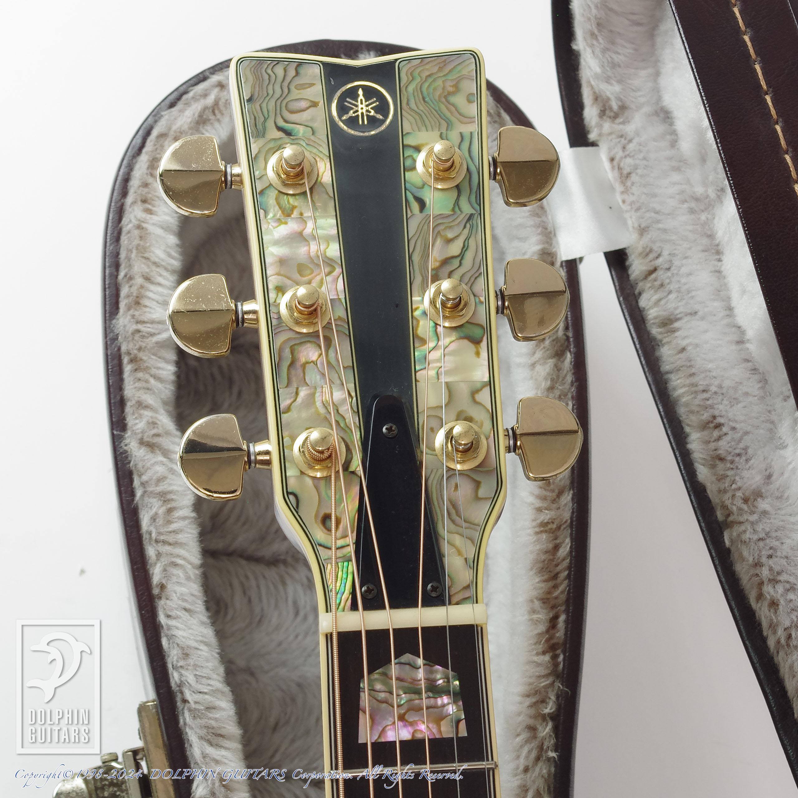 ひと目見てそれと分かるヘッドのアバロンインレイ。これほど大胆に特徴的なデザインはヤマハの全モデルの中でもずば抜けて圧倒的な存在感を放ちます。ヘッドだけではなく大柄な指板ポジションマークや、トップバックのアバロントリムとヤマハカスタムにふさわしい豪華仕様となっております。