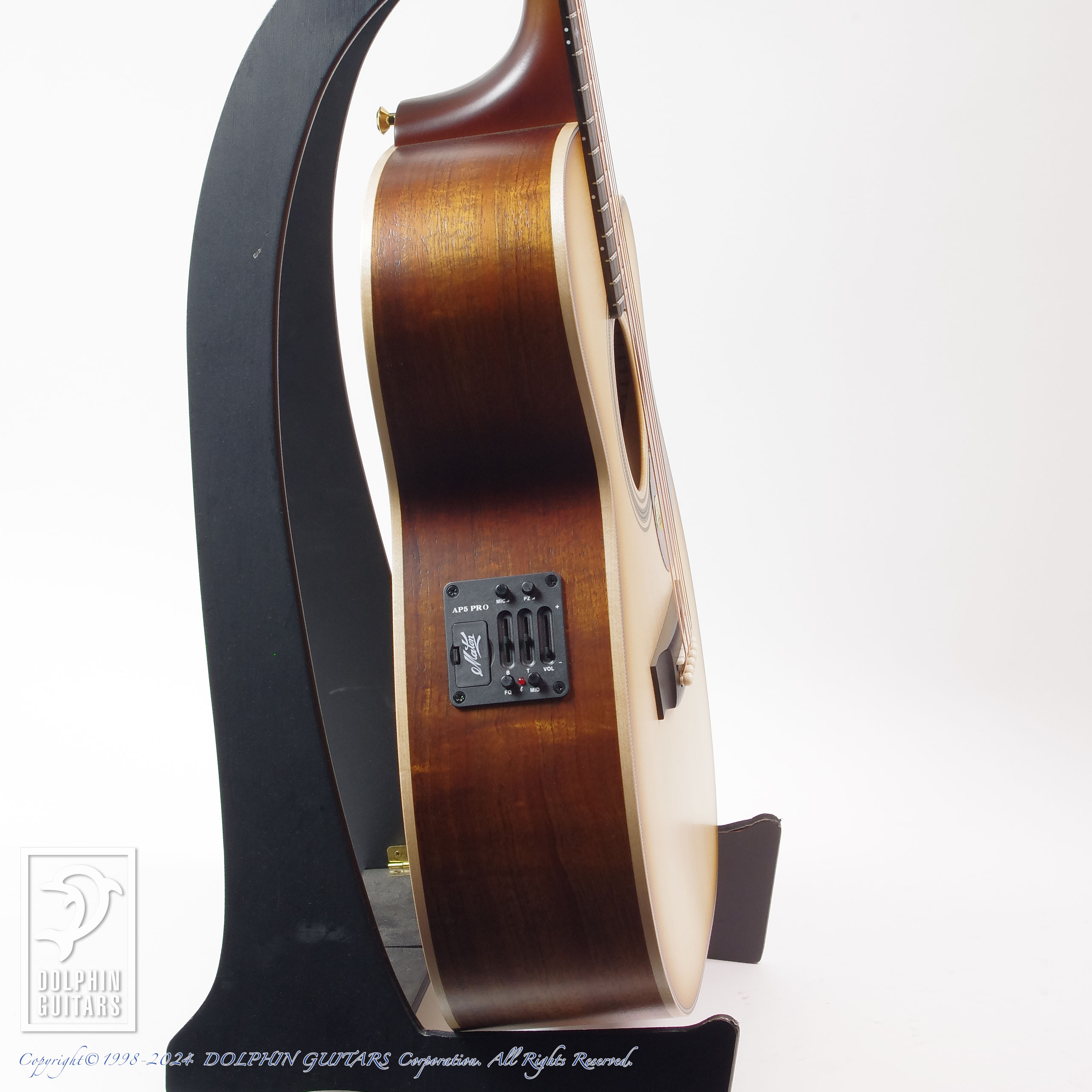 搭載されたAP5pro PUシステムは、オリジナルのアンダーサドルPUにコンデンサーマイクを併用する事により、奥行きのある音域と抜群なエアー感に加え、ボディーヒット音も余すことなくアウトプットします。また、高い出力を持つプリアンプを内蔵しておりますので、外部プリアンプ等を使用せずとも、そのままプラグインしていただければ極上のサウンドをお楽しみいただけます。PUとマイクVolは完全に独立しており、手元での出力バランス調整が可能ですのでお好みや現場に合わせてご使用下さい。