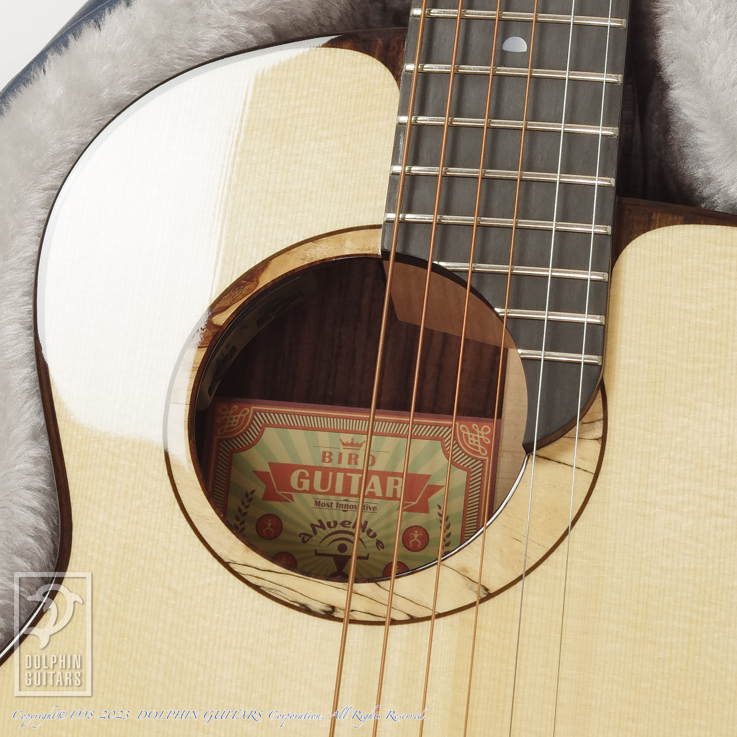 PUはアンダーサドルPUとエアーマイクをMixして出力可能なシステムが標準搭載されており、PUとマイクのMix割合もサウンドホール内側にあるコントロール部で容易に調整可能です。電池は9Vや単3ではなくコイン形リチウム電池を使用。