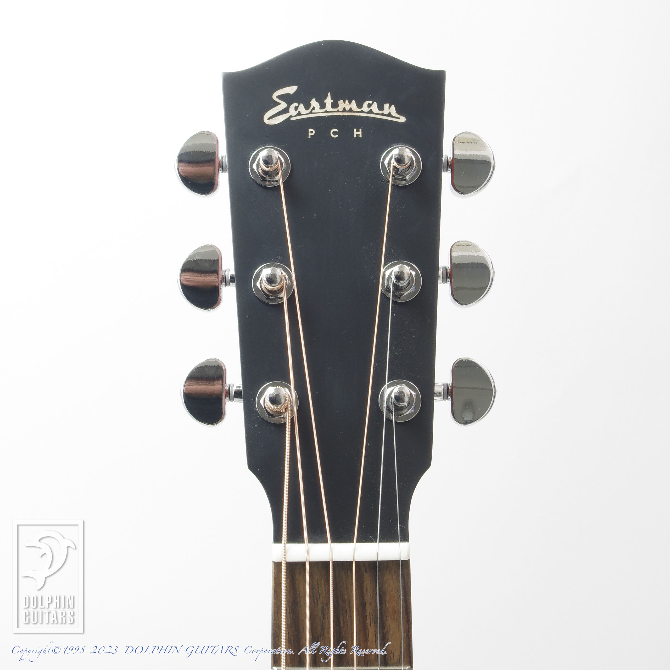イーストマンのフラットトップシリーズの中でも特にコストを抑えたモデルでありながら、妥協のないクオリティに驚かされます。窯の中で木材を低温で焼くことで湿気を取り除き、新品でありながらヴィンテージ品のような経年変化を感じさせる、独自のサーモキュア処理を施した単板のスプルースを採用しています。また、当社が傘下に収めるハイエンドブランドであるボジョアギターズのメゾットによる、独自のフィニッシュ「トゥルートーンフィニッシュ」はギターの音色を損ねることのないように構成されています。