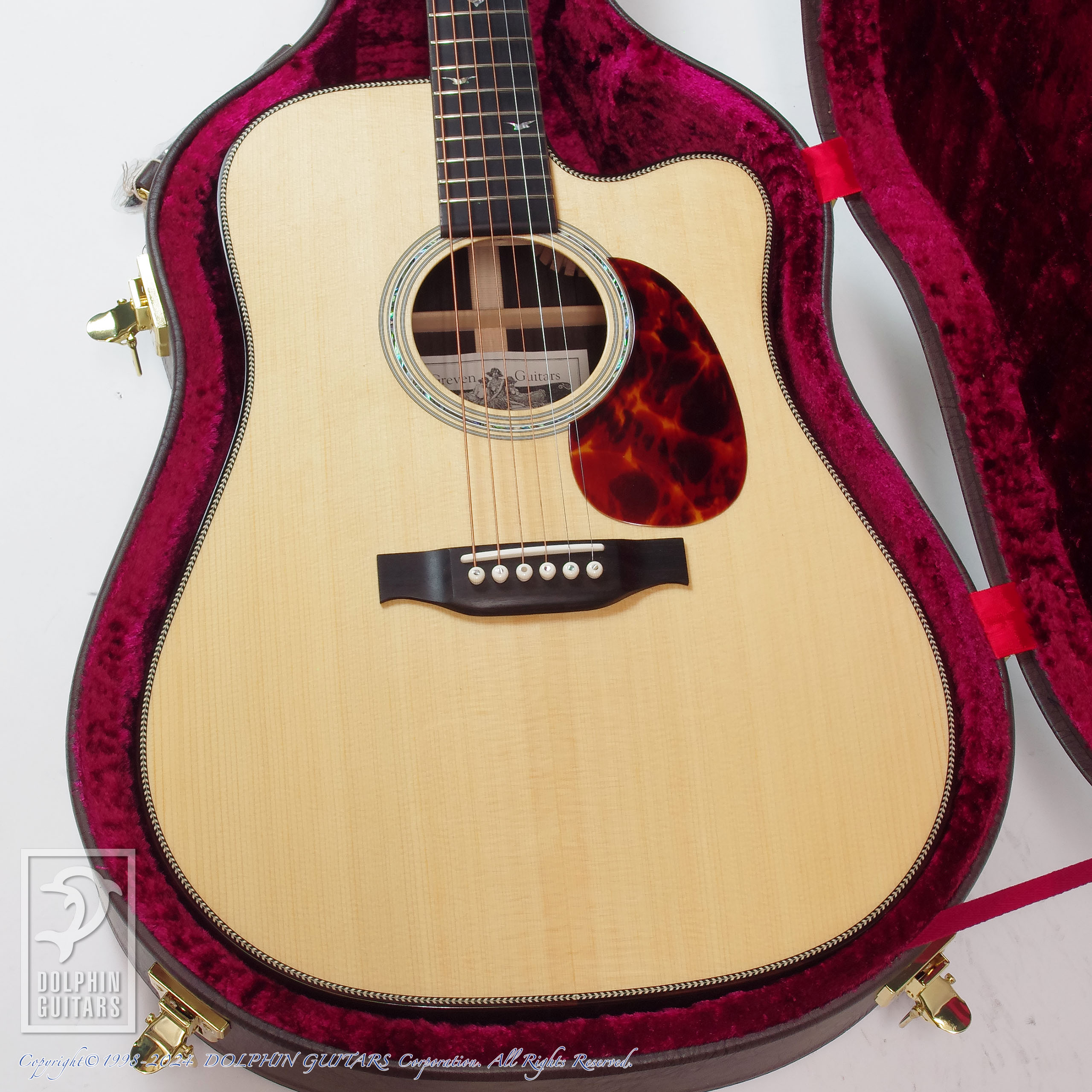 その他:44,5mmナット幅、645mmスケール、アバロンロゼッタ、ヘリンボーントリム、ベネチアン カッタウェイ、ラッカーハイグロスフィニッシュ。