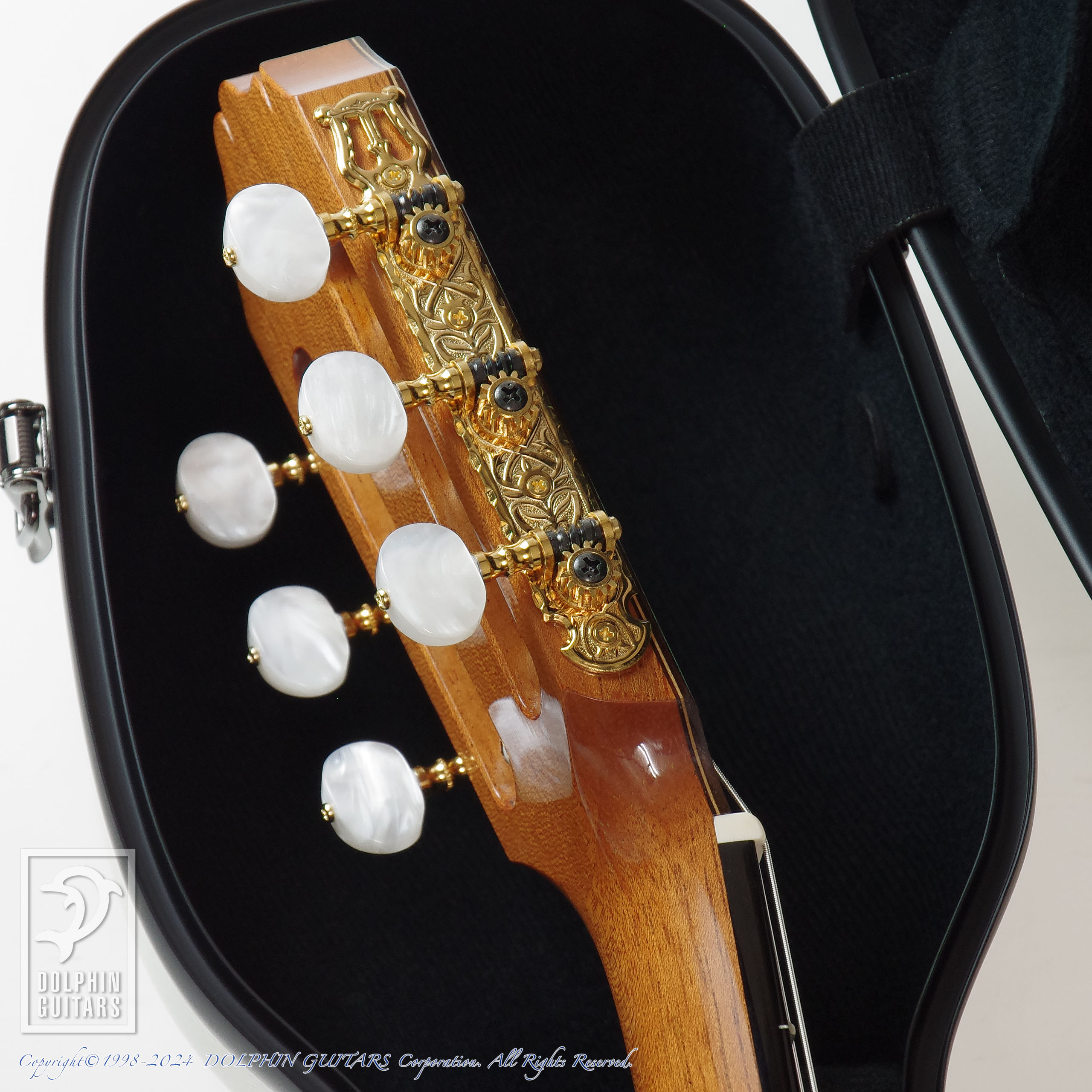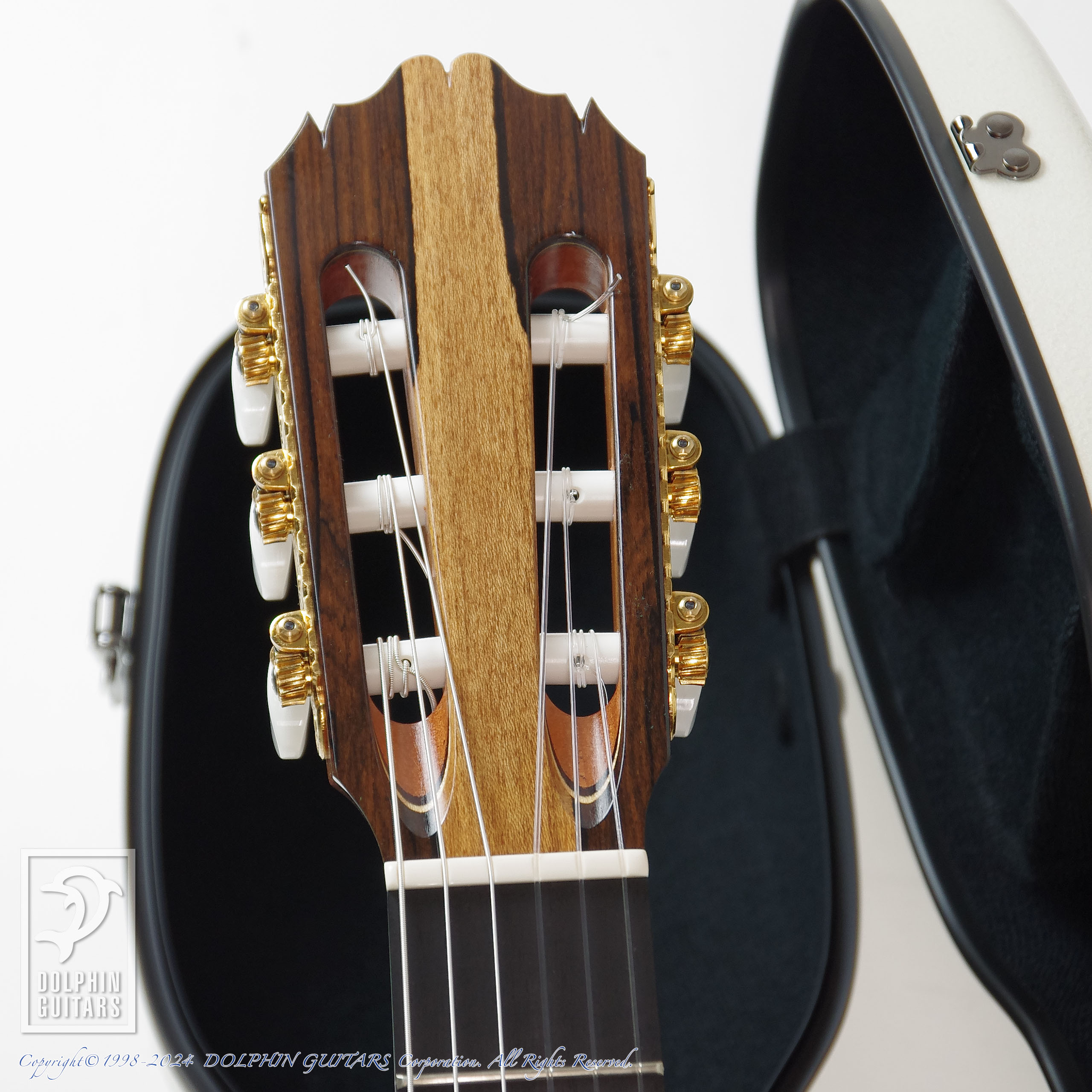 標準の塗装はカシューですが、今作ではオールラッカーのグロス仕上げにし、ヘッドプレートはセンターサップ有のジリコテ、サウンドホールロゼッタもカスタム仕様にするなど、モダンなナイロン弦ギターとなっております。