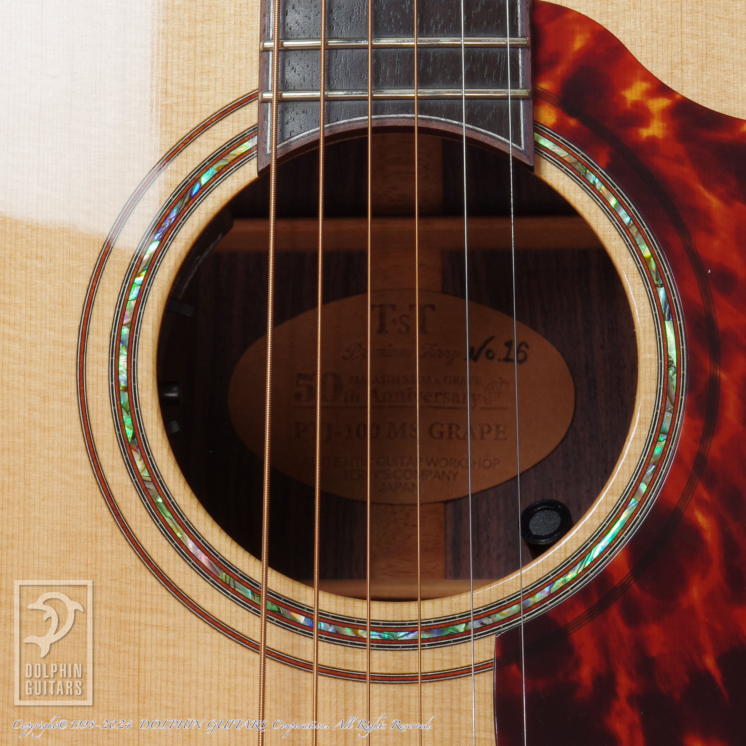 本器は華やかなグレープのインレイと、随所に施された“グレープ”デビュー50周年を祝うロゴが映えるオリジナル・ジャンボサイズのPremium Terry PTJ-100 MS GRAPE。上質な木材を使用し、国内の職人が丹念に組み込んだ特別なモデル。