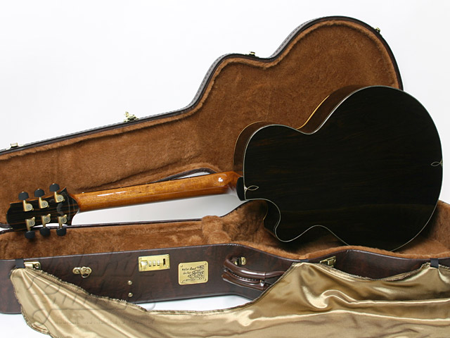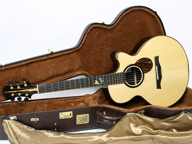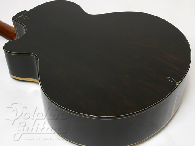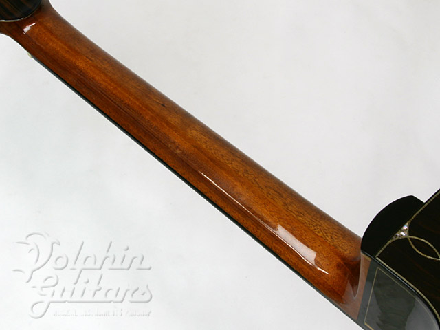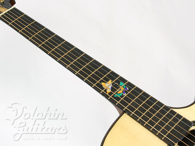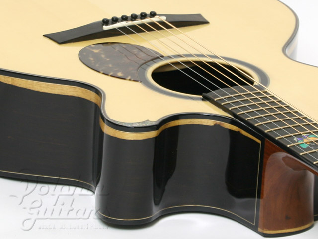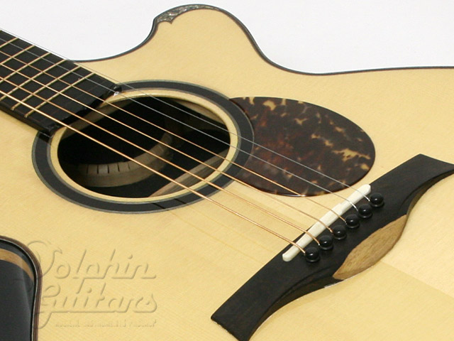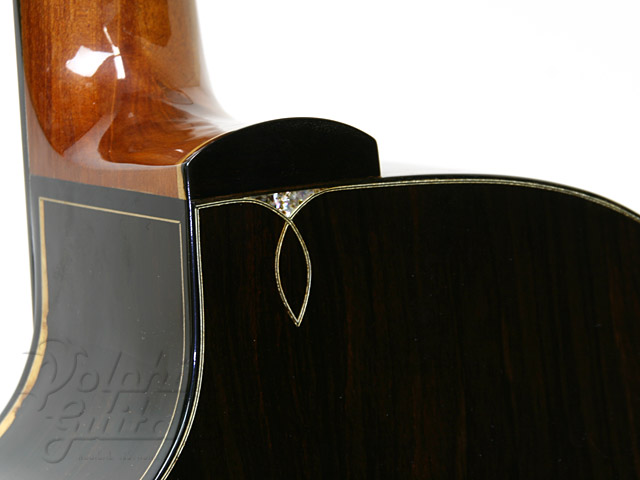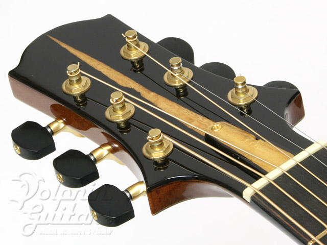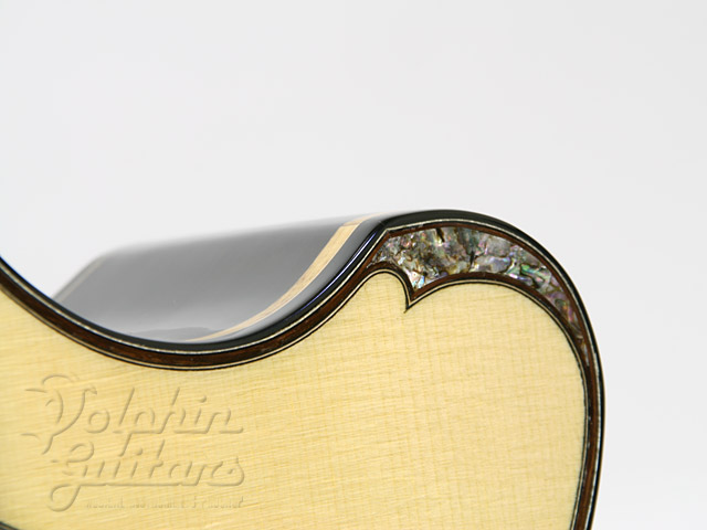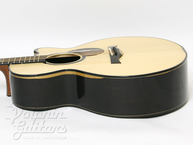均整のとれた美しいジャーマン・スプルースをトップに、サイド&バック、ブリッジ、ヘッド付き板にサップの入ったアフリカン・ブラックウッドを使用。