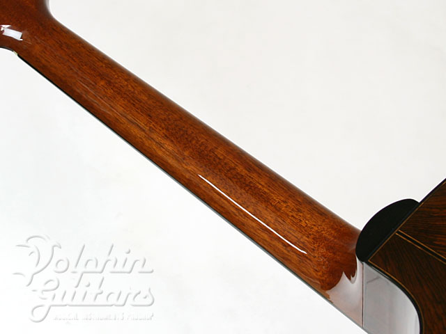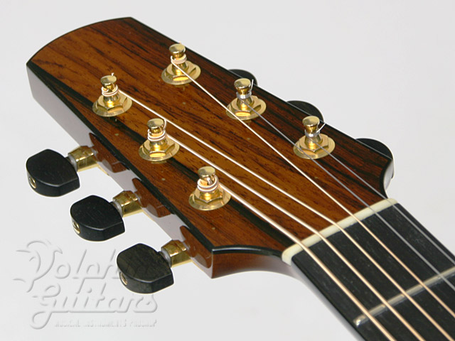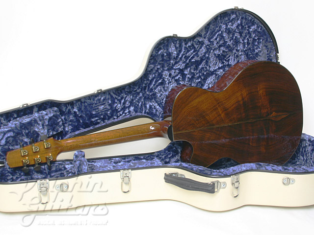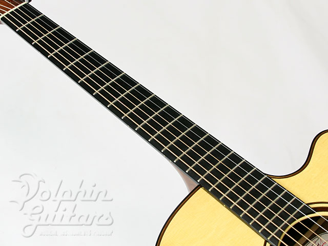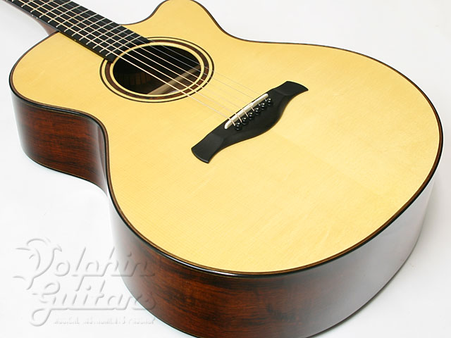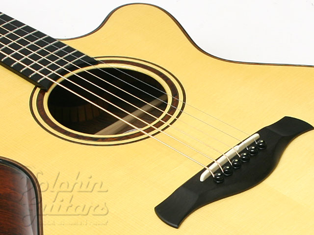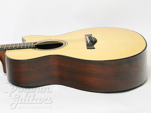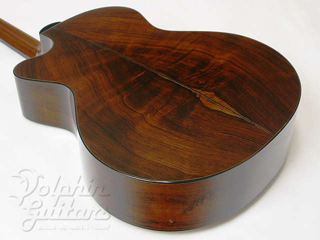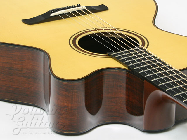 トップには均整のとれた美しい木目のジャーマン・スプルース、サイド&バックにはフィギャードの入ったハカランダを贅沢に使用、エボニー指板&駒、マホガニー・ネック、カッタウェイ。
