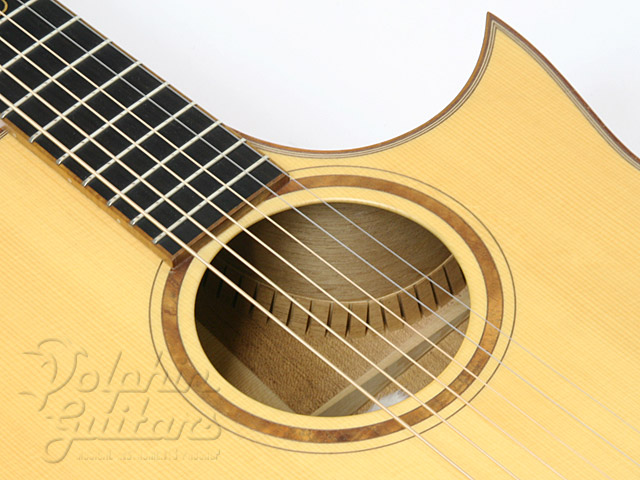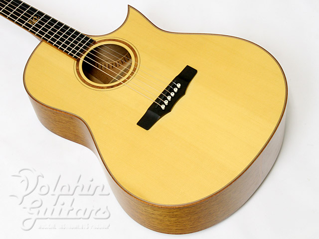 シトカ・スプルース・トップ、マホガニー・サイド&バック、スキャロップド・ブレイシング(バック-Xブレイシング)、エボニー指板&駒、ラウンドバック、フローレンタイン・カッタウェイ、カーリー・コアウッド・バインディング、シルク・フラット・フィニッシュ、カーボン・ナット&サドル、ゴトー・オープンバック糸巻き。