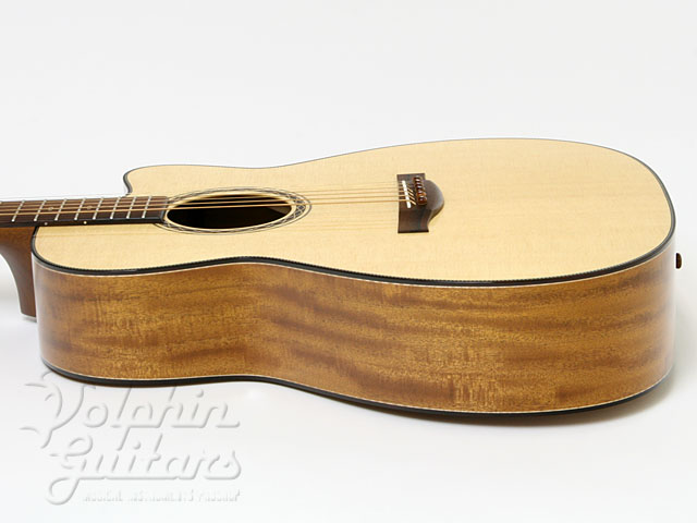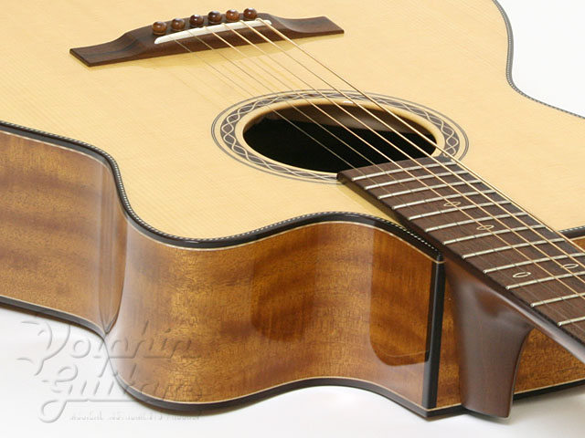 本器はシトカ・スプルース、キルテッド・マホガニー・サイド、キルテッド・マホガニー・&ジリコーテ3ピースバック、マダガスカル・ローズウッド指板、カッタウェイ仕様の1本。