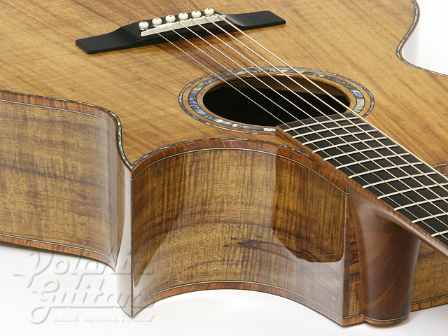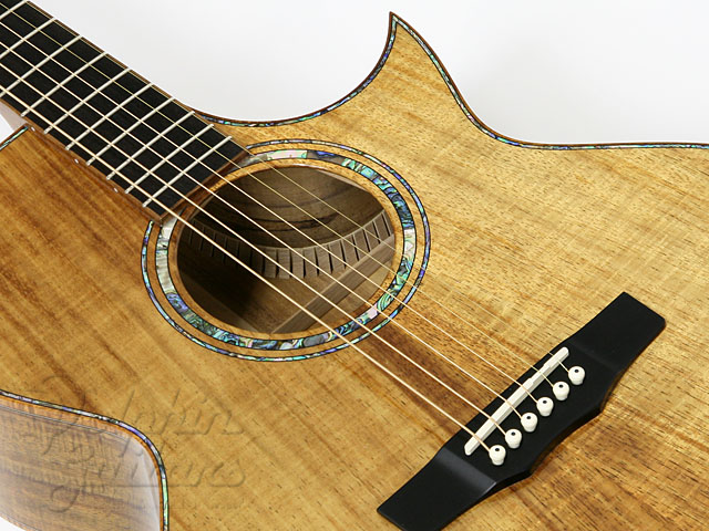 ボディにはセレクトされた、美しい木目、マスターグレードのフィギャード・コアウッドを使用、マホガニー・ネック、エボニー指板&駒、フローレンタイン・カッタウェイ、アバロン・ロゼッタ。