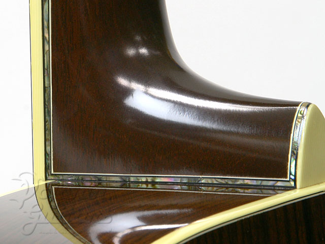 指板の豪華なインレイに加え、ピックガードは塗装塗りこみのフローラル・ピックガード・インレイ、ネックサイド、ヘッド・サイドにも贅沢に使われたソリッド・アバロン、10数年経過したトップは飴色に焼け、そのルックスには貫禄があります。