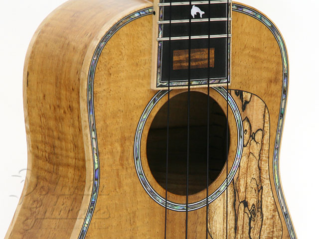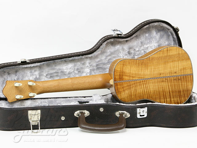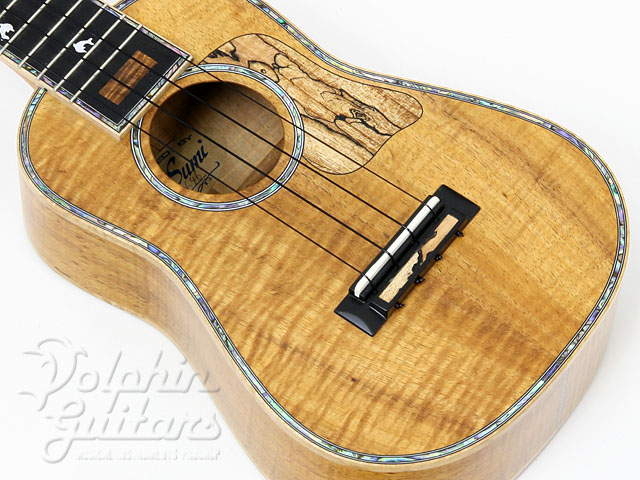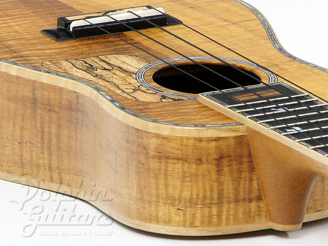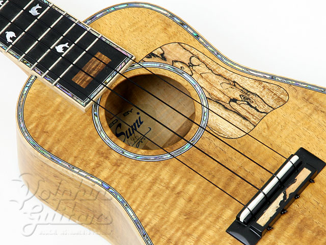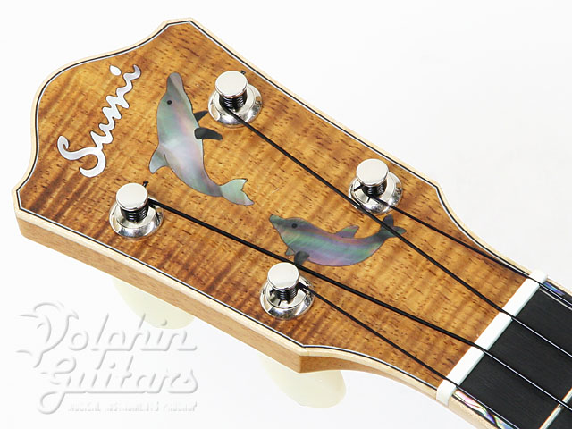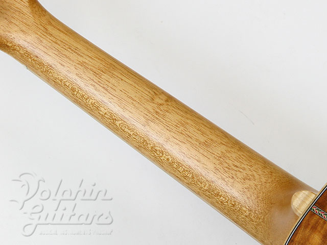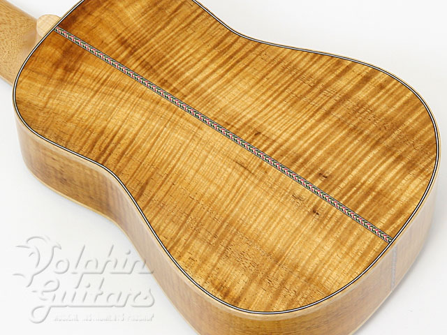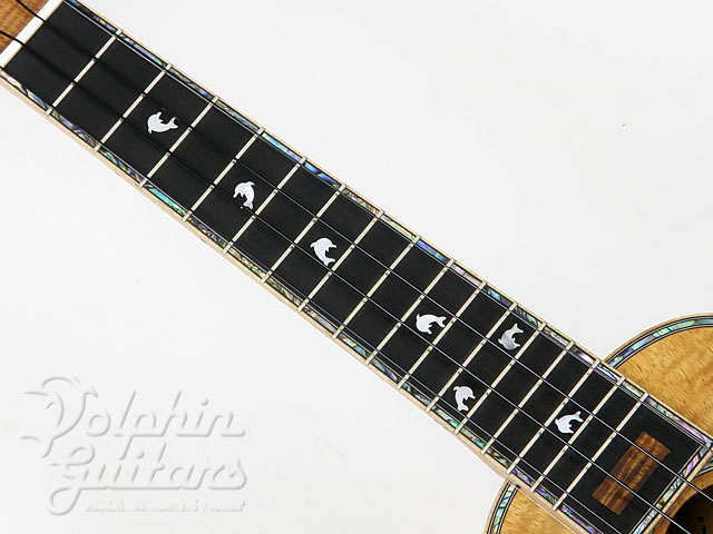 ボディには上質なフィギャード・コアウッドを使用、マホガニー・ネック、エボニー指板&駒、スポルテッド・メイプル・ピックガード、トップ・アバロン・ボーダー・インレイ、アバロン・ロゼッタ、指板インレイには当店のロゴマークを、ヘッド・インレイには2頭のイルカがダイブする様を表現しております。