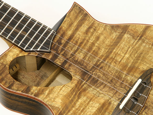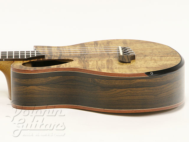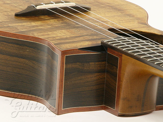 コアウッド(3Aグレード)・トップ&バック、ジリコーテ・サイド、ホンジュラス・マホガニー・ネック(センター・ウォルナット)、サイド・サウンドホール、コンター加工、ジリコーテ指板&駒、シングル・スロテッドヘッド、象牙ナット&サドル、糸巻きには世界最小、最軽量の超小型ペグGotoh製のstealthを搭載。