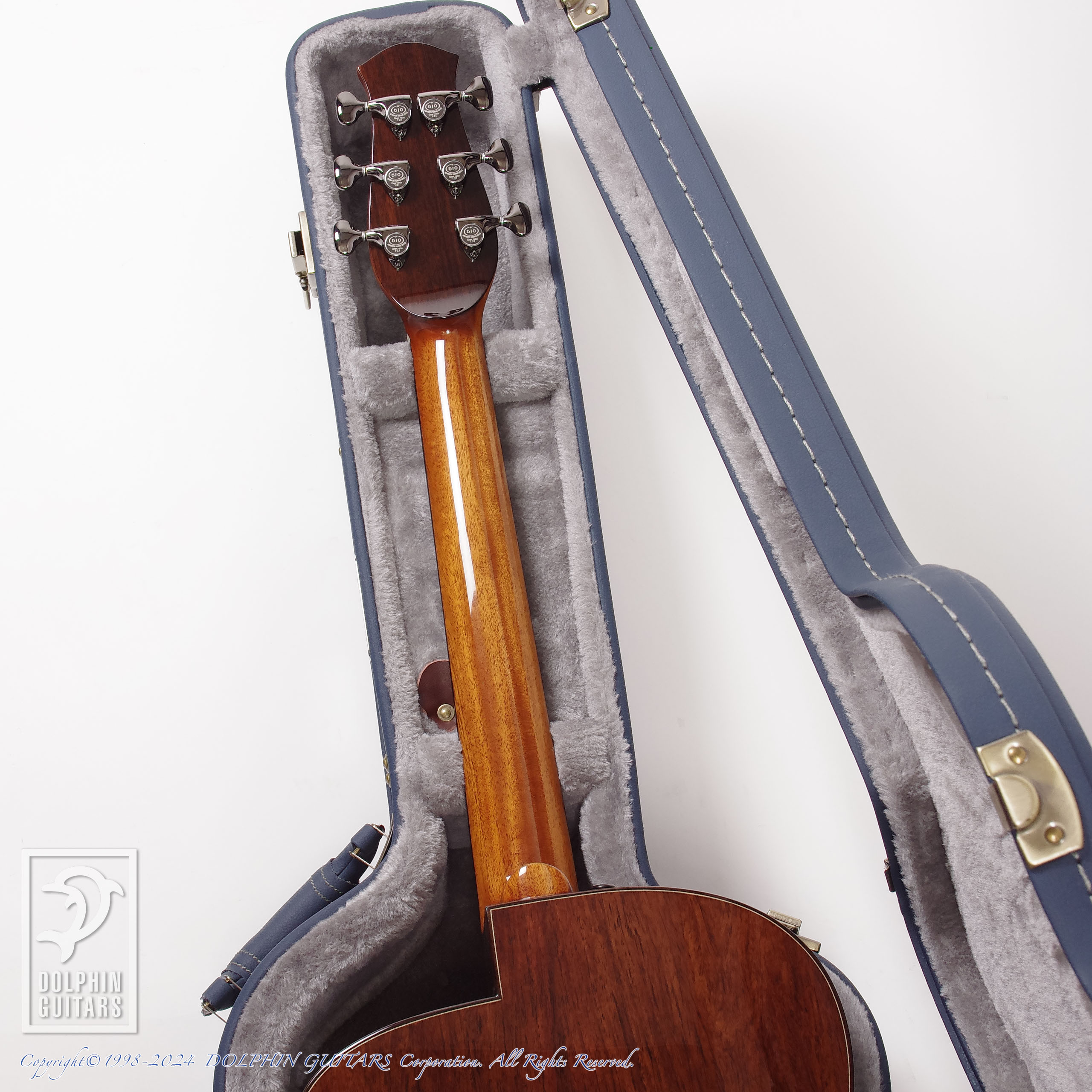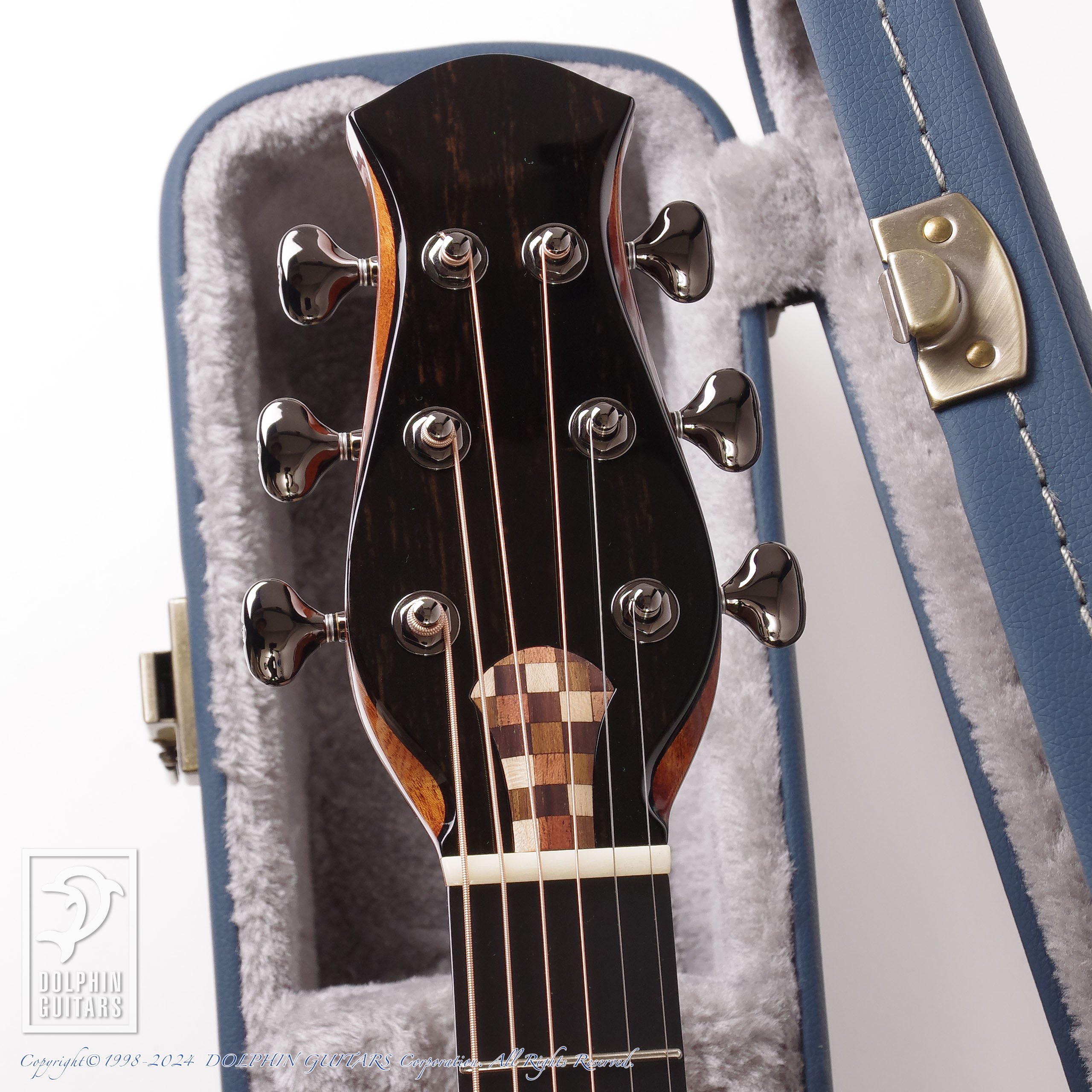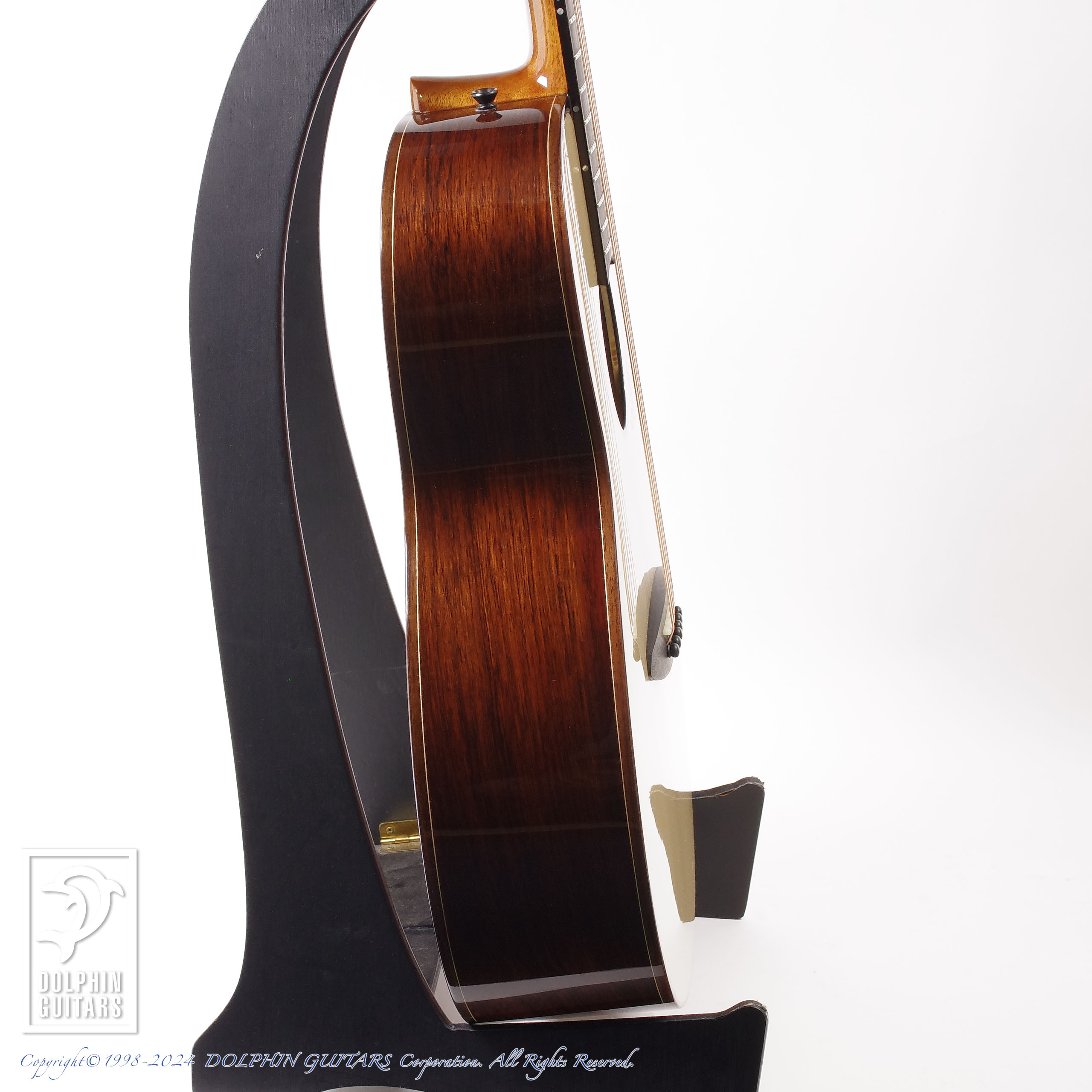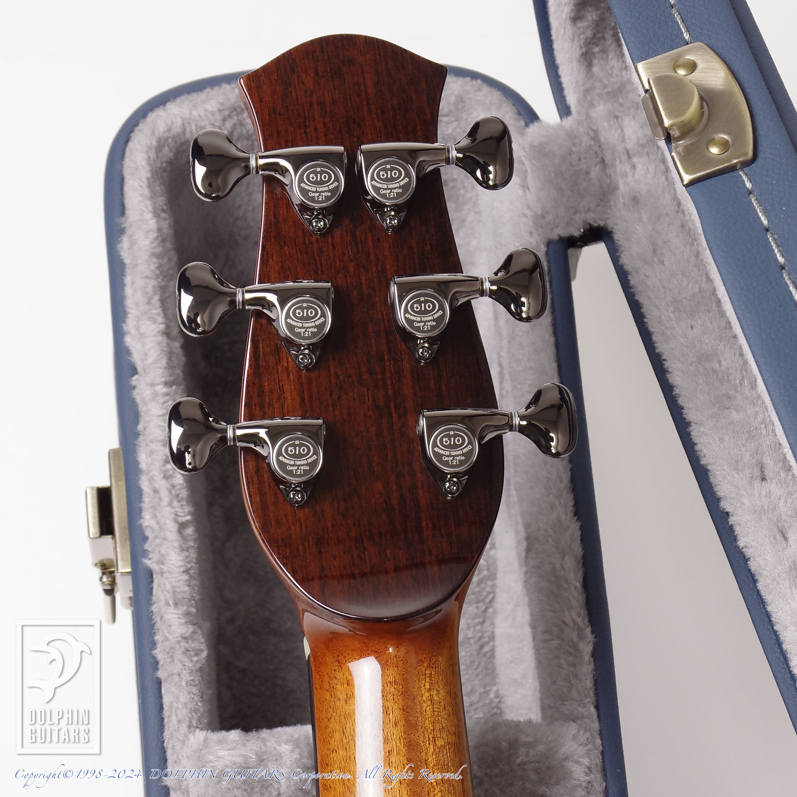 同メーカーのラインナップの中でも珍しいマダガスカルローズウッドをサイド&バックに使用し、トップ材にはムーンスプルースにノンスキャロップのXブレイシング。タイトでクリアなサウンドを聴かせます。杉田健司氏の設計するによるボディ全体を鳴らすようなサウンドメイクに、やや厚胴のOMボディからはタイトさも感じさせつつ、低音から高音まで厚みがあり、ストロークでのプレイはもちろん、フィンガースタイルでの演奏に誂え向きです。