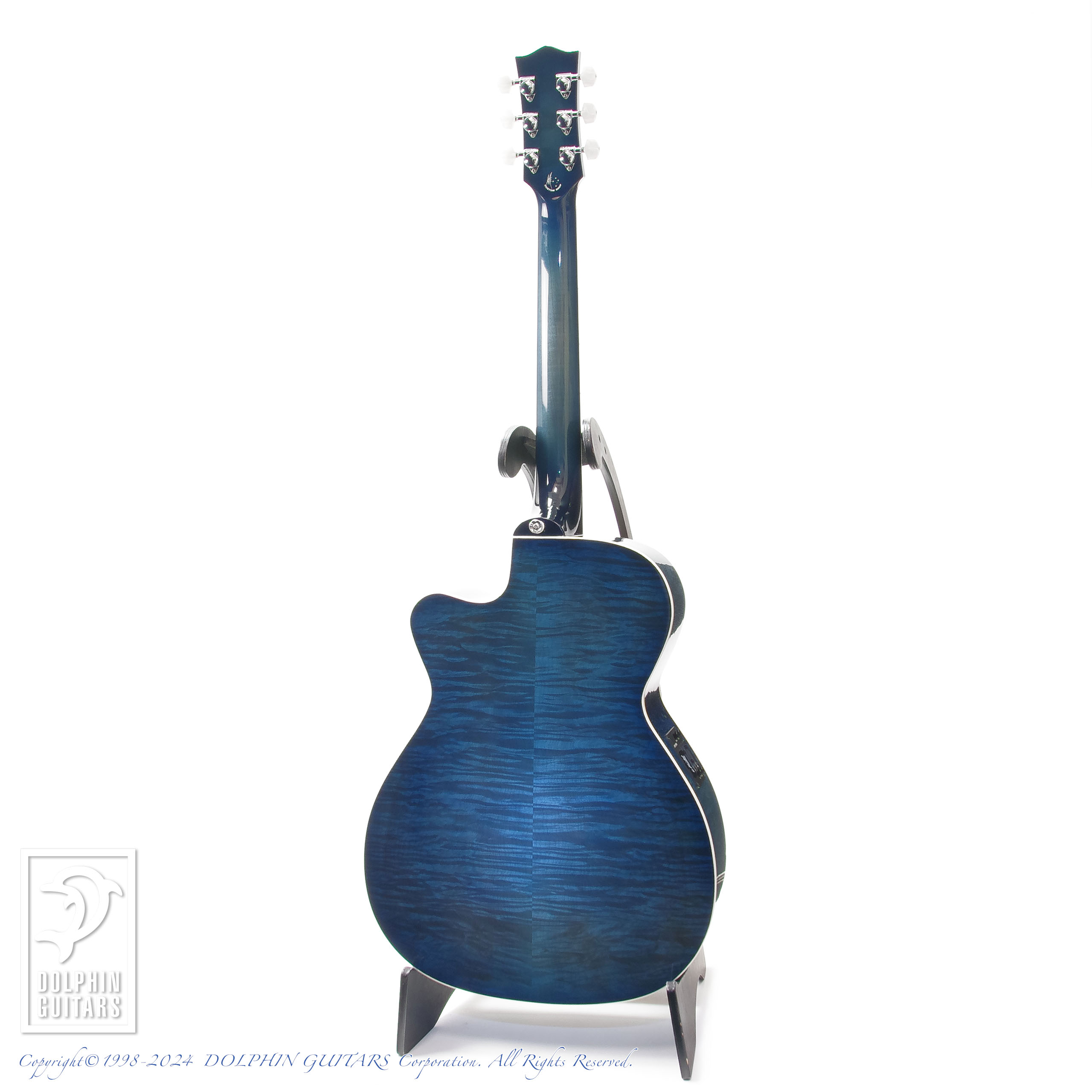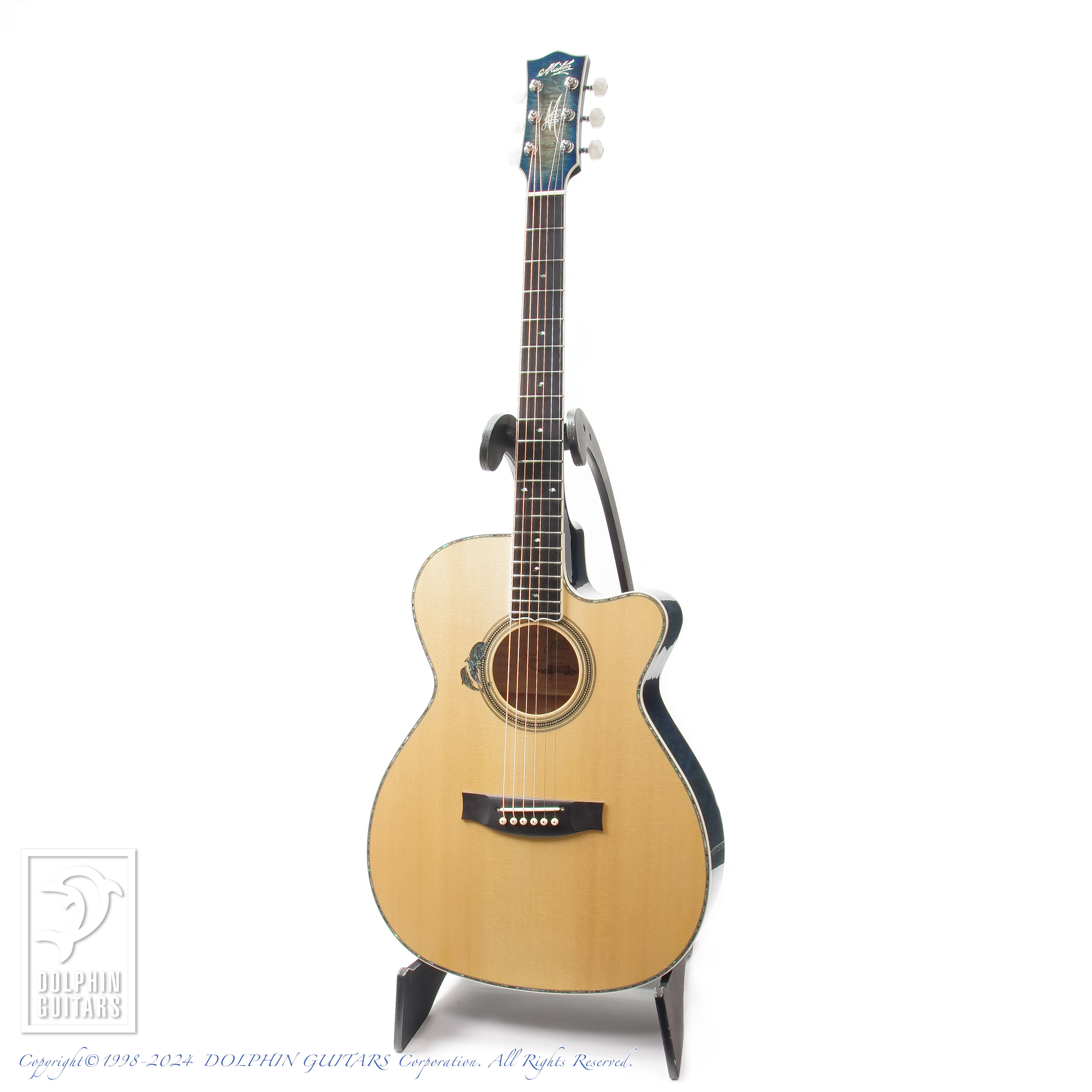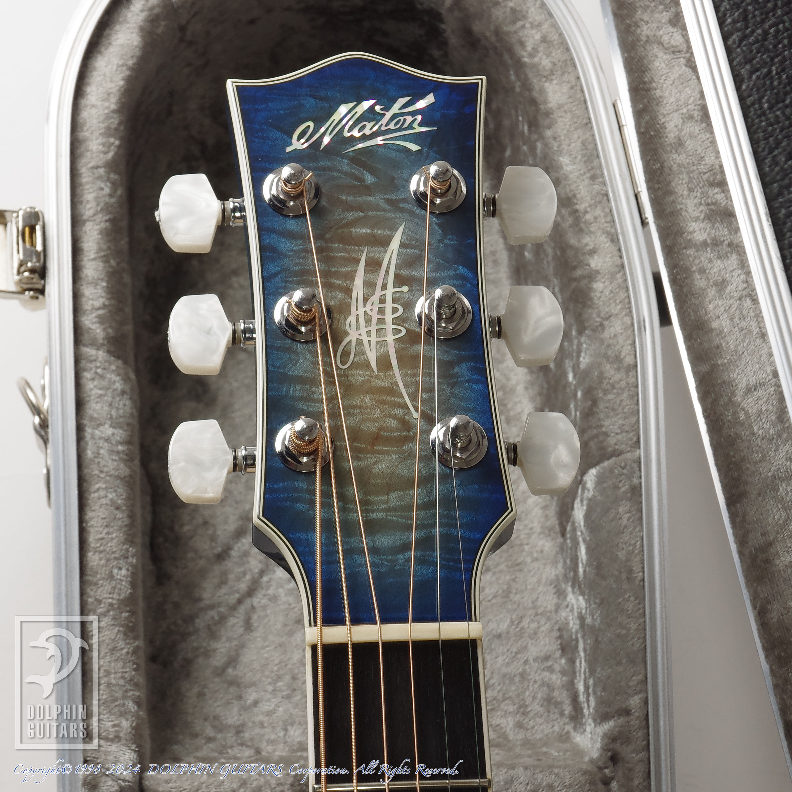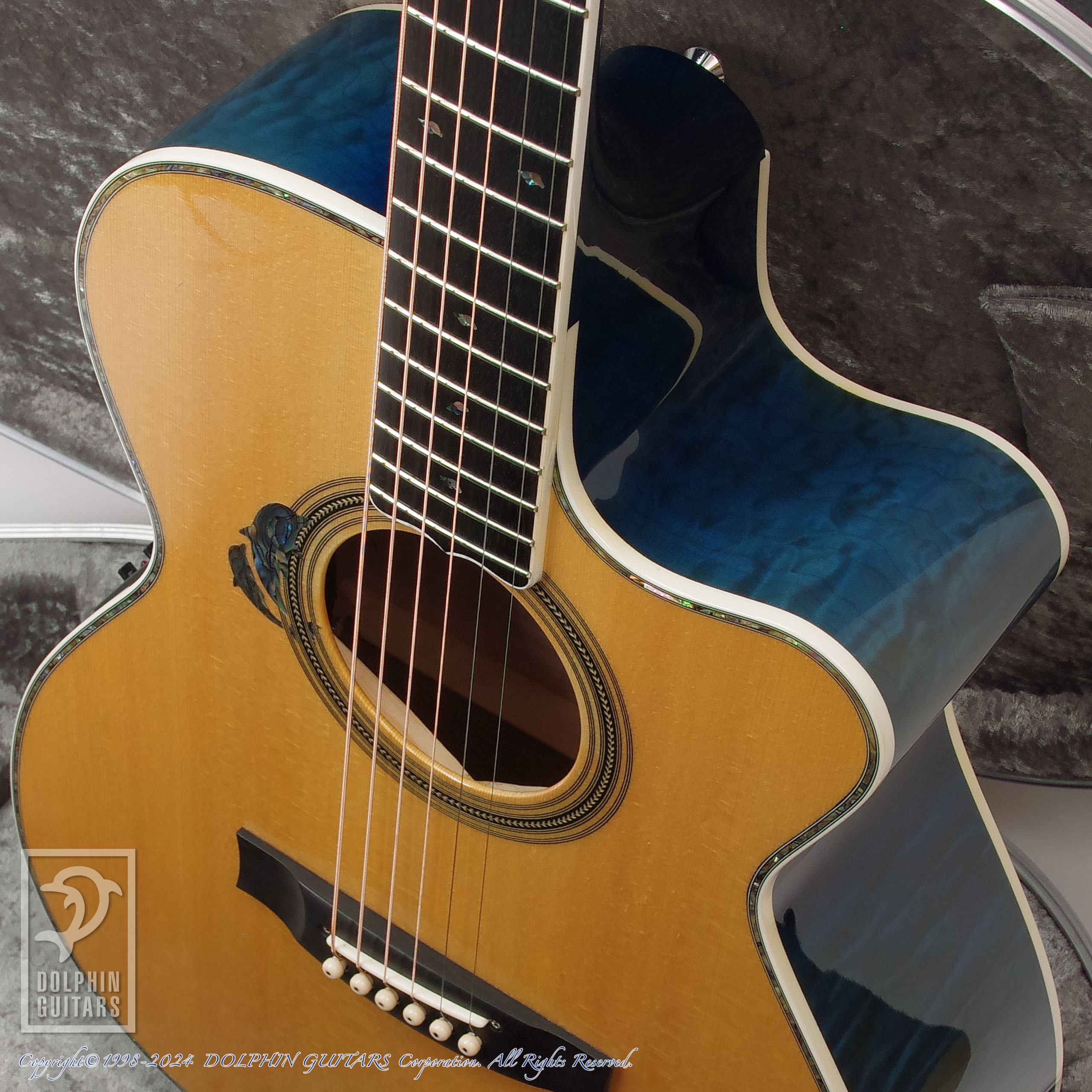 伝説のアトランティスをイメージし、深いブルーバーストに仕上げたヘッドやボディは、キルテッドメイプルの立体的な杢が美しく、サウンドホールロゼッタから飛び出してくるようなドルフィンインレイと、ドルフィンギターズをモチーフにデザインされたものであります。ロゼッタの様式はイルカのご馳走でもある、ニシンの骨を象ったヘリンボーンという最高に洒落たアイデアです。