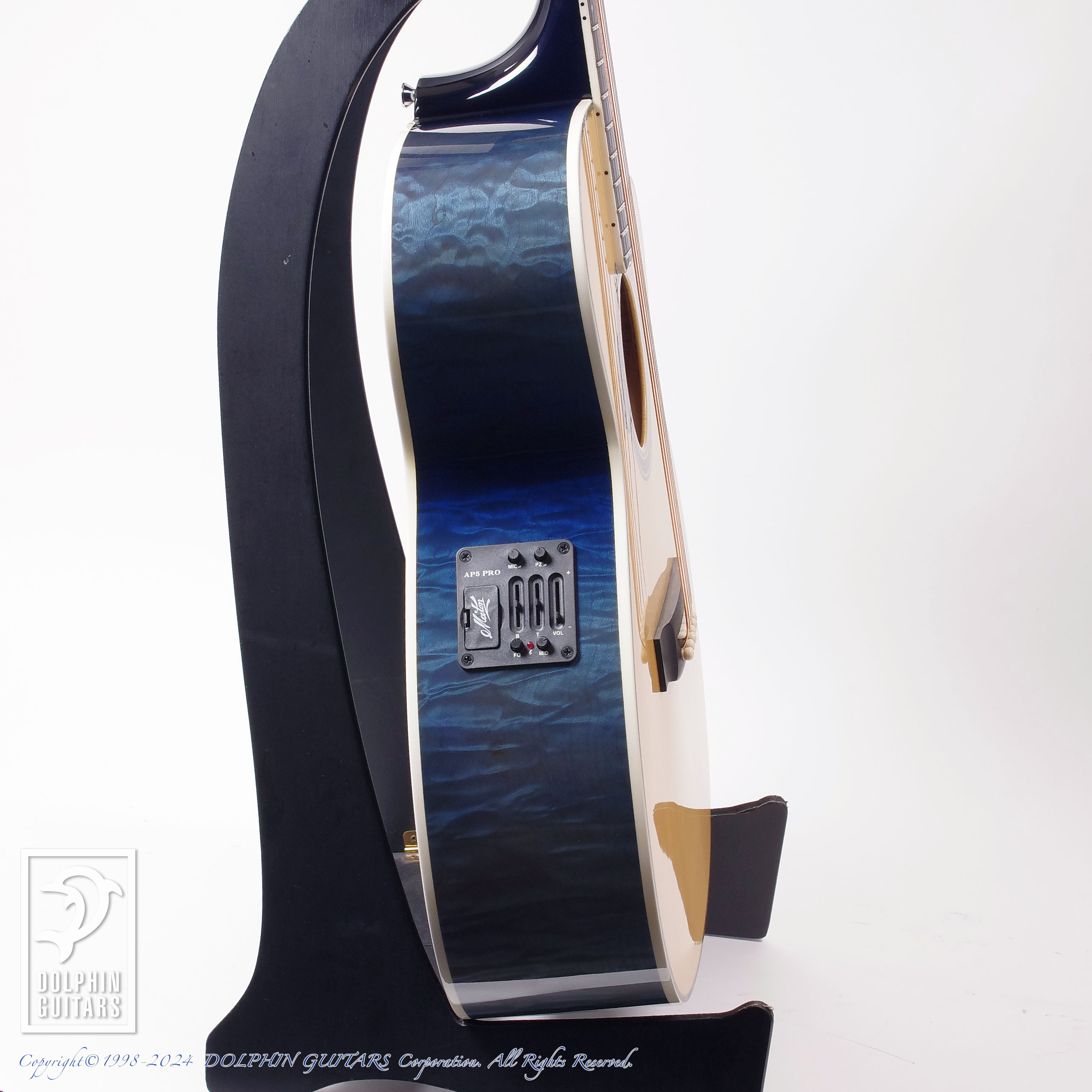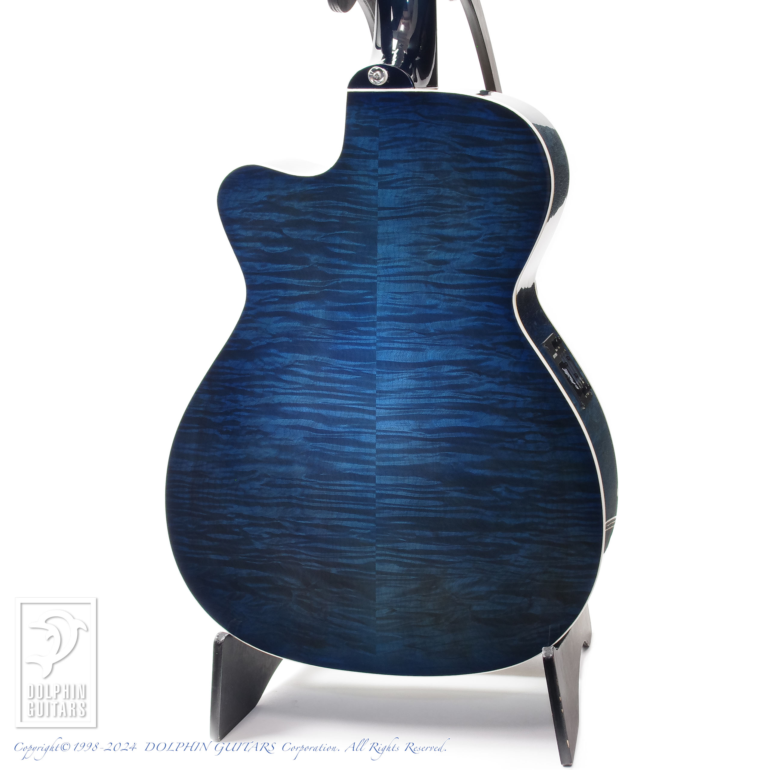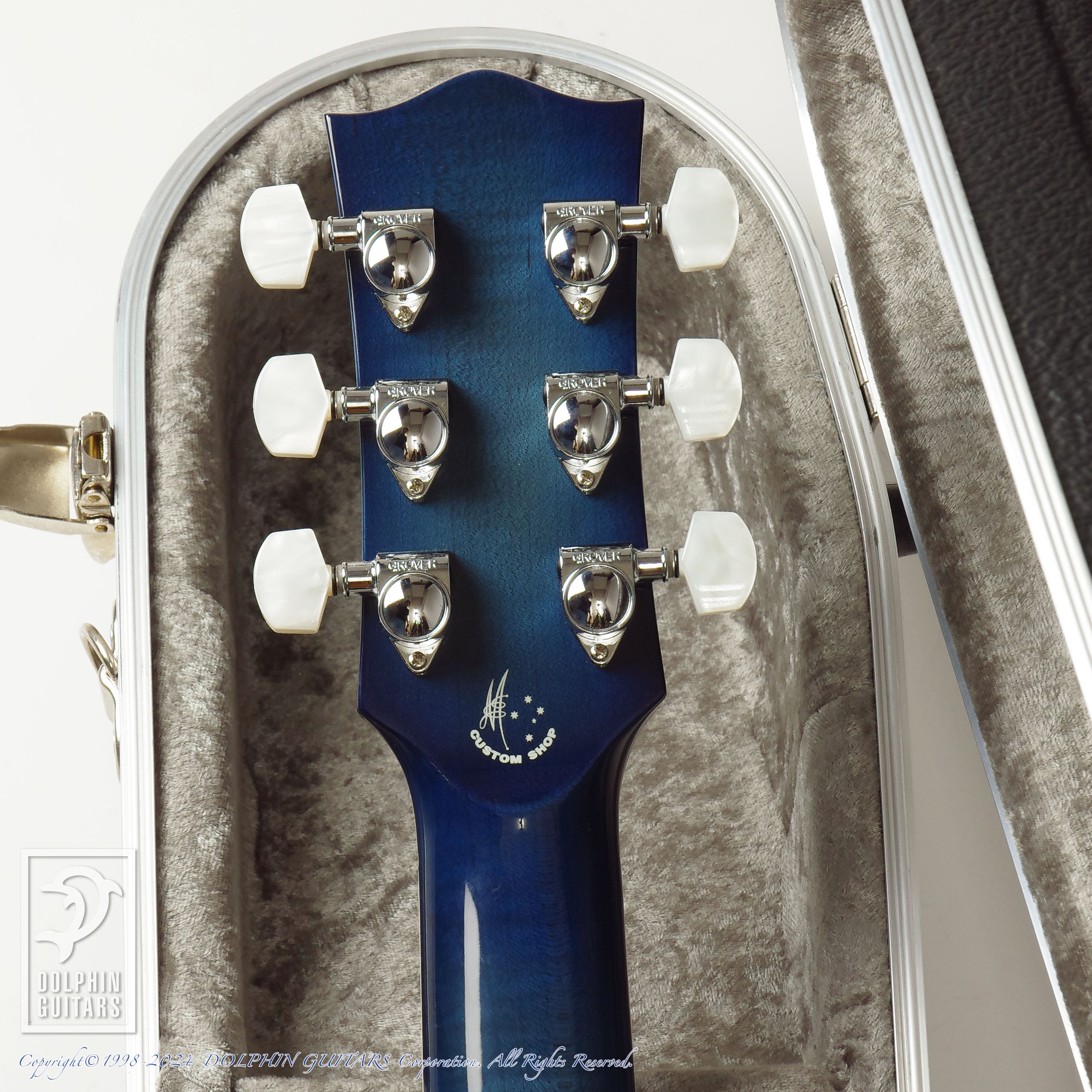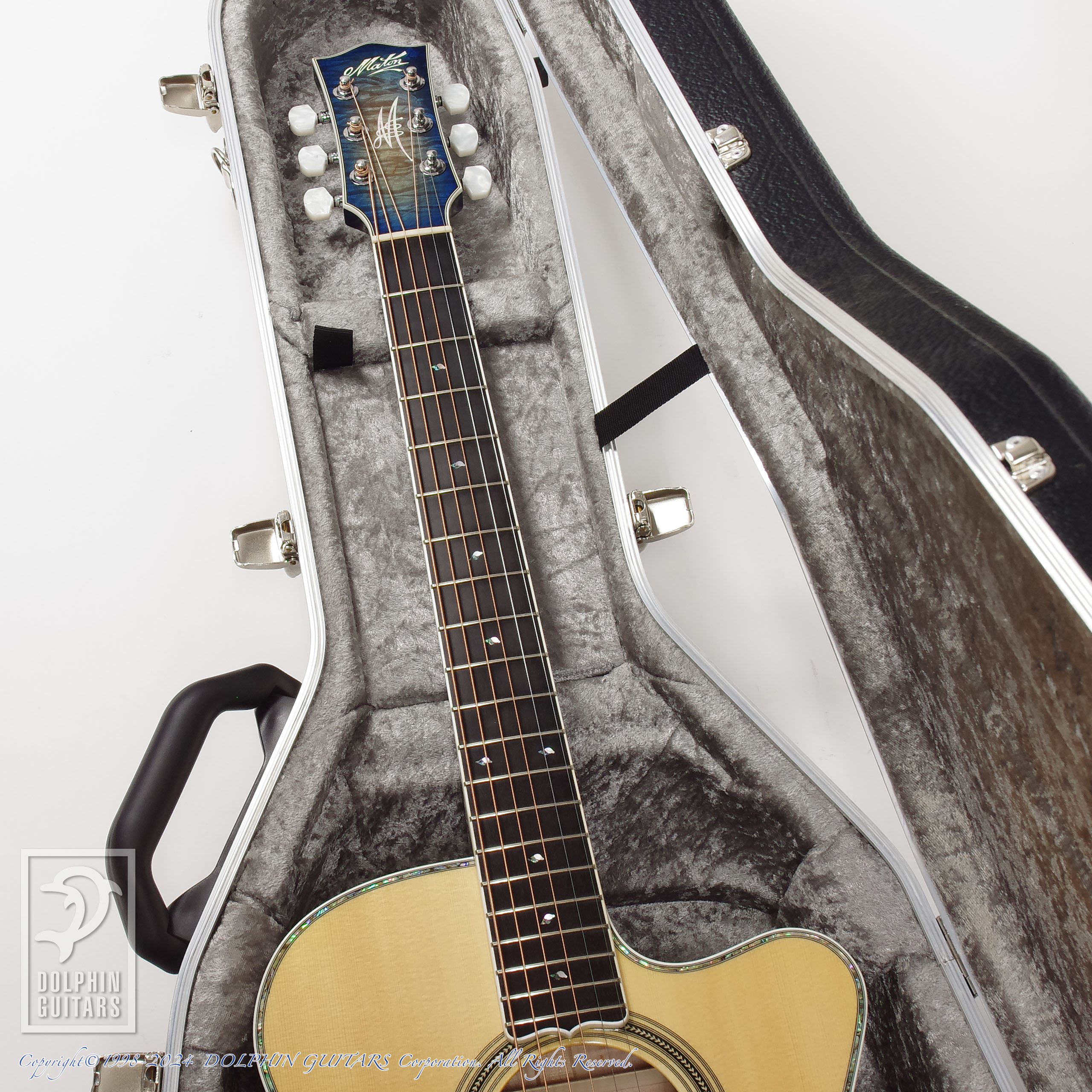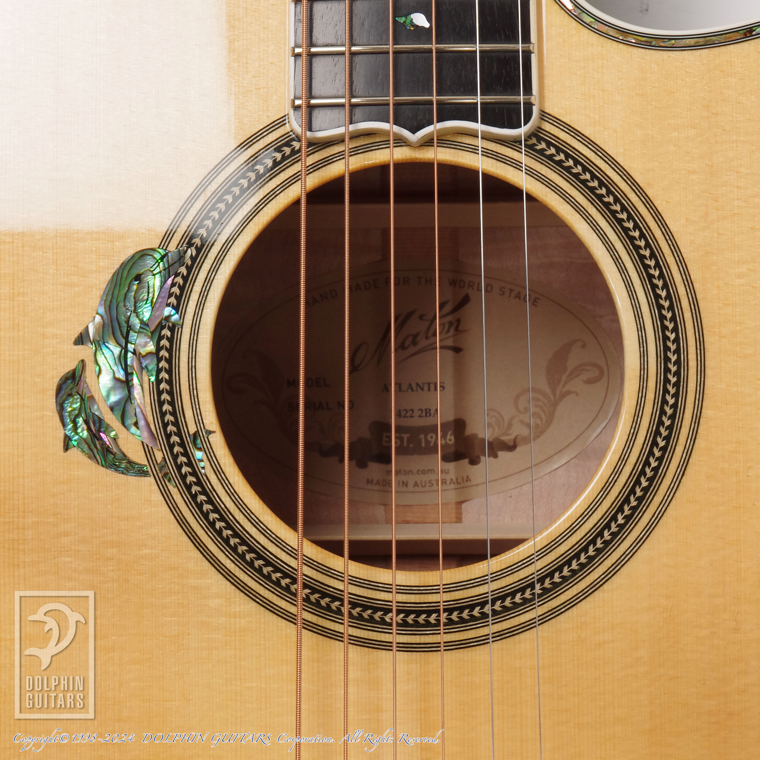 伝説のアトランティスをイメージし、深いブルーバーストに仕上げたヘッドやボディは、キルテッドメイプルの立体的な杢が美しく、サウンドホールロゼッタから飛び出してくるようなドルフィンインレイと、ドルフィンギターズをモチーフにデザインされたものであります。ロゼッタの様式はイルカのご馳走でもある、ニシンの骨を象ったヘリンボーンという最高に洒落たアイデアです。