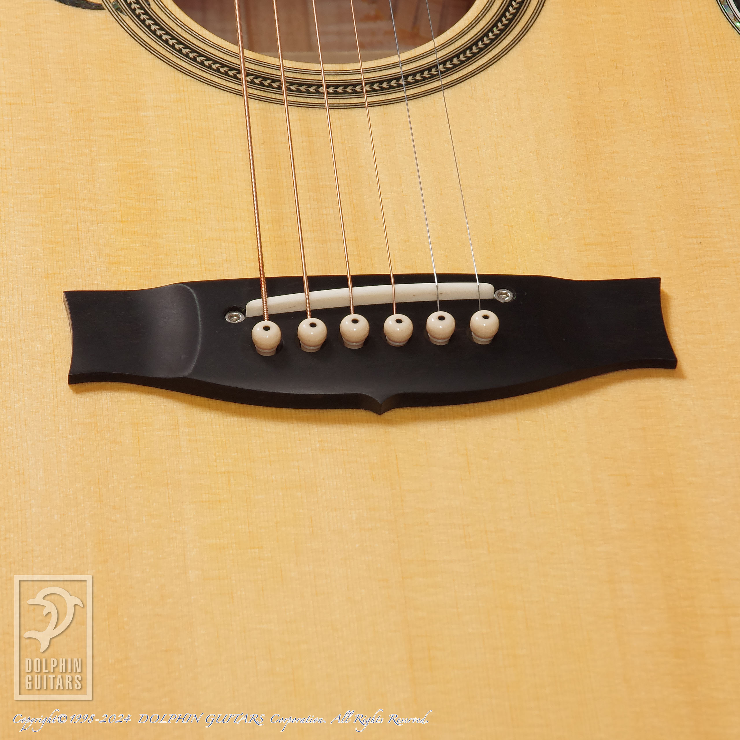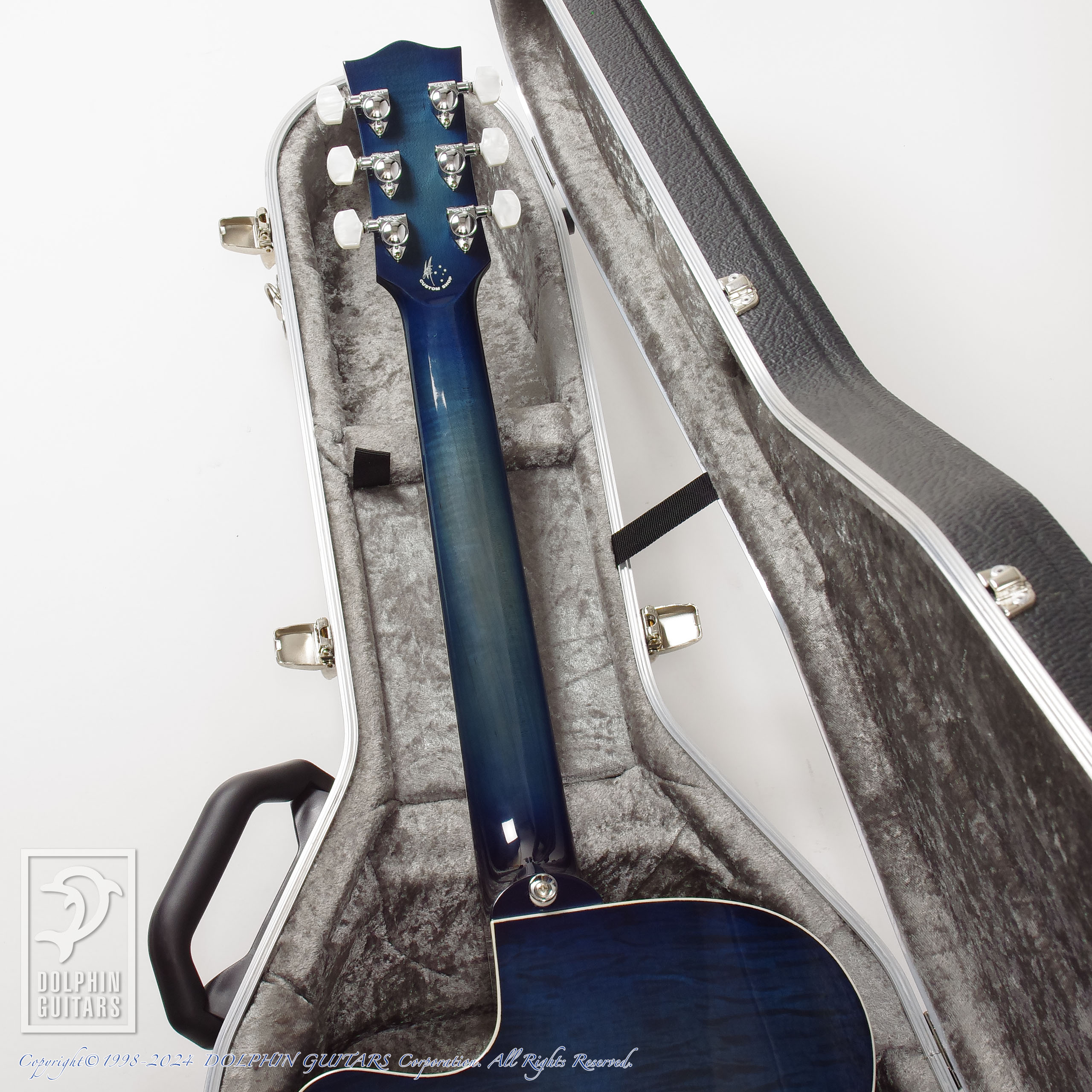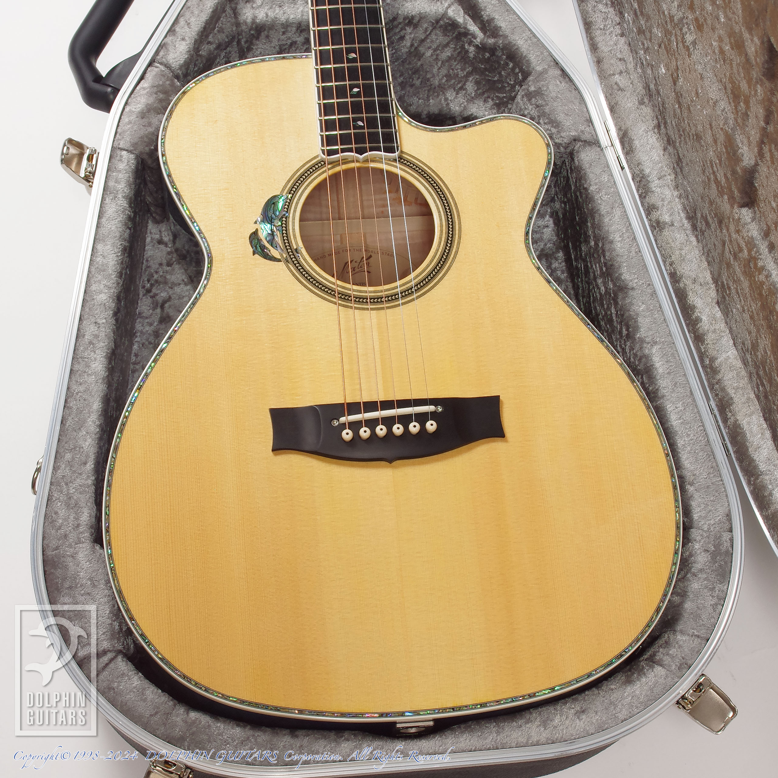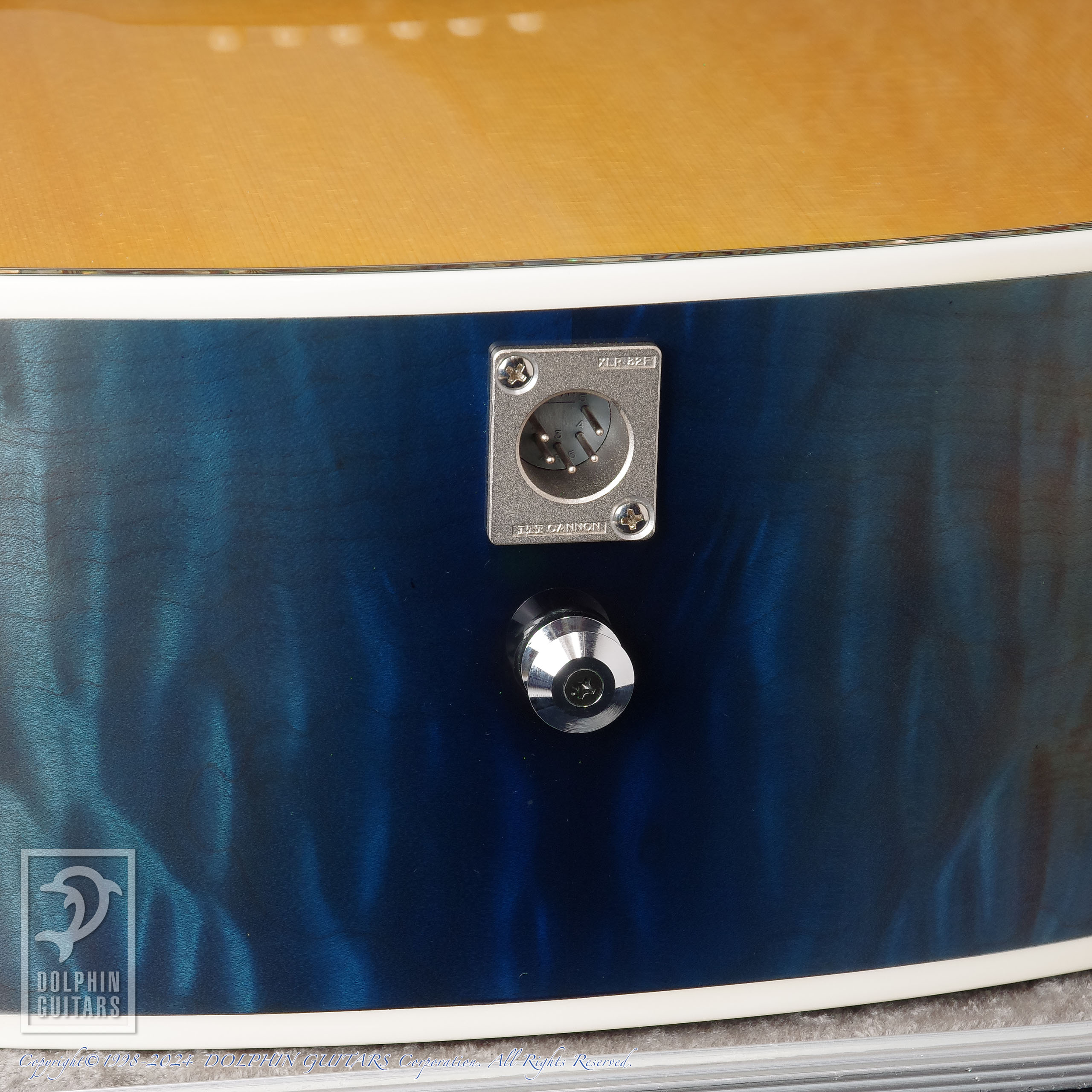 伝説のアトランティスをイメージし、深いブルーバーストに仕上げたヘッドやボディは、キルテッドメイプルの立体的な杢が美しく、サウンドホールロゼッタから飛び出してくるようなドルフィンインレイと、ドルフィンギターズをモチーフにデザインされたものであります。ロゼッタの様式はイルカのご馳走でもある、ニシンの骨を象ったヘリンボーンという最高に洒落たアイデアです。