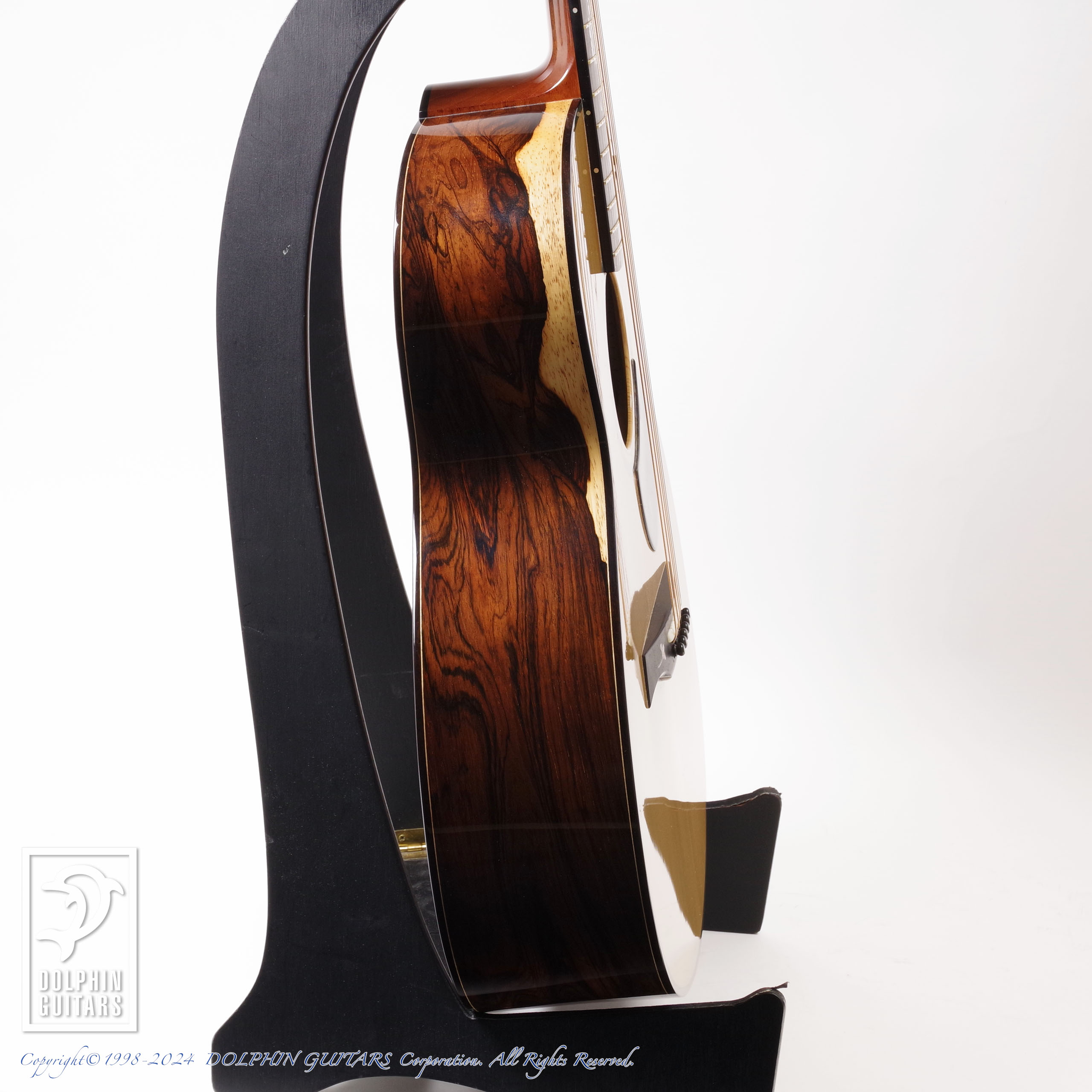 このサイズにしてラージボディにも引けを取らない迫力あるサウンドを奏でており、色気や深み、表現力の高さも絶品な個体であります。レギュラーチューニングの演奏はもちろんオープンチューニング時の音色の美しさも格別です。ジャーマンスプルースとハカランダの組み合わせを増田氏によって上手く表現された素晴らしいサウンドであります。