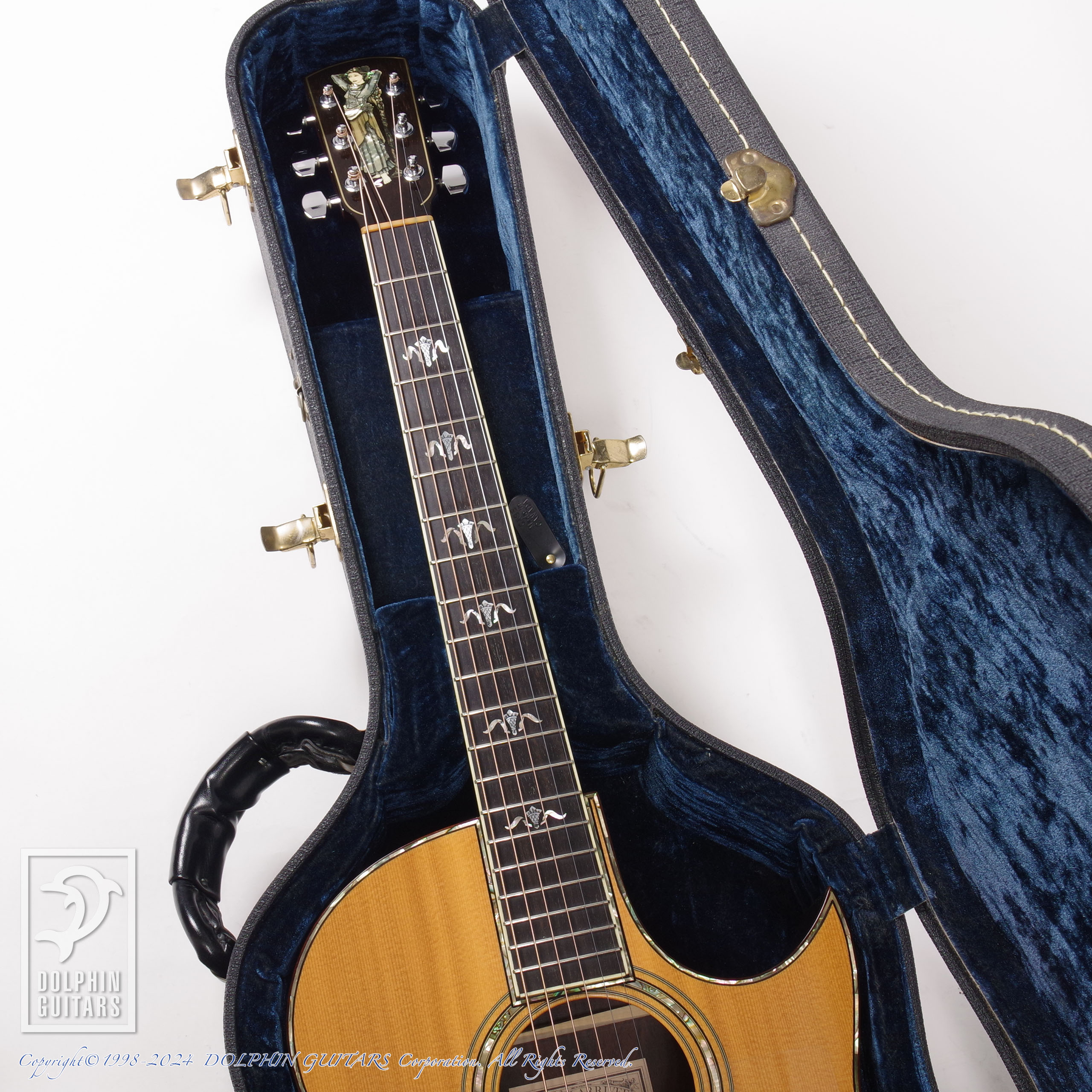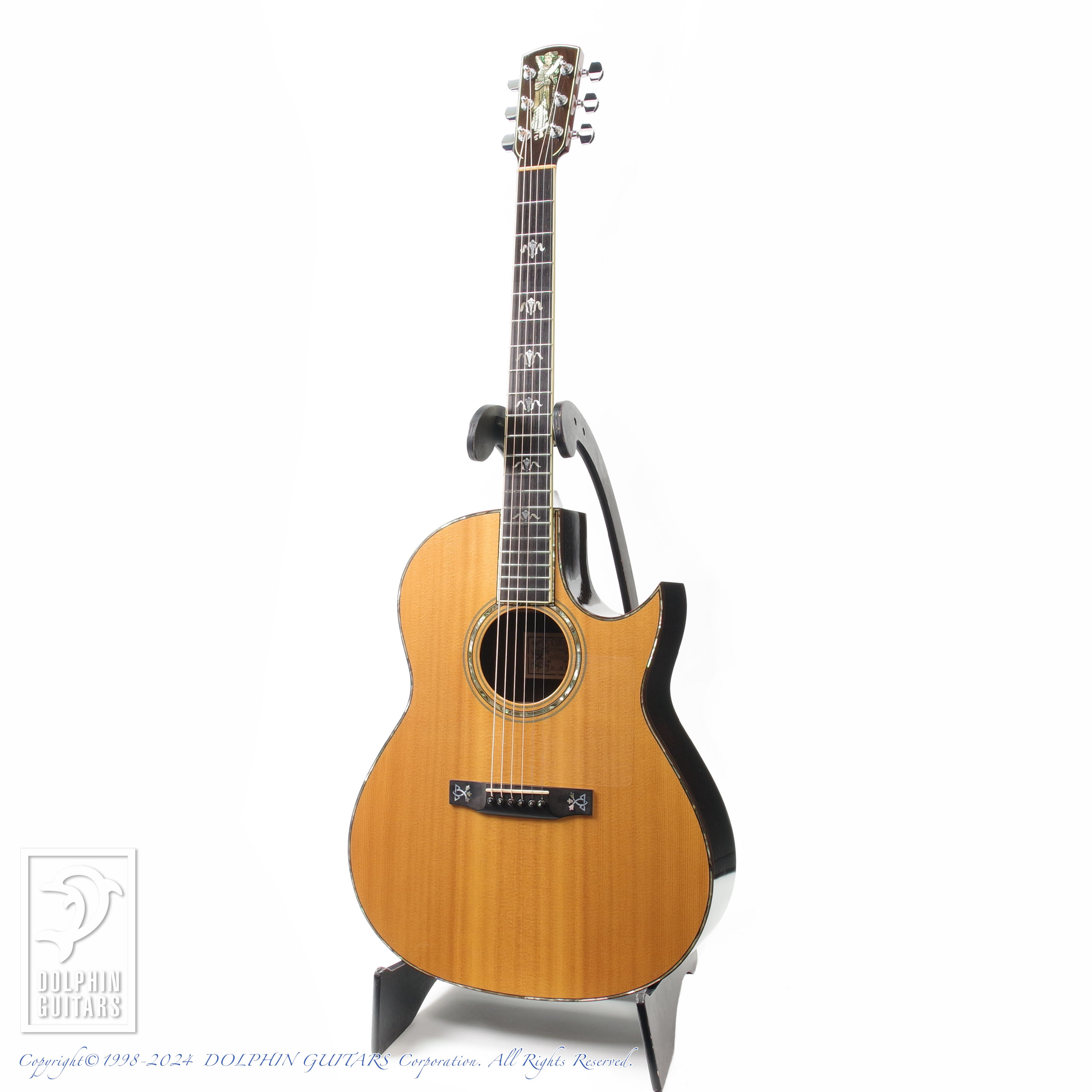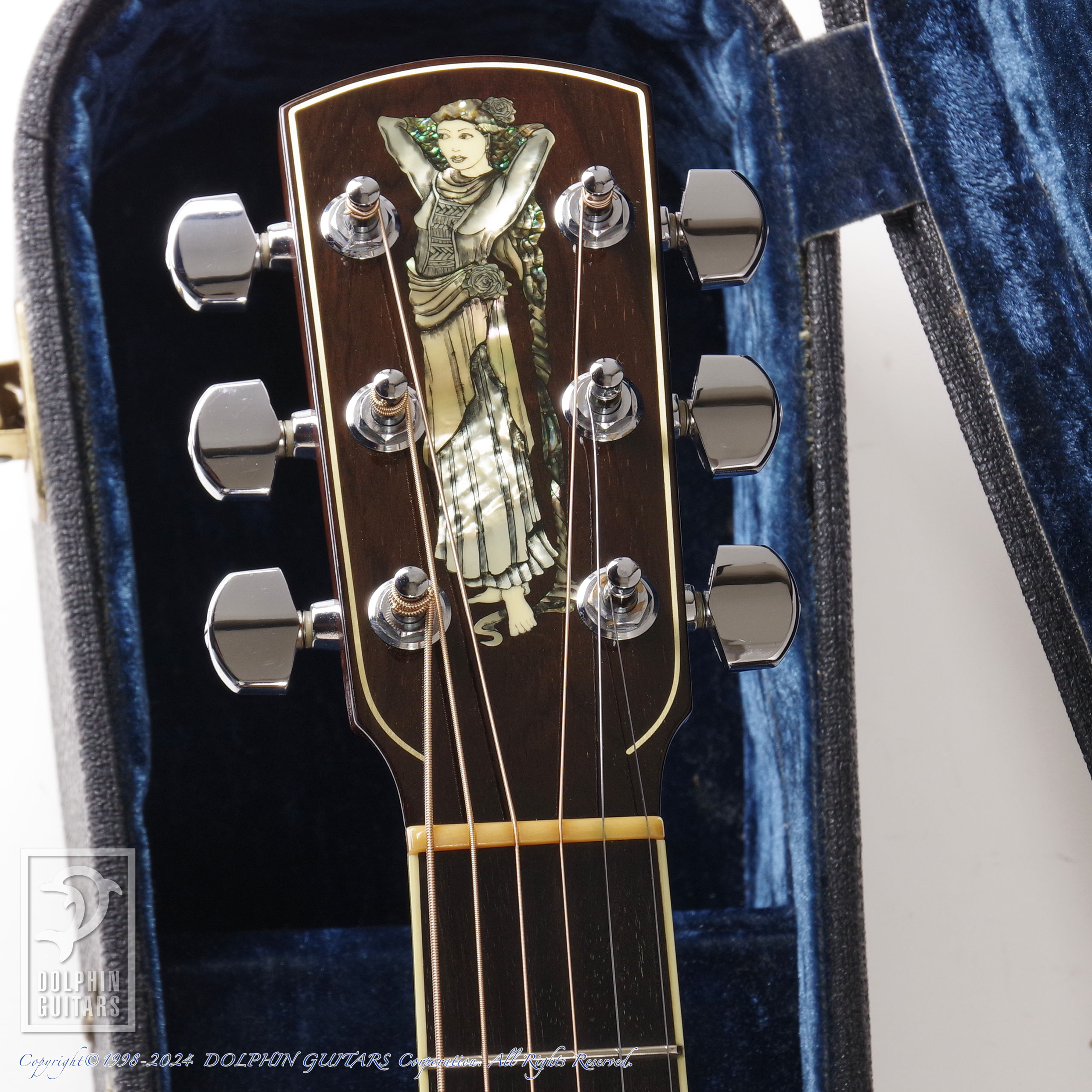 ヘッドの"ローズレディ"インレイ、指板のトーチインレイなど煌めくアバロンの散りばめられた美しい一本。