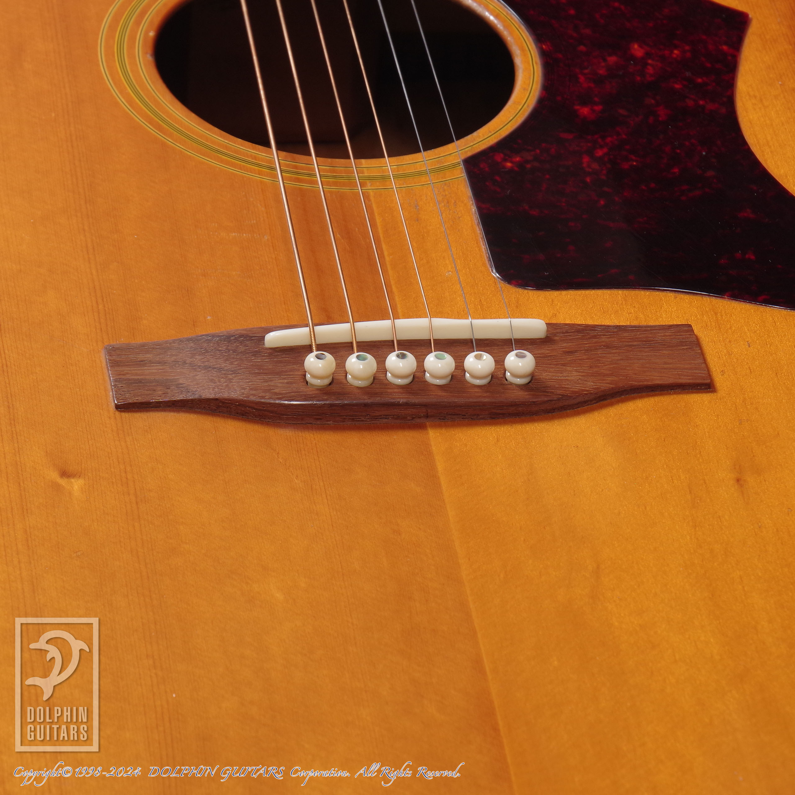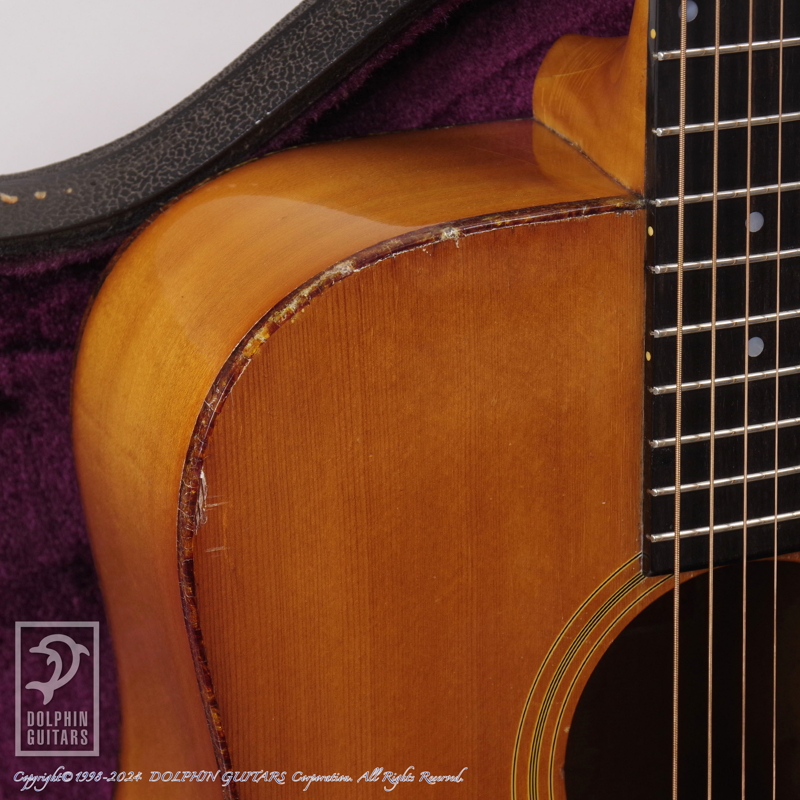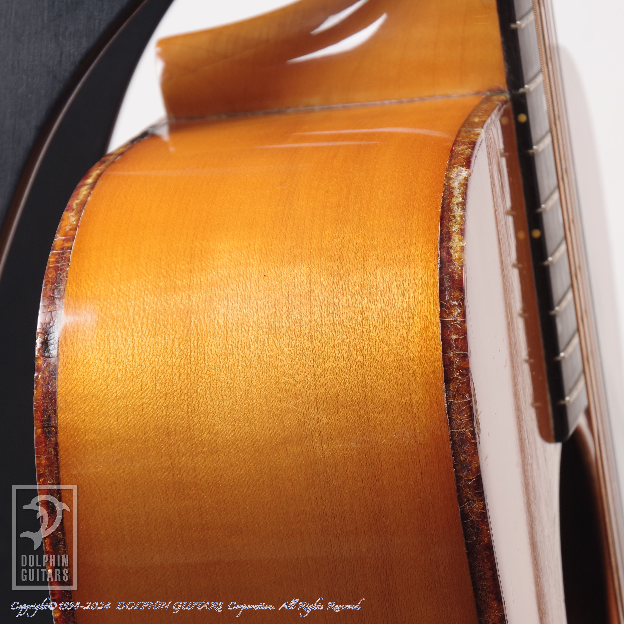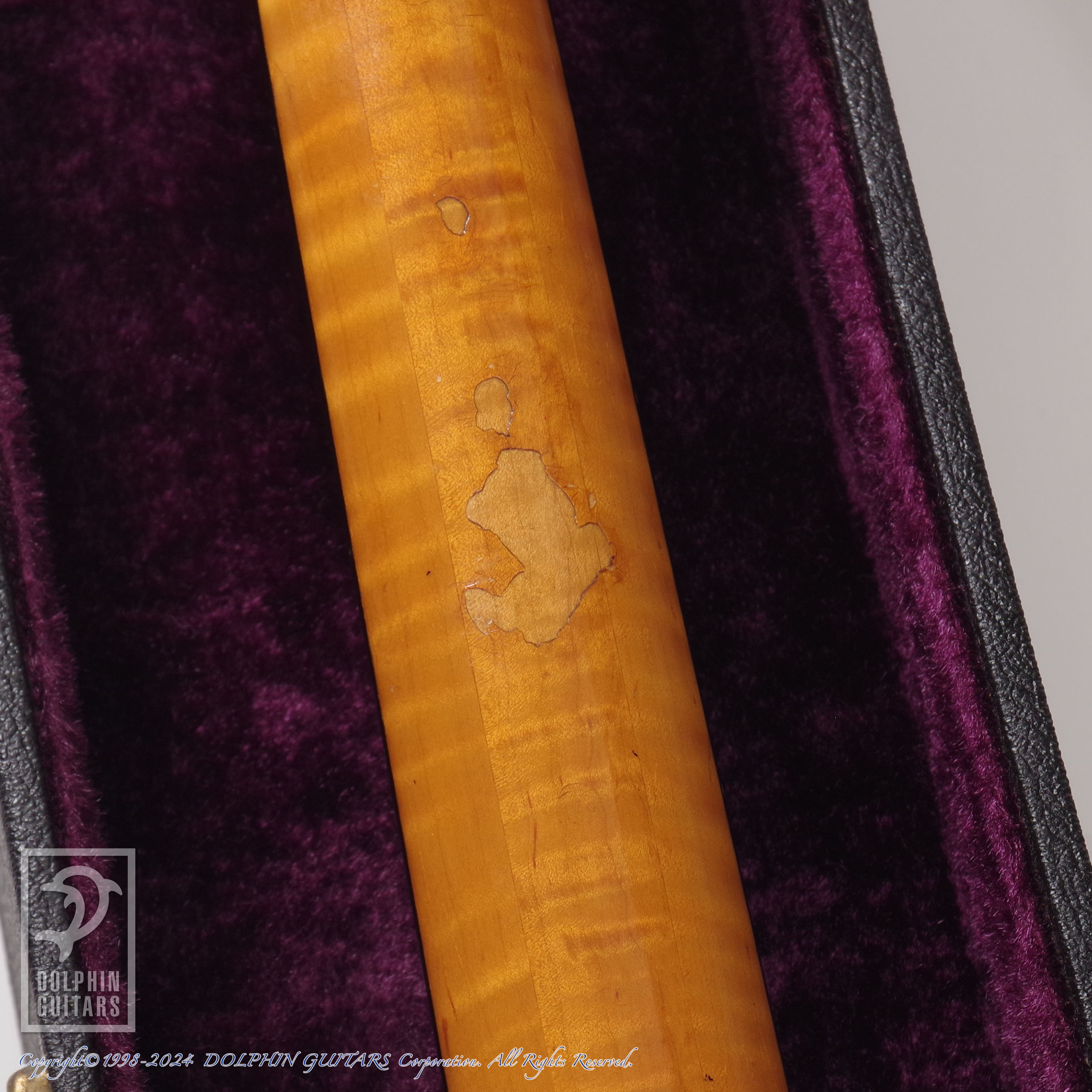ボディには塗装面のウェザーチェックや擦り傷・打痕などが多数見られ、ボディのべっ甲柄バインディングに細かいヒビが入っており、わずかに欠損した箇所があります。