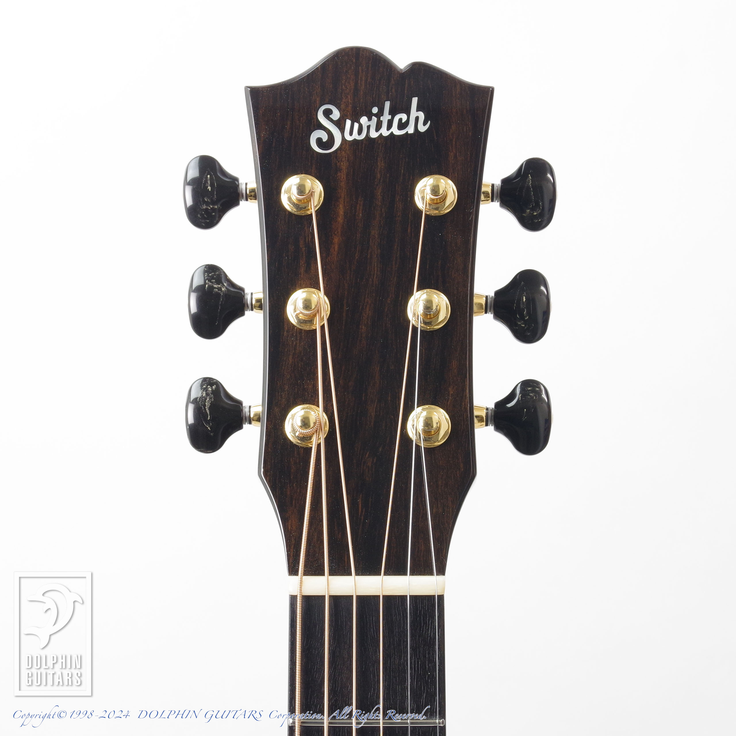 オリジナルカッタウェイ、エボニーバインディング+エルボーコンター仕様、フレットには耐久性、操作性に於いて抜群のアドバンテージを誇るSWITCHオリジナルステンレスフレットを採用。