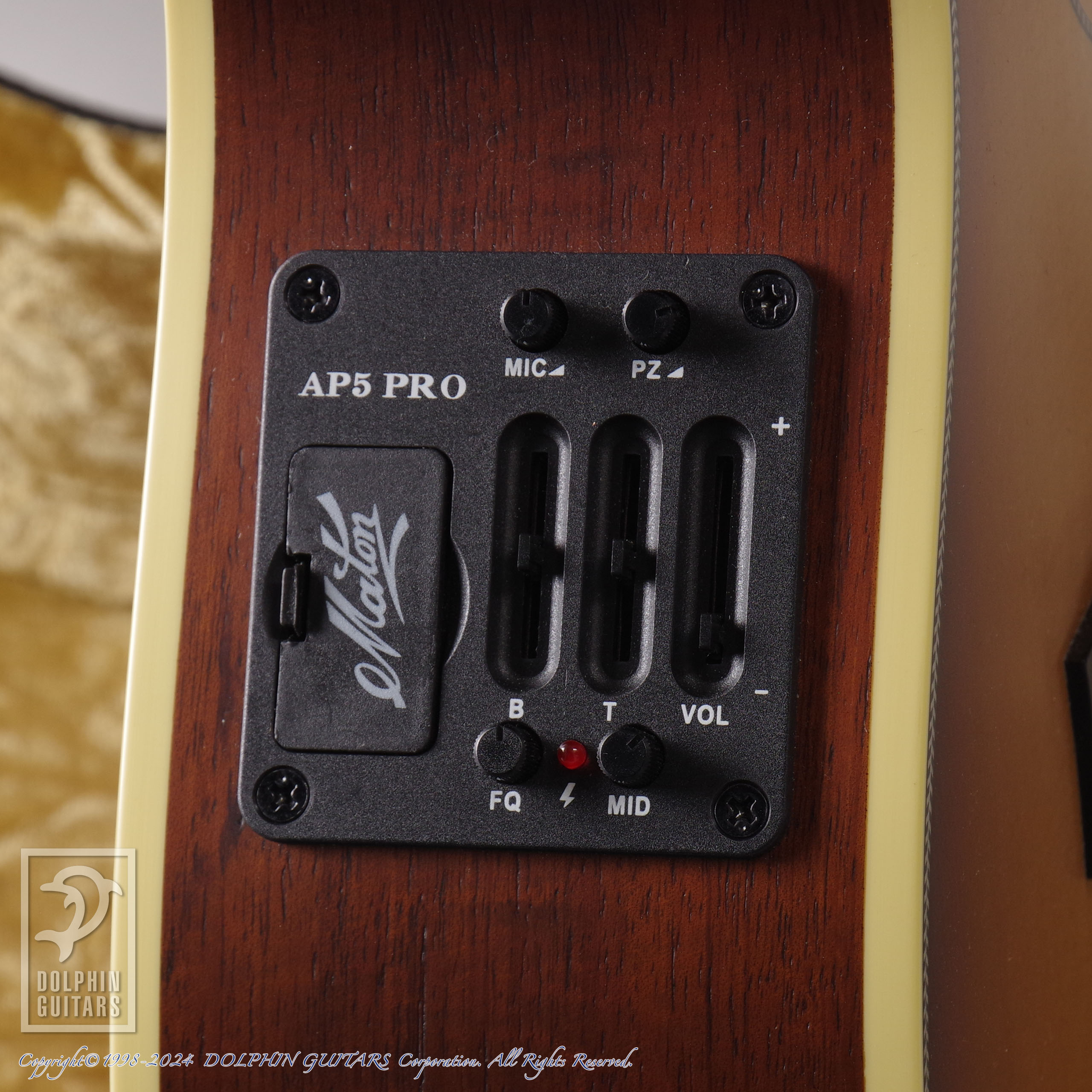 メイトンの魅力の一つでもあるピックアップシステムはメイトン社オリジナルのAP5-Proは特殊構造のアンダーサドルPUとコンデンサーMicをMixし、リアルなアコースティックサウンドをアウトプットできます。サイズはミニであってもラージボディにも引けをとらないこの大迫力のサウンドに、初めて弾かれる方は驚きを隠せないでしょう。