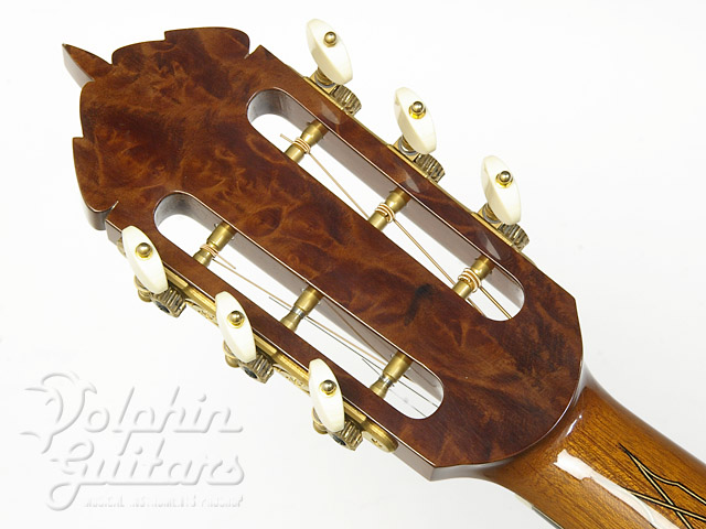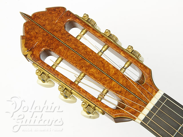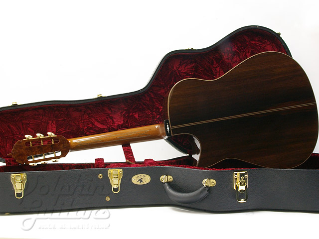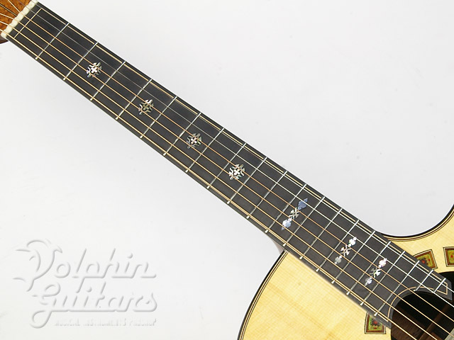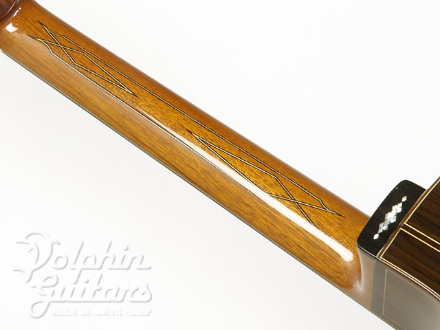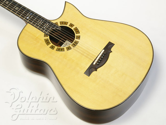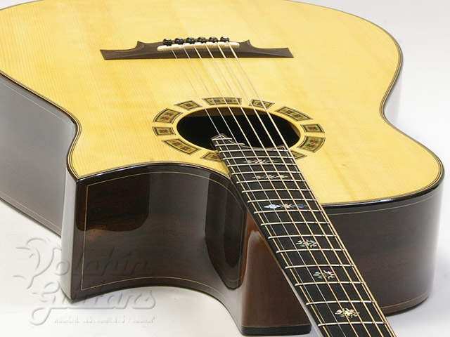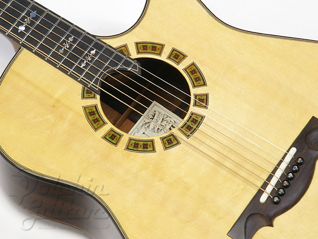 ヨーロピアン・スプルース・トップ、ハカランダ・サイド&バック、マホガニー・ネック、エボニー指板、ハカランダ駒、セグメント・ロゼッタ、ファンシー・スノーフレイクス指板インレイ、フローレンタイン・カッタウェイ仕様。