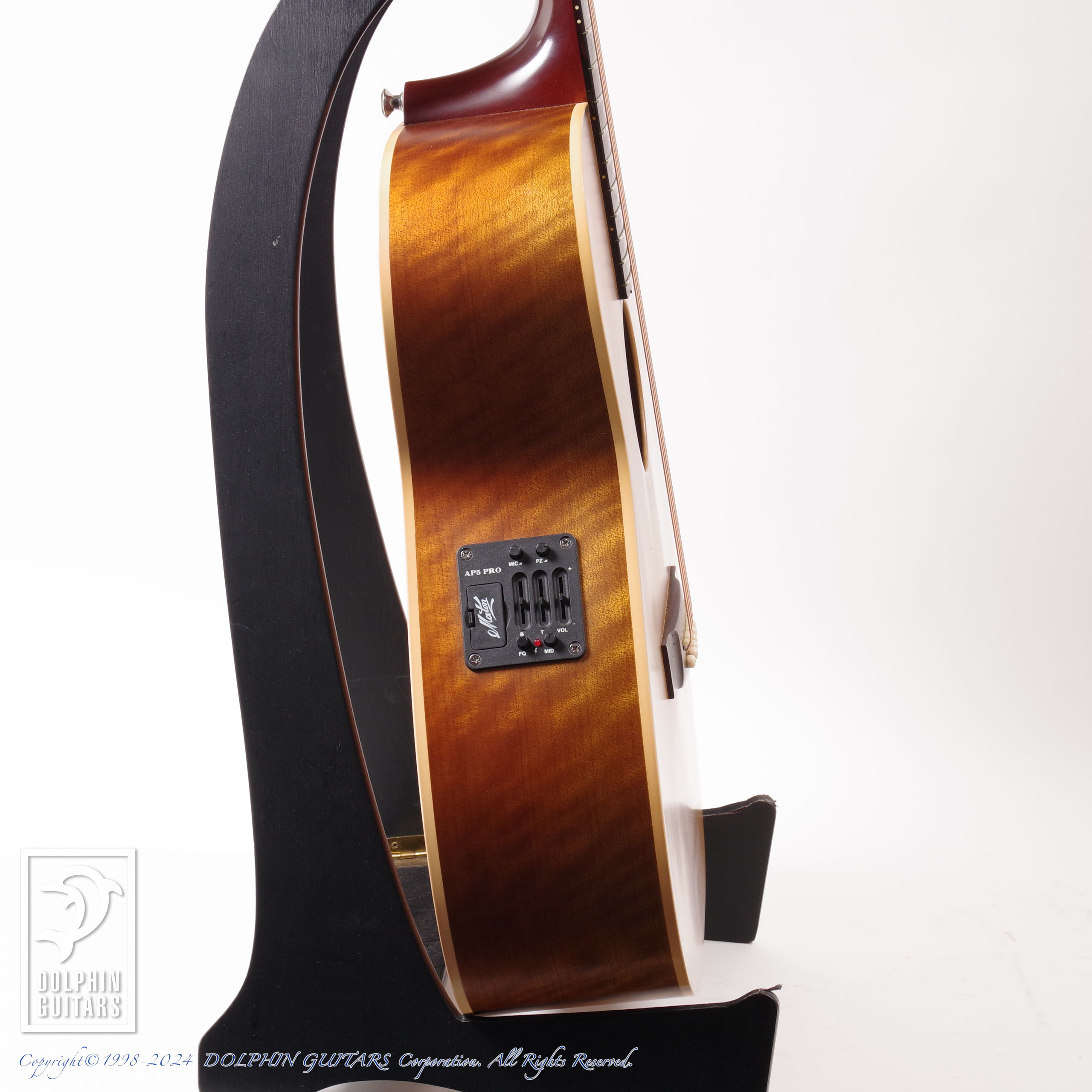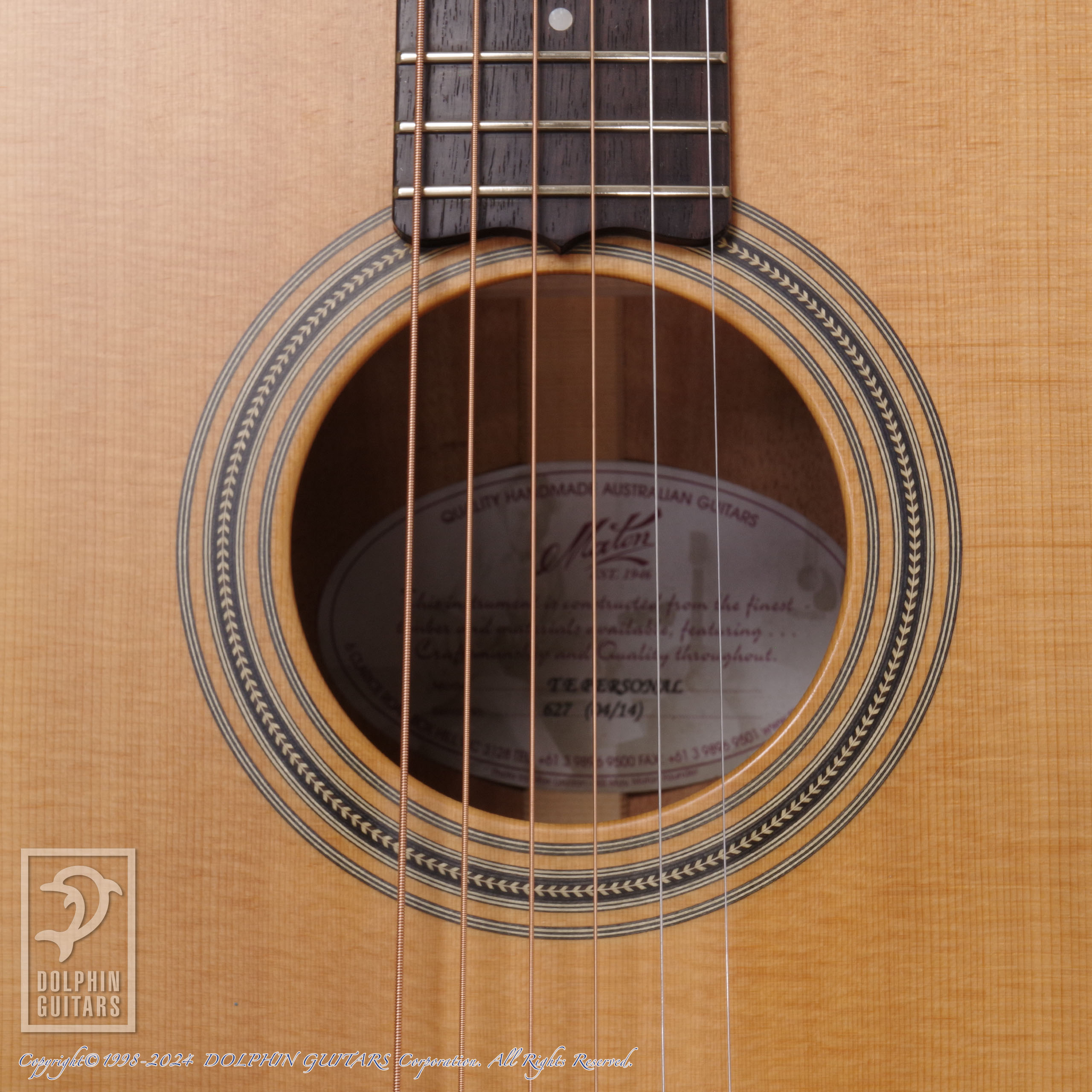 モデル名はトミーエマニュエル・パーソナルですが、本器はナット幅42mmのスリムネックとなっており、ネックの厚みも薄手で、メイトンでこのスリム感を求めていた方も少なくないはず。弦高は極限まで低くセッティングされており、力を入れずとも楽に押し弦できるほどで、スピーディーな音の立ち上がりはテクニカルなフレーズもストレスのないフィンガリングを可能にします。