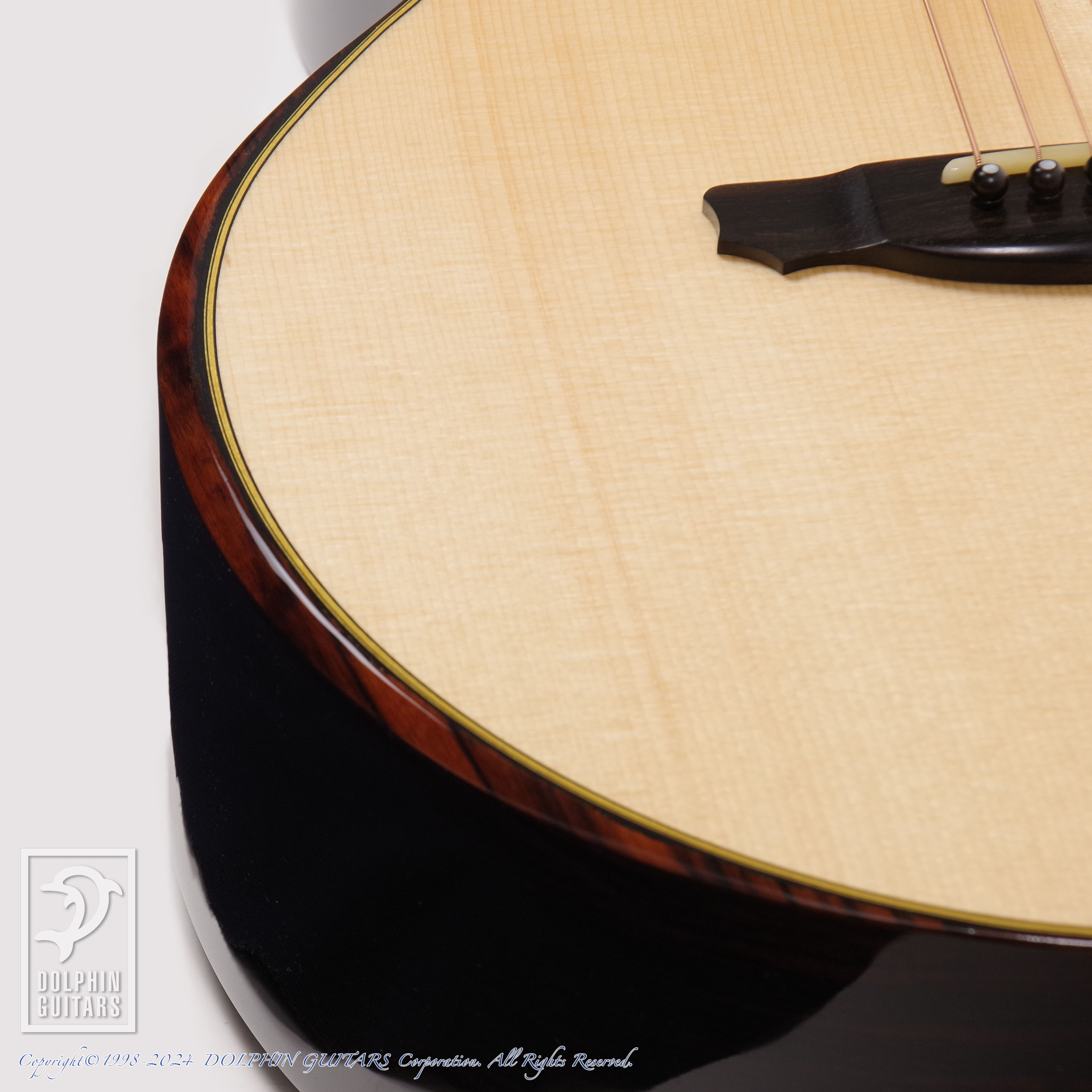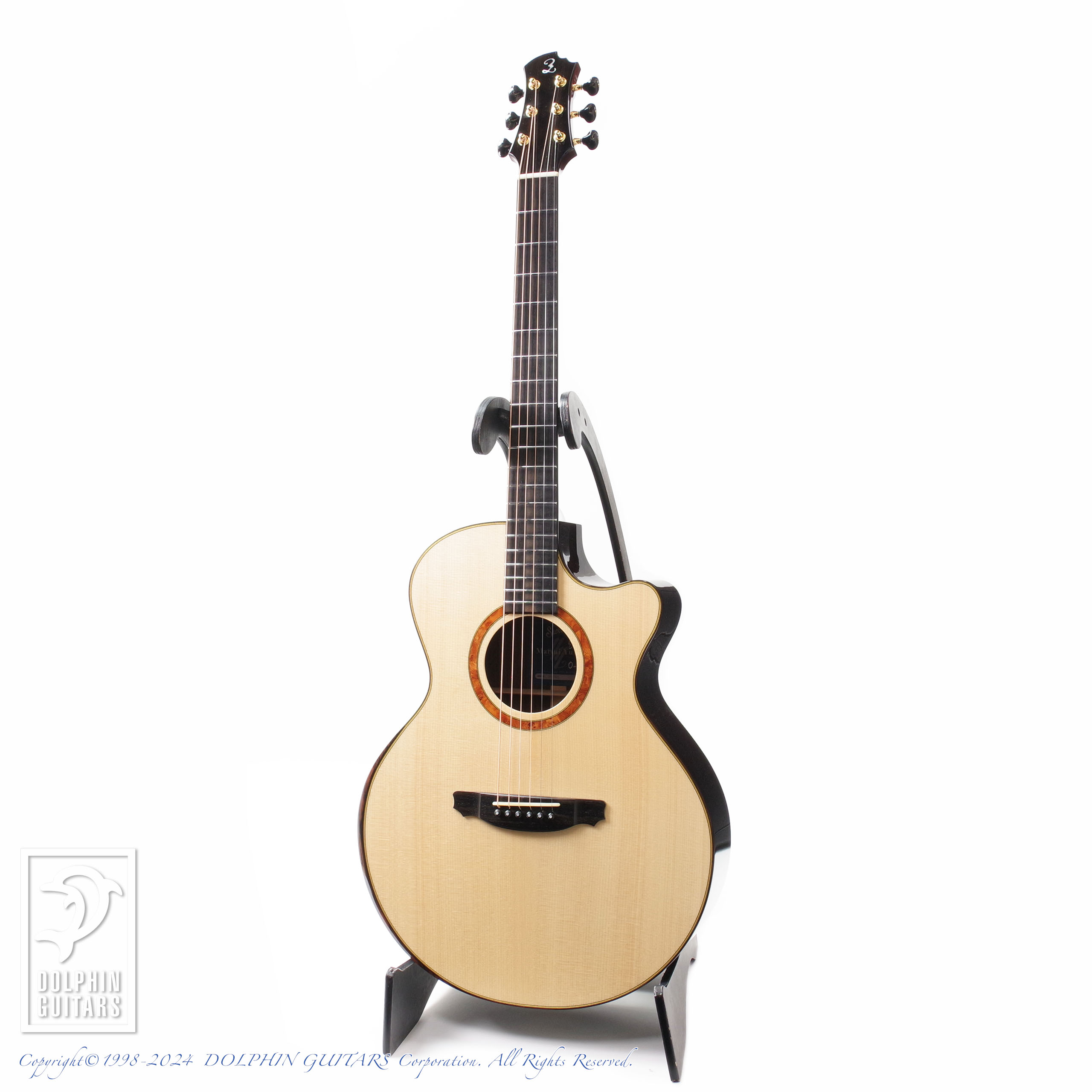 15周年という節目に特別なギターが欲しいという想いをカタチにしていただきました。使用材はインディアン・ローズウッド+ルッツ・スプルースとオーンドックスながらも、バック&サイドはできる限り薄いブラウン系でとこだわった選定をさせていただきました。ボディー・シェイプは前シグネチャーと同様ながら、ヘッド、ブリッジ形状は僕自身がデザインしたオリジナル・シェイプに変更してもらい、より特別なギターになりました。もちろんロゼッタやバインディングなど細かな装飾も全て僕が決めた特別仕様のシグネチャーモデルです。