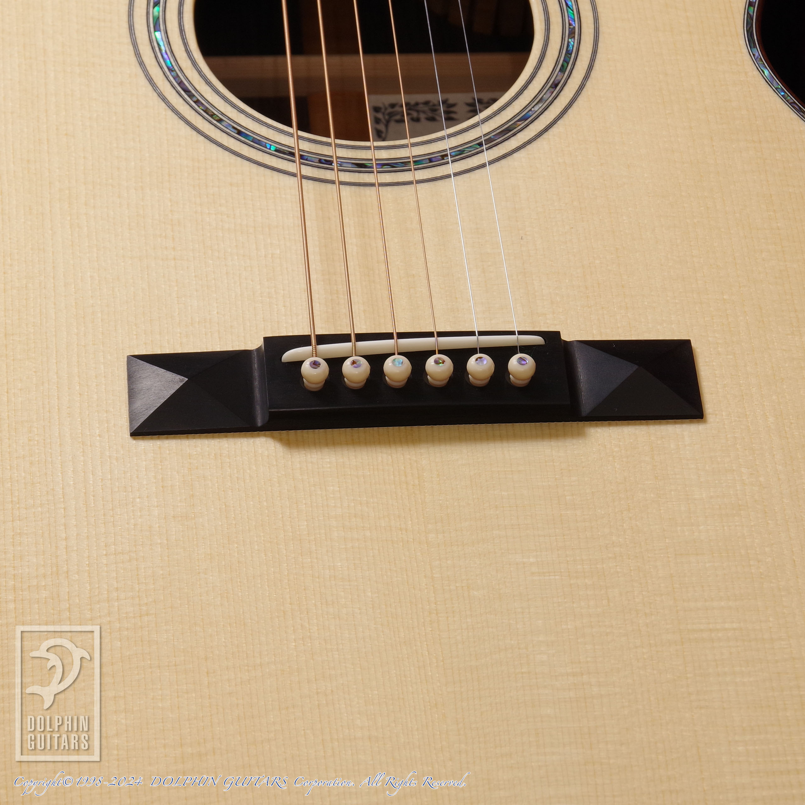 トップのジャーマンスプルース、バックのインディアンローズウッドはスタッフが久留米の工房を尋ね、丹精な白色のスプルースとダークで細かく目の詰まったローズを厳選したものを採用しました。それに合わせてヘッドプレートも濃い色味を選定しています。