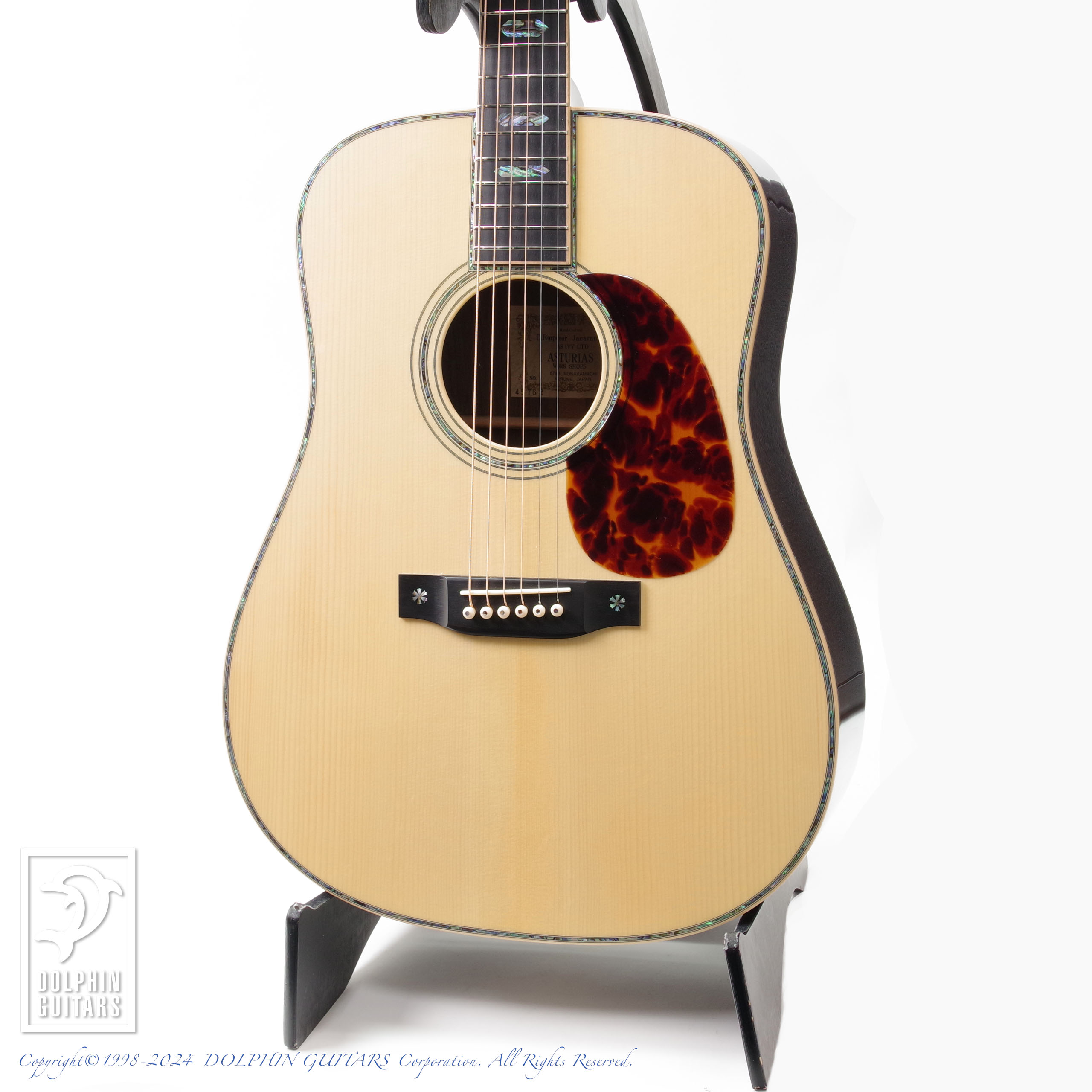 ヘッドからボディエンドまで贅沢に施されたメキシコ貝インレイのきらびやかさはもちろん、厳選された柾目のハカランダに色白で美しいアディロンダックスプルースと、この1本を製作するために最高級材しており、圧倒的な高級感のあるルックスとなっています。