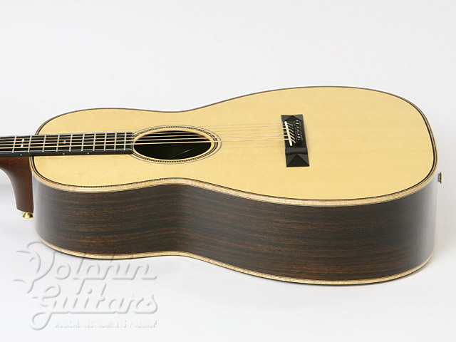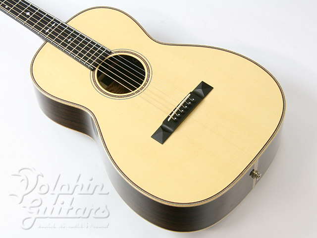 シトカスプルース・トップ、インディアンローズウッドサイド&バック、ホンジュラスマホガニー・ネック、赤いラインがアクセントのヘリングボーン・ロゼッタ、メイプルバインディング。