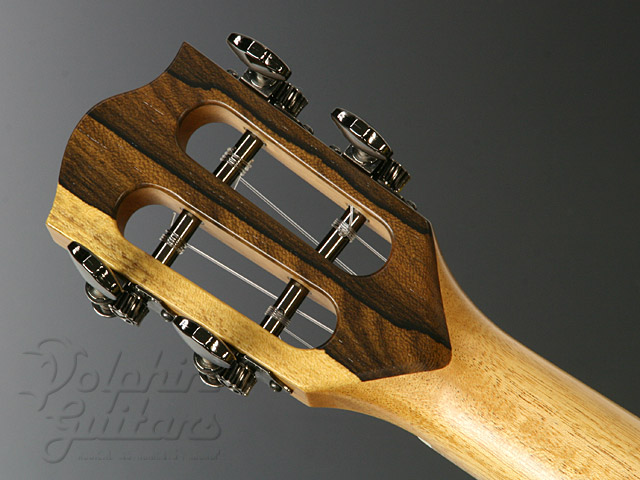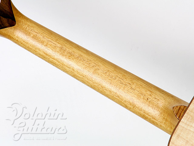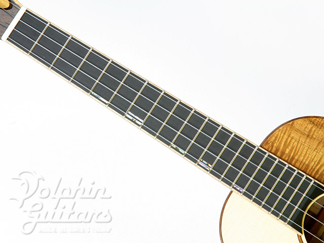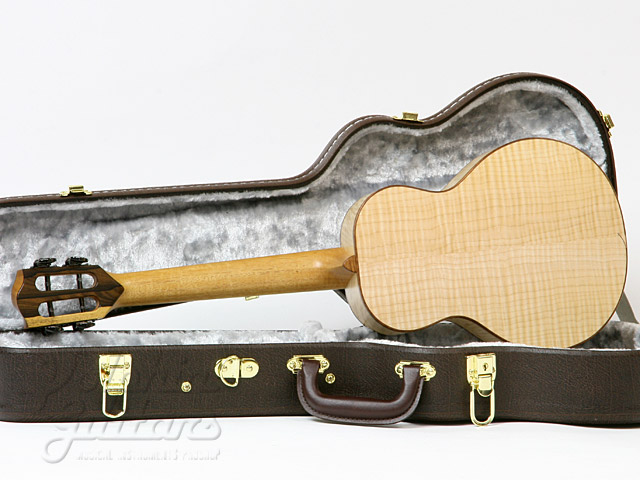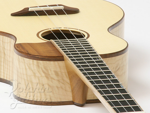 トップには木目の詰まったヨーロピアン・スプルースを、3Aグレード(最高級)の美しいフレイム・メイプル・サイド&バック、付き板には特徴的な木目のジリコーテを、スロテッド・ヘッド、エボニー指板、マダガスカルローズ駒、コア・ピックガード、コア・バインディング。