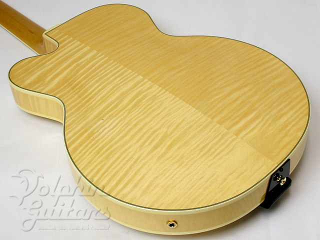 綺麗な杢目の入ったフレームメイプルの合板をボディ材に使用、ピックアッ プはトップに直に取り付けられています。