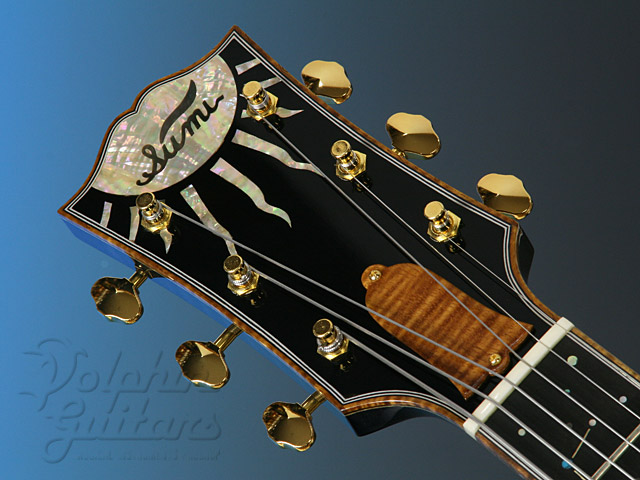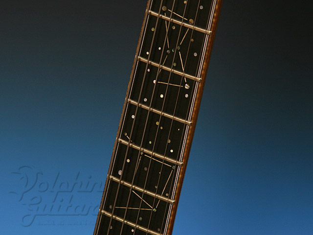 エゾ松トップ、カーリー・メイプル・サイド、バック&ネック、エボニー指板&駒、ハワイアンコア・バインディング。使用しているマテリアルは全て最上級のものです。