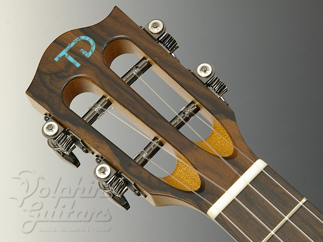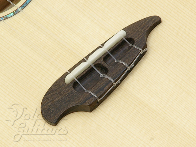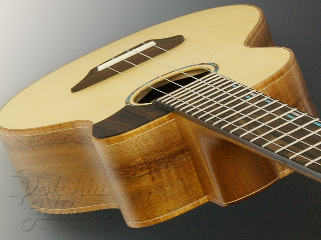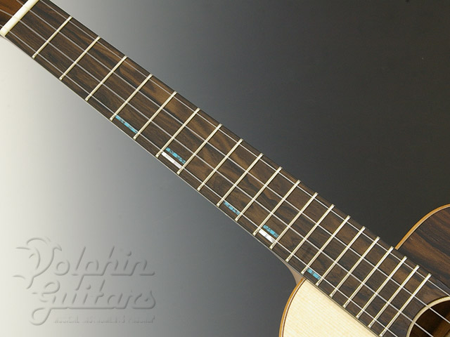 トップには木目の詰まったヨーロピアン・スプルースを、3Aグレード(最高級)の美しいフィギャード・コア・サイド&バック、スロテッド・ヘッド、付き板&指板&駒&ピックガードにはジリコーテを使用。指板ポジションマークとサウンドホール装飾にはアバロンとターコイズを組み合わせました。