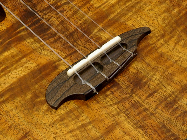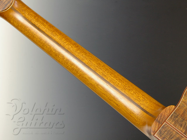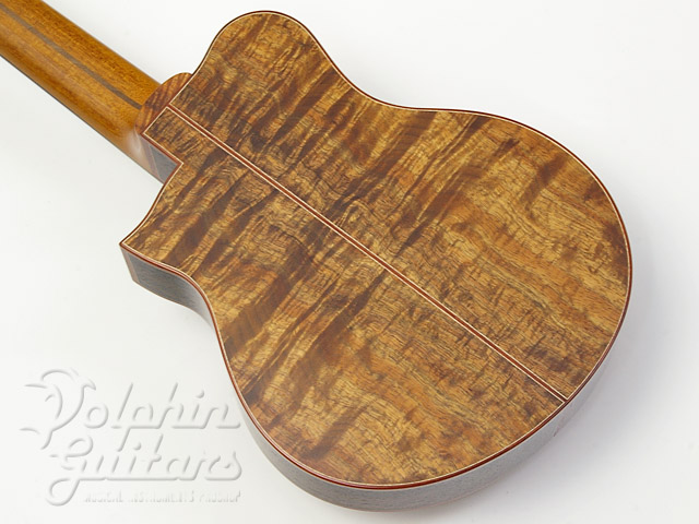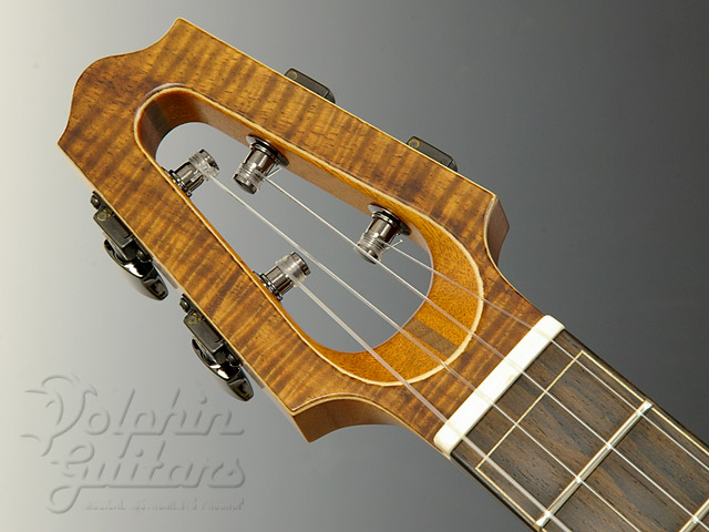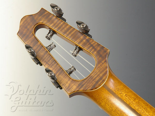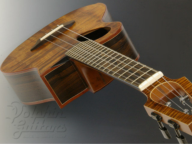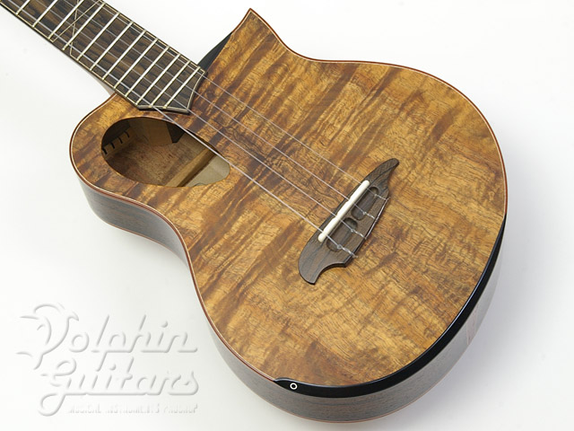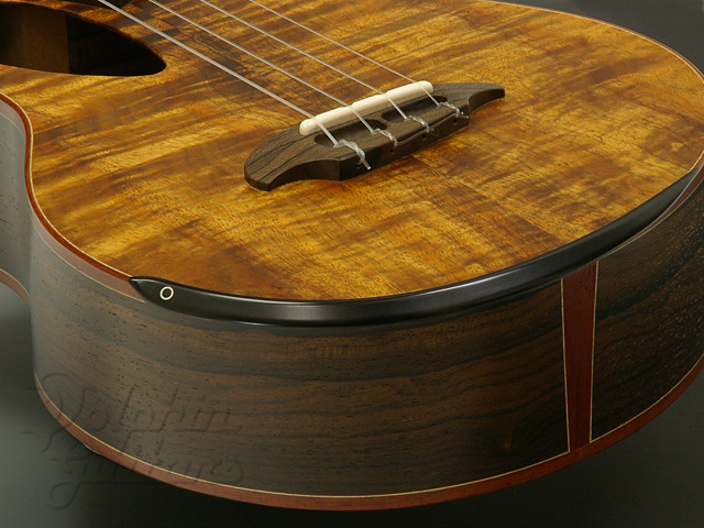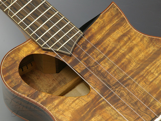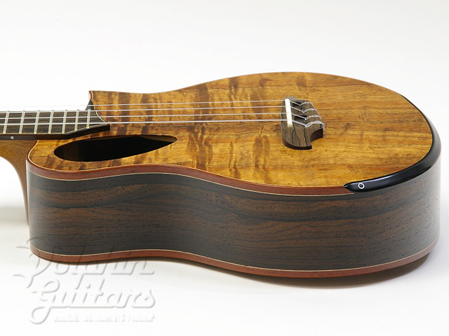 ハワイアンコア(AAAグレード)・トップ&バック、ジリコーテ(*マッカーサーエボニー)サイド、ホンジュラス・マホガニー・ネック(センター・ウォルナット)、サイド・サウンドホール、コンター加工、ジリコーテ指板&駒、シングル・スロテッドヘッド、象牙ナット&サドル、糸巻きには世界最小、最軽量の超小型ペグGotoh製のstealthを搭載。