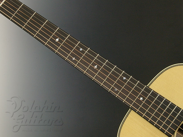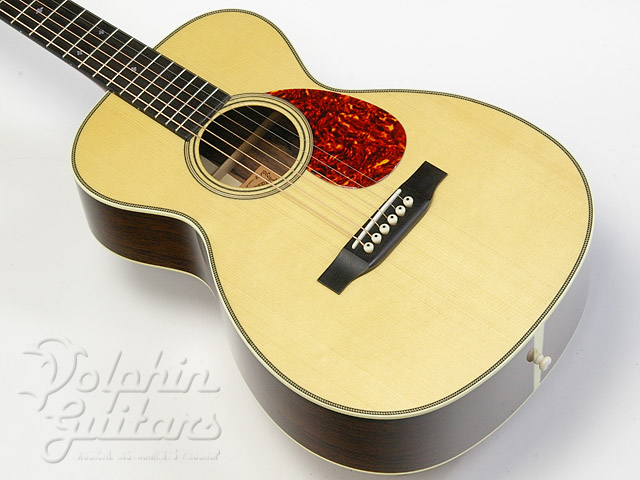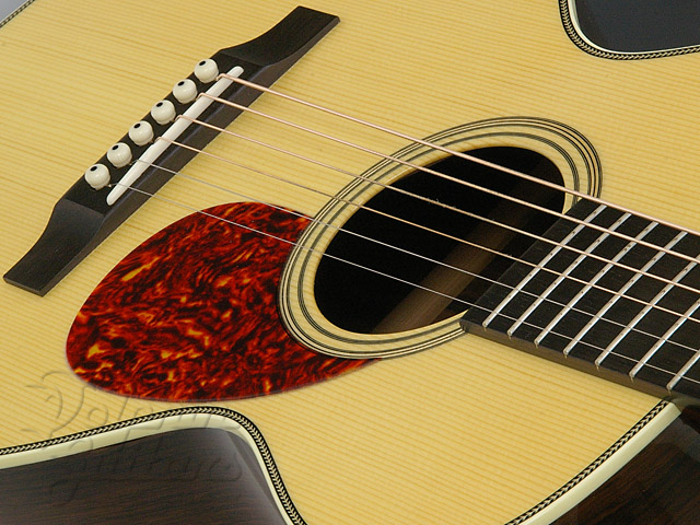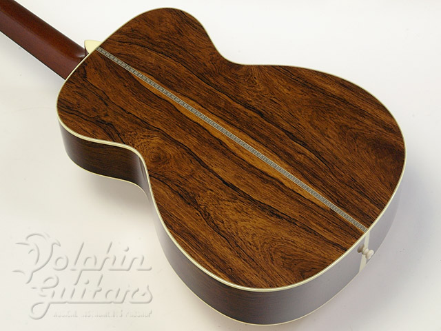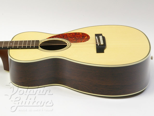 本器はBabyシェイプ、ヨーロピアンスプルーストップ、マダガスカルローズウッドサイド&バック、エボニー指板&駒、スキャロップドXブレイス、ヘリンボーントリム、ゴトー糸巻き仕様。