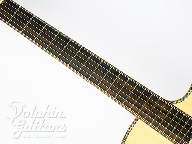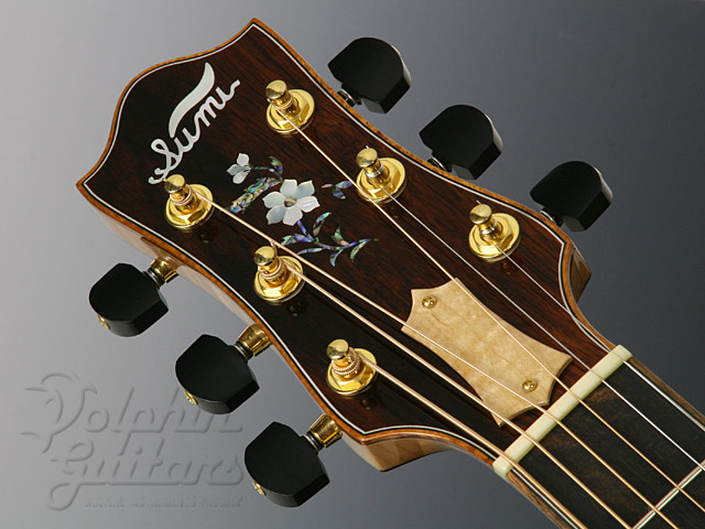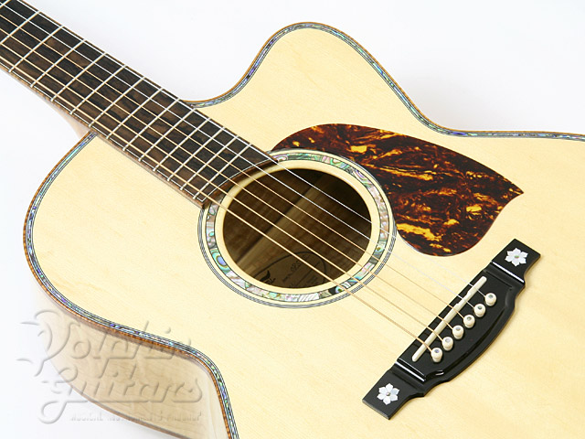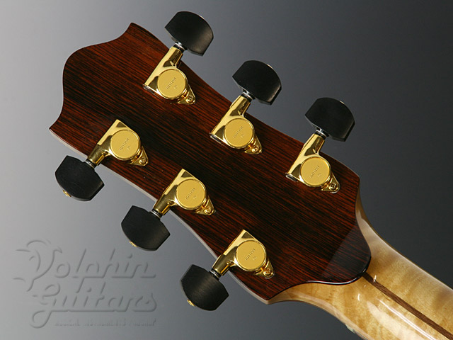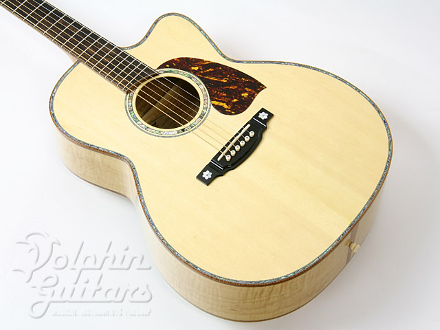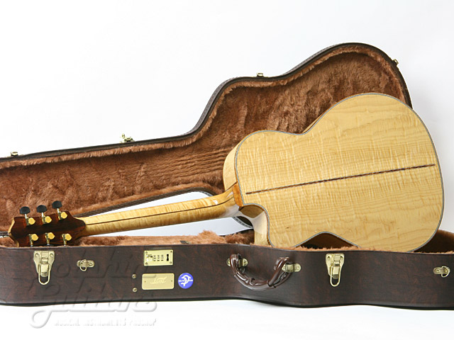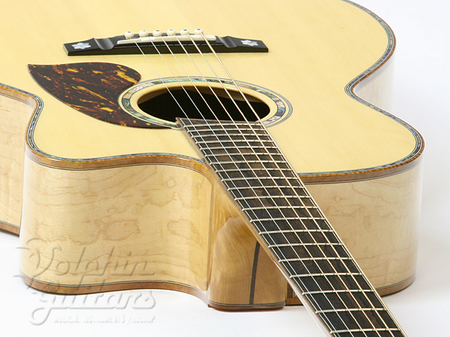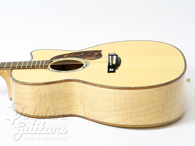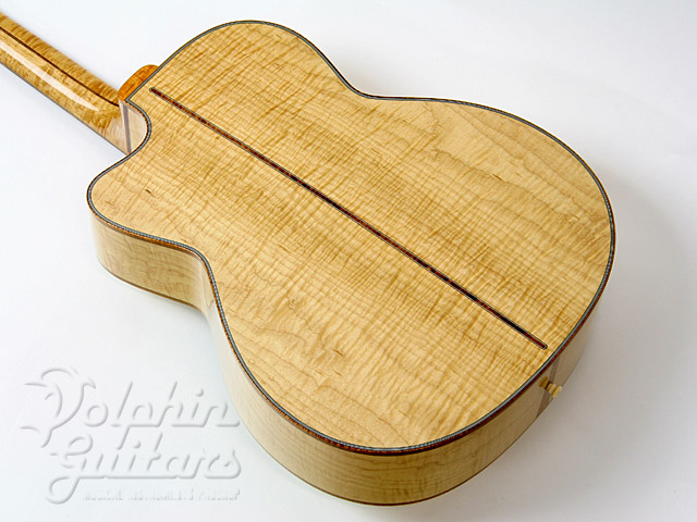 エゾ松・トップ、フィギャード・メイプル・サイド、バック&ネック(3ピース)、シャム柿指板、アバロン・ボディ・トリム、カッタウェイ。