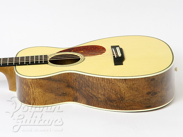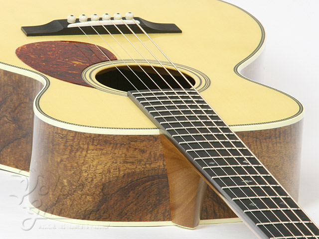 ヨーロピアン・スプルース・トップ、サイドバックのハワイアン・コアは、ラミネイトではありますが、この上ない極上の杢目が輝いております。エボニー指板&駒、ヘリンボーン・バインディング、塗り込みピックガード。