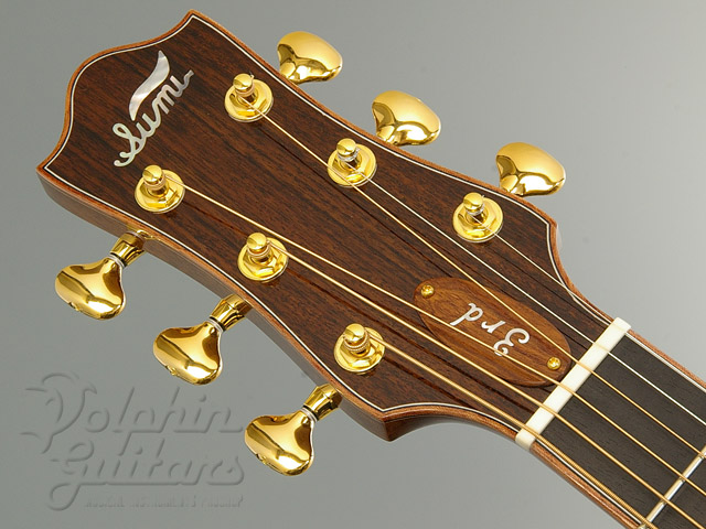 エゾ松・トップ、カーリーウォルナット・サイド、バック&ネック、エボニー指板&駒、スキャロップドXブレイス、ベネチアンカッタウェイ、本鼈甲PG、トラスロッドカバーには"3rd Annivarsary"を意味するインレイが施されております。