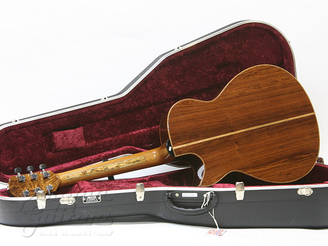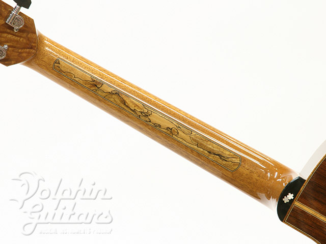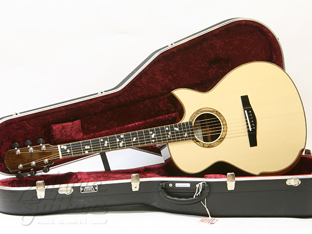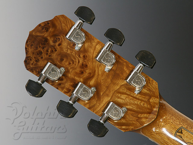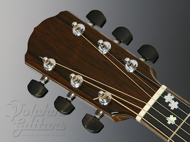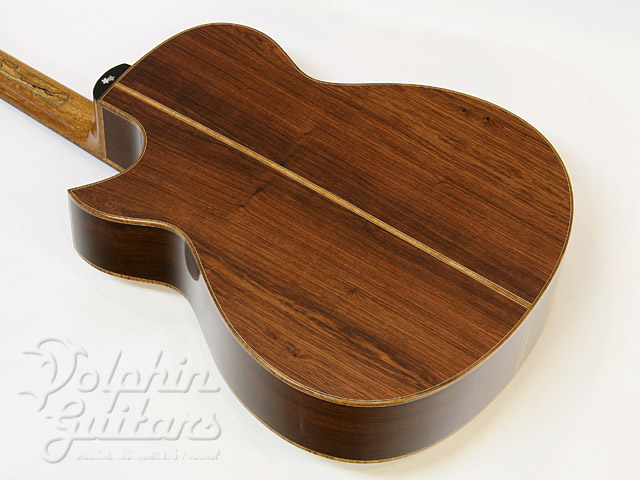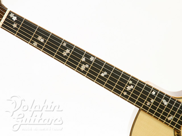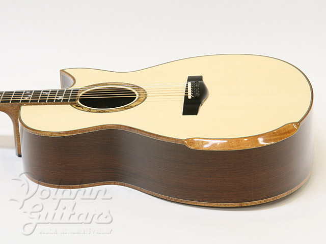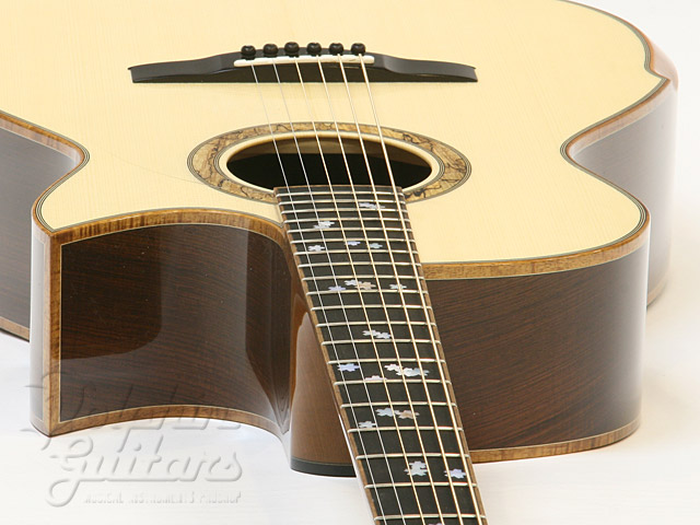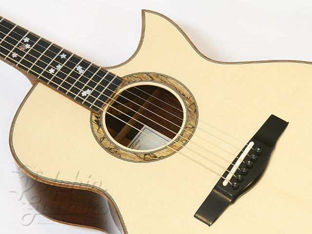 ジャーマン・スプルース・トップ、マダガスカル・ローズ・ウッド・サイド&バック、マホガニー・ネック、エボニー指板、カッタウェイ。フィンガーボードに入れられたサクラのインレイとネック裏のスポルテッド・メイプルの装飾が目を惹きます。