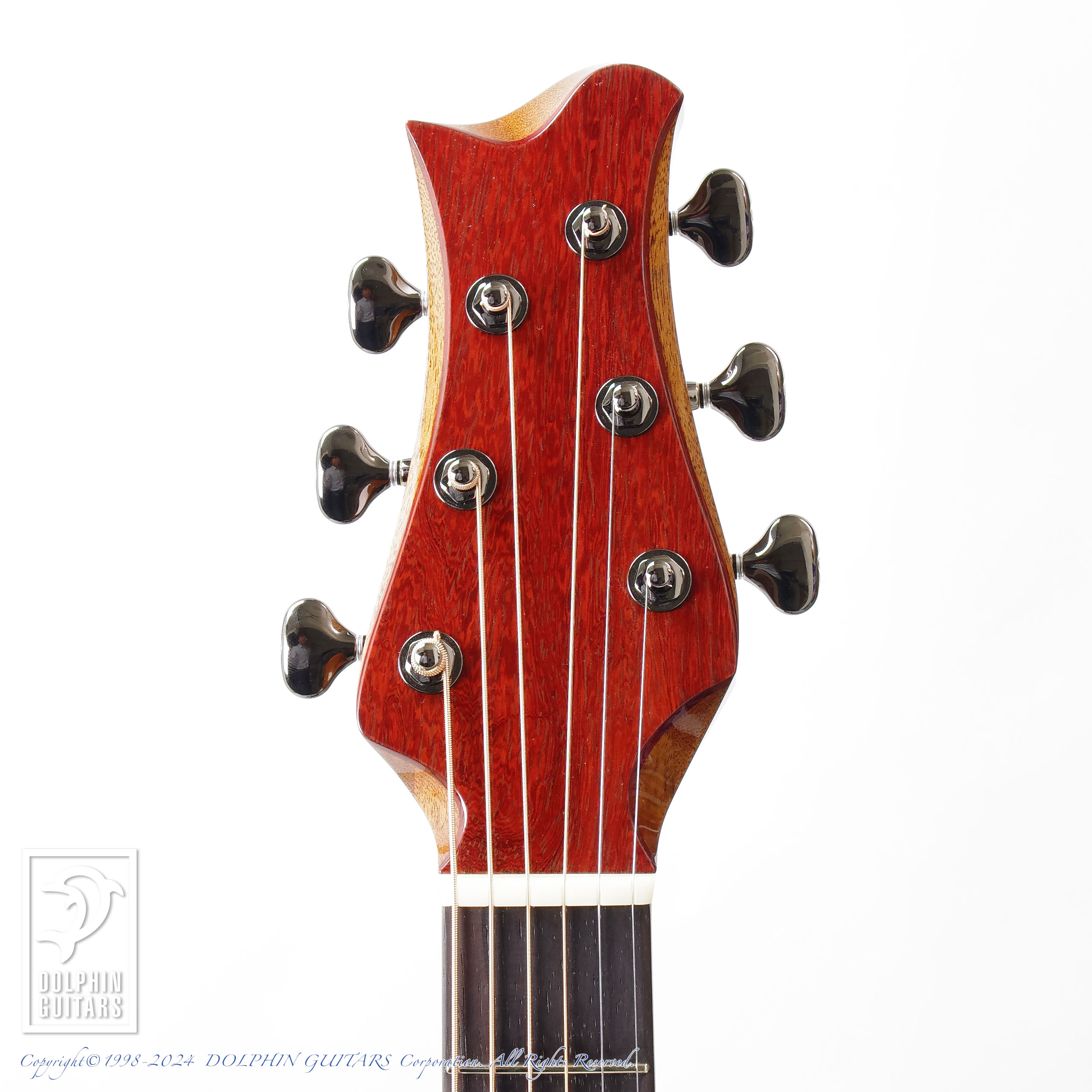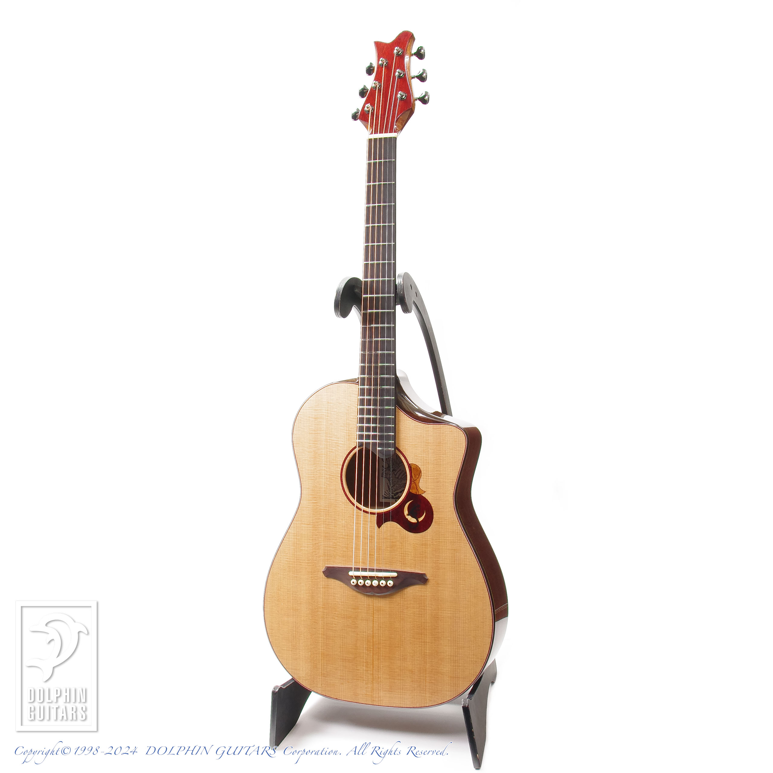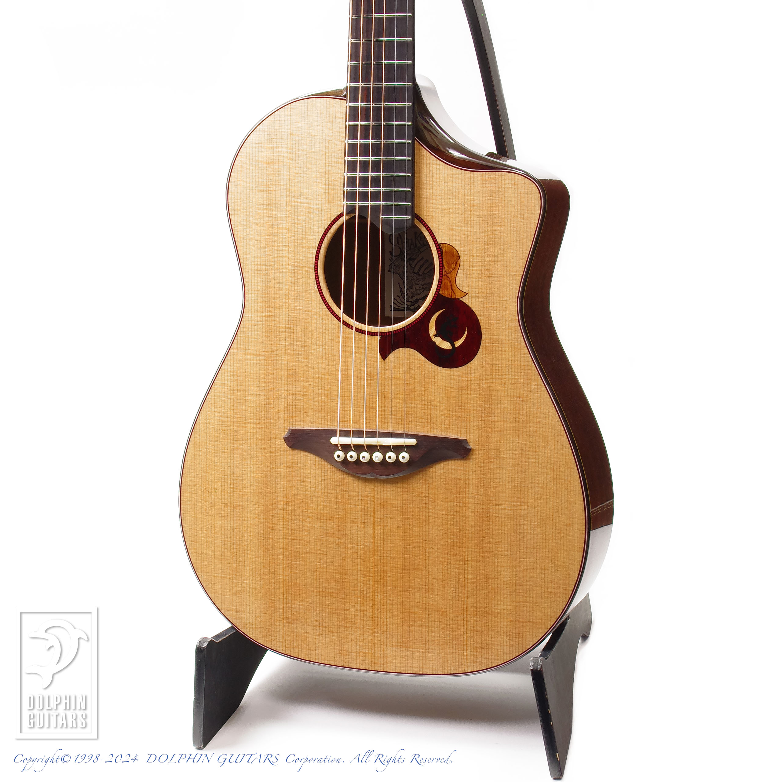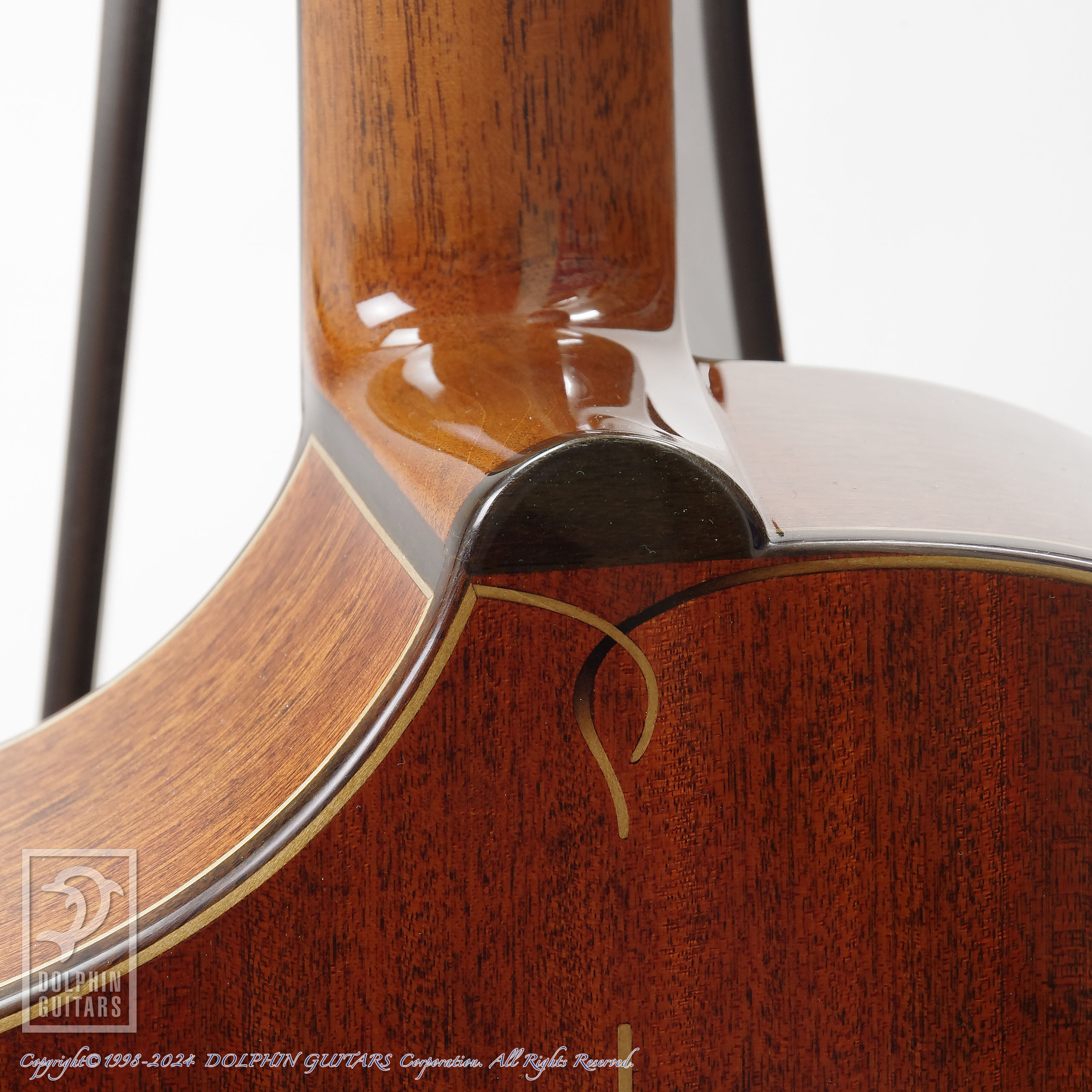 パドゥーク材の赤を基調としたデザイン。ビルトインPGを含めて板厚を調整したトップ板、ベヴェルドカッタウェイ、ネックジョイントは杉田氏が独自に改良したスパニッシュジョイントとなっておりますので、十分な強度を保ったままヒールレスにすることを可能にし、木工に長けた杉田氏自慢のネックジョイントです。ヒールレスジョイントがもたらすハイポジションの優位性は絶大で、13Fまでカポタストの装着を可能とし、それほどハイポジションの演奏性にも重視した構造となっております。