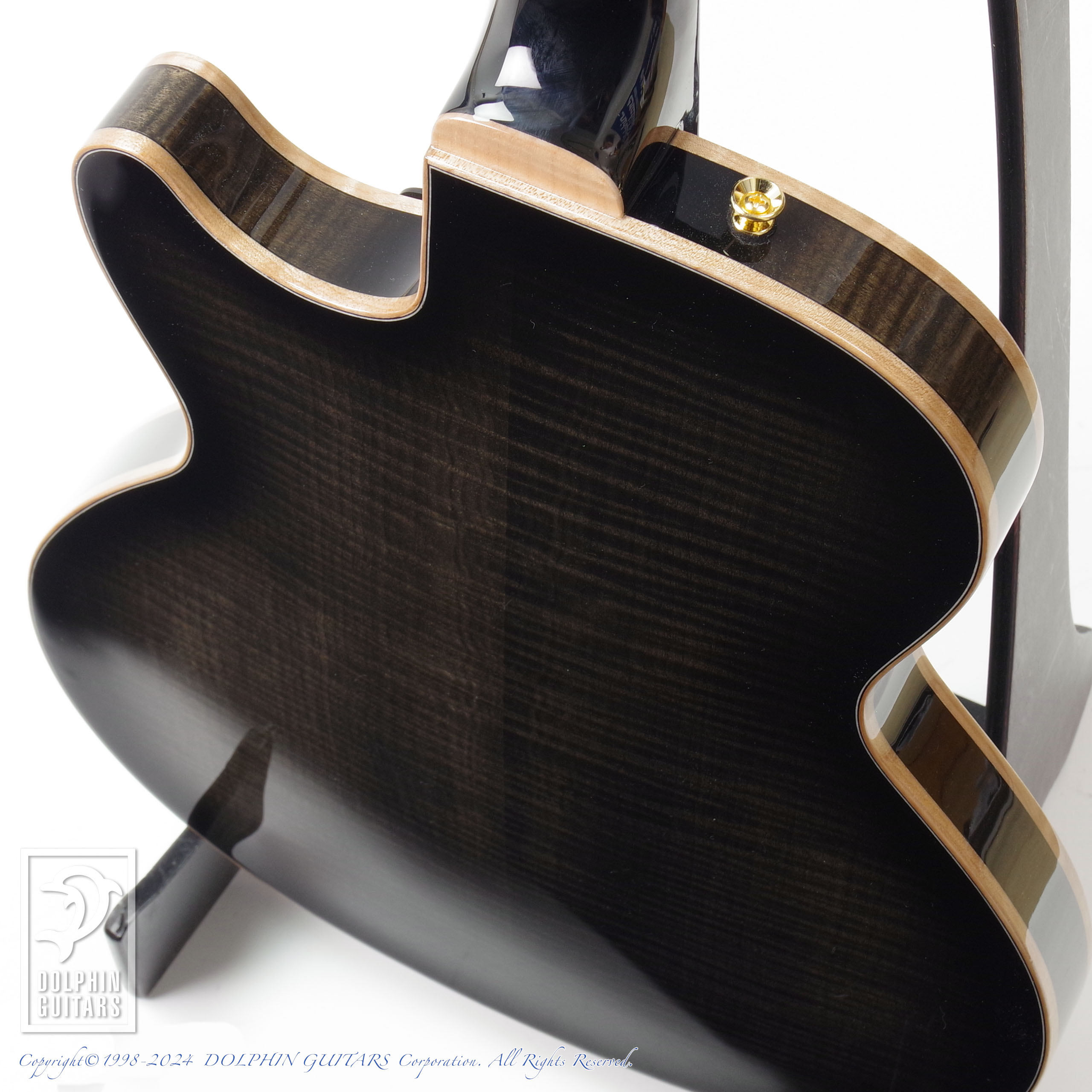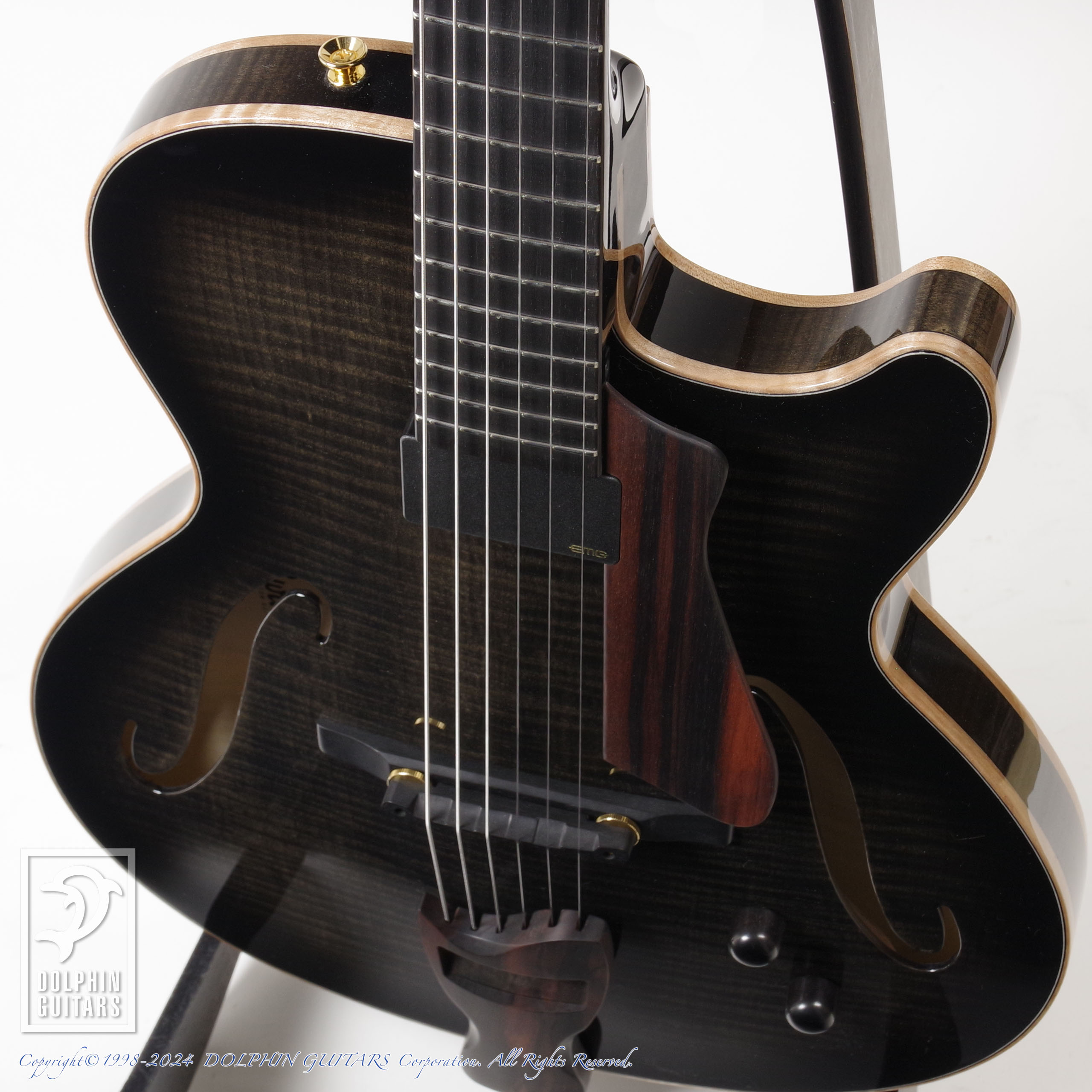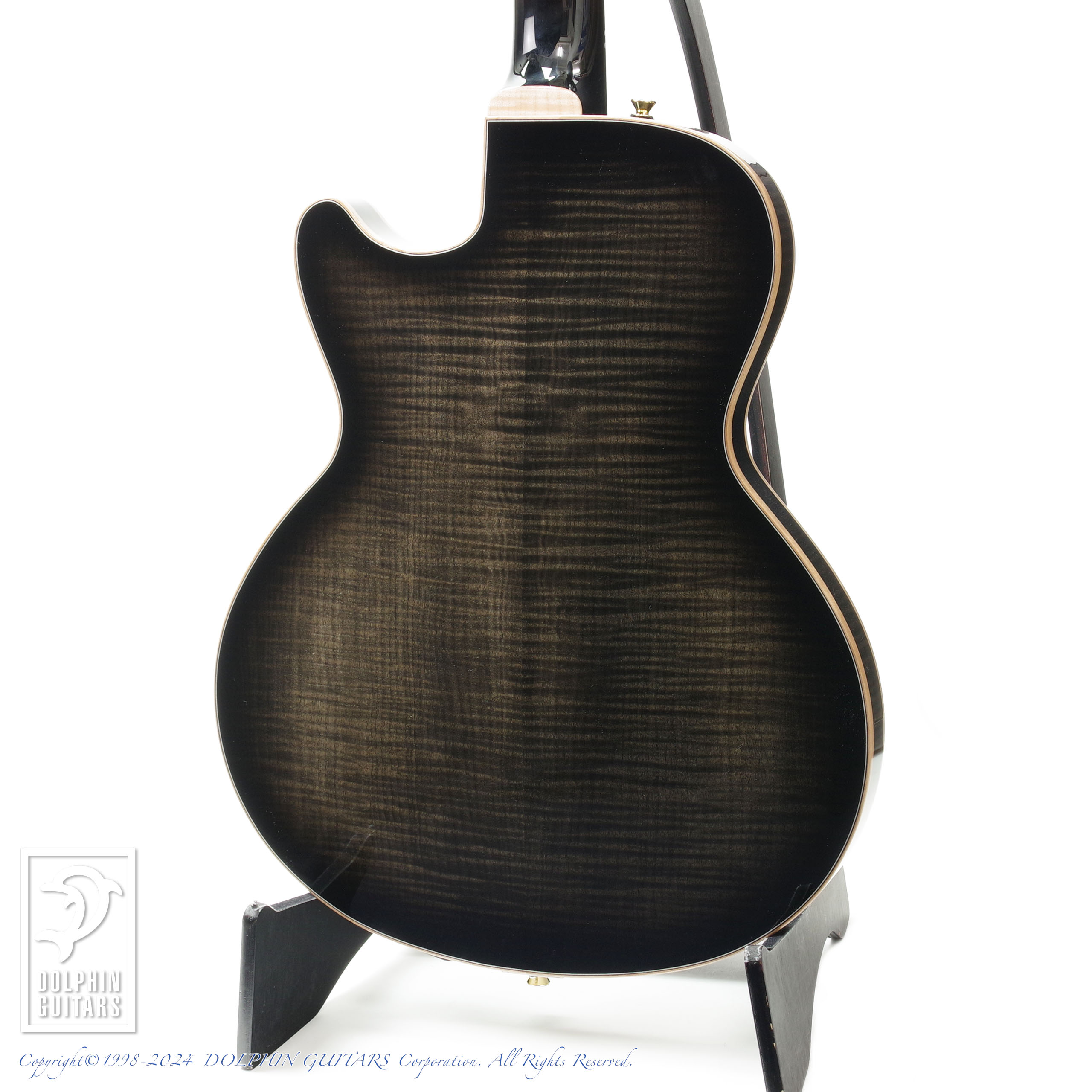 モダンなSシェイプのサウンドホールや、フレイムメイプルの美しい杢目が洗練された現代的なシルエットを印象付けております。
