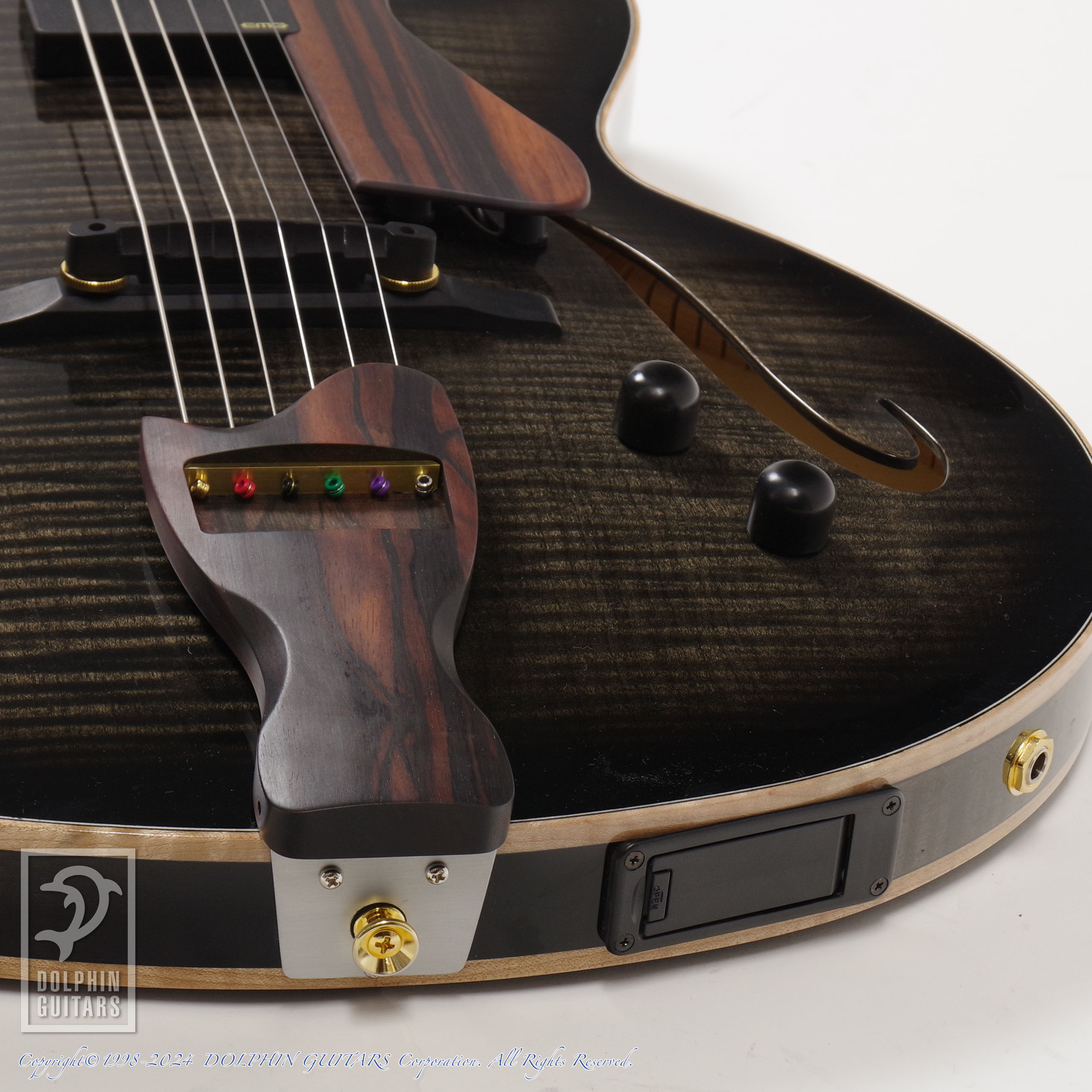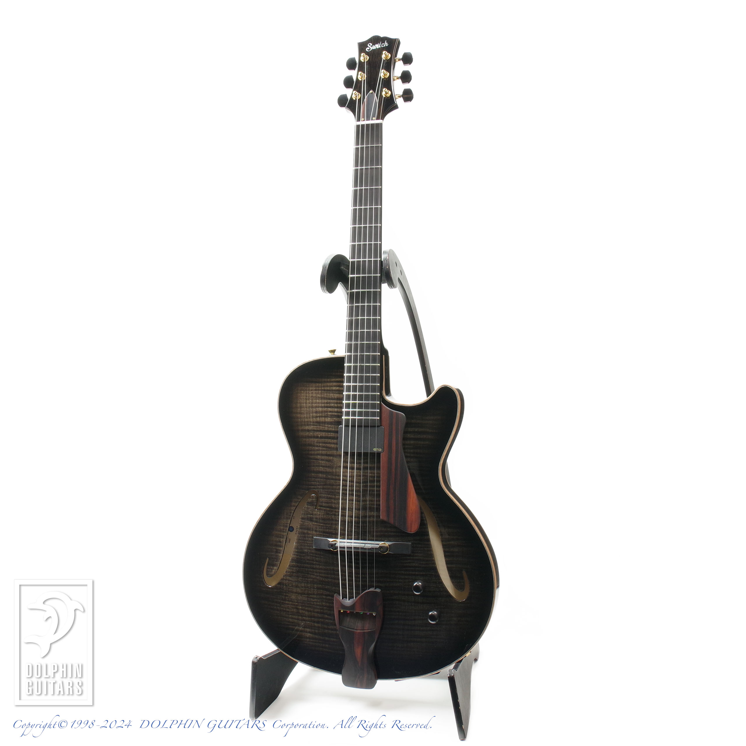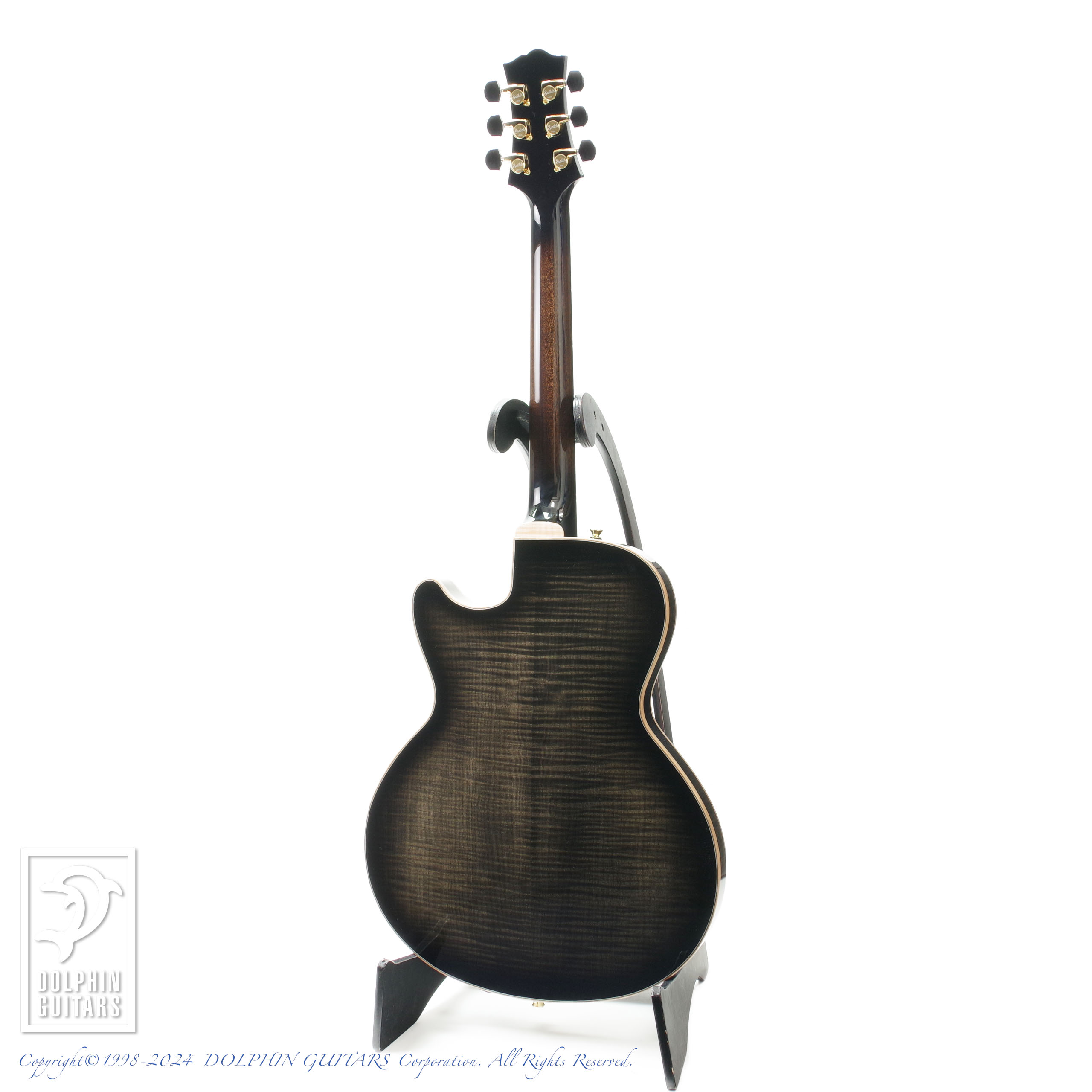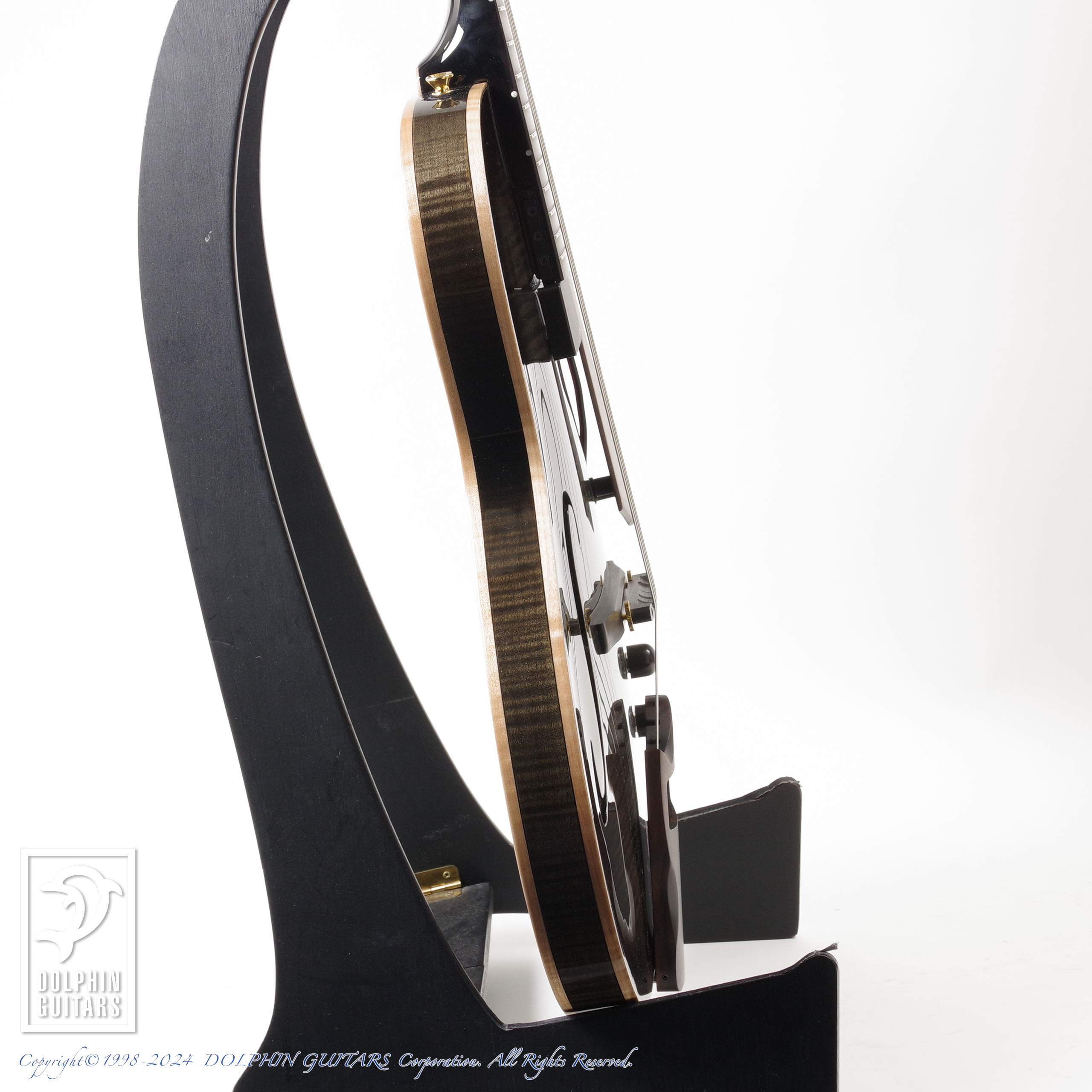 モダンなSシェイプのサウンドホールや、フレイムメイプルの美しい杢目が洗練された現代的なシルエットを印象付けております。