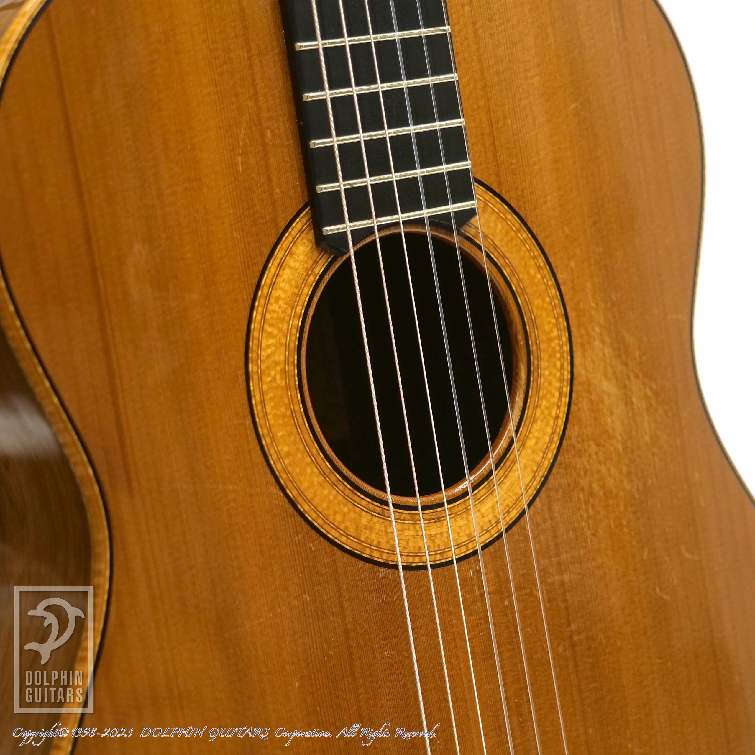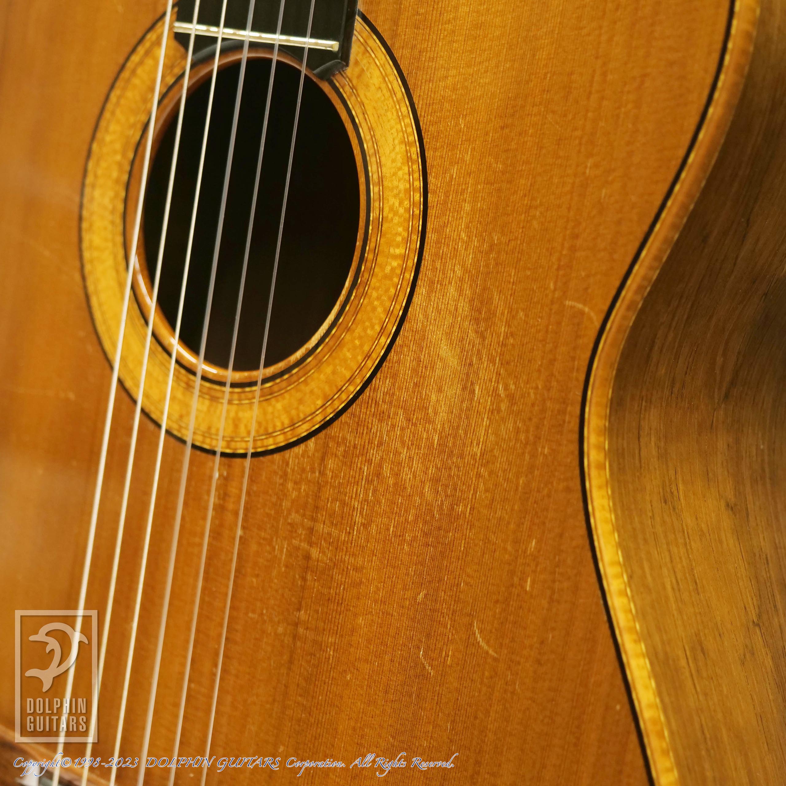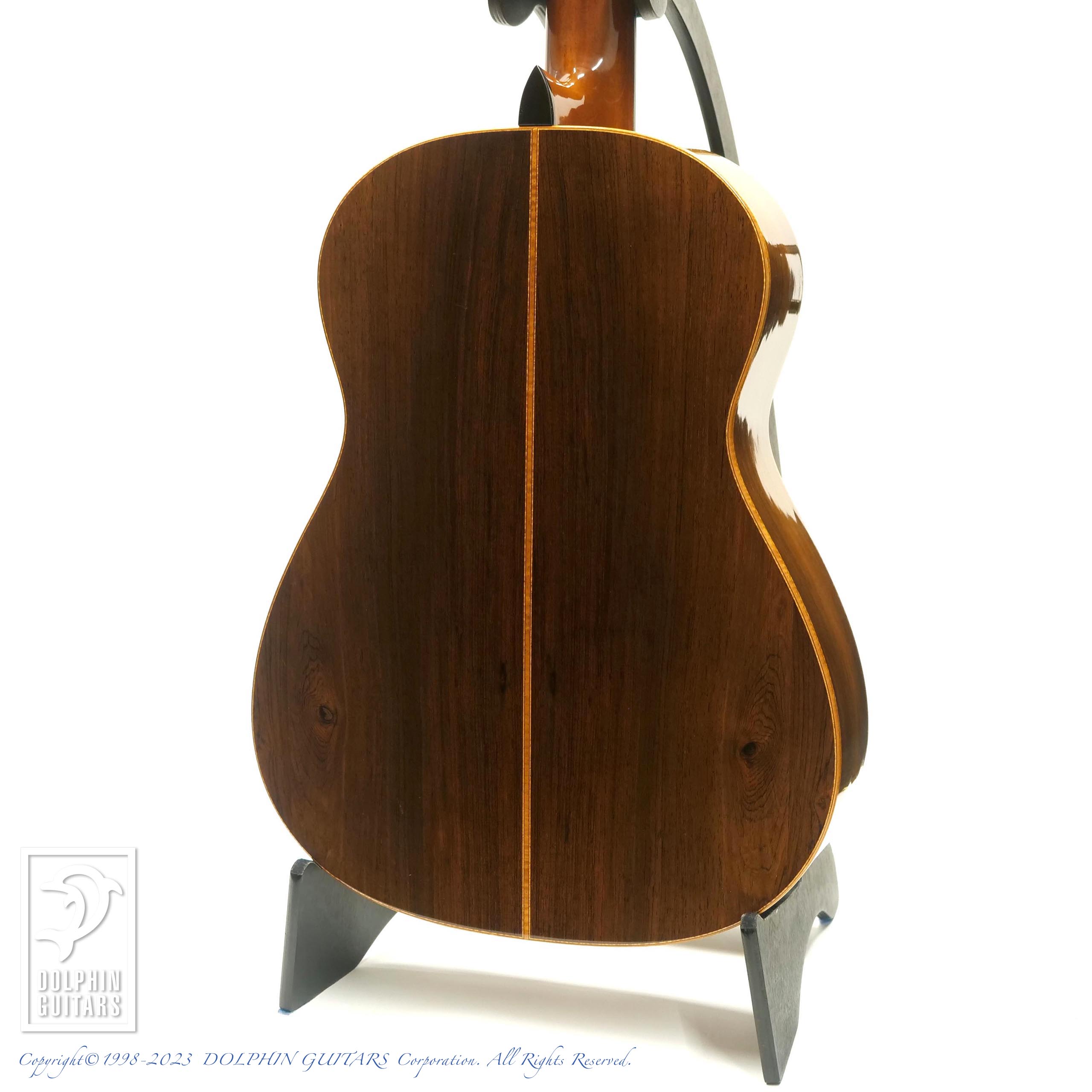 バックのハカランダは目の詰まった非常にグレードの高いものを使用しており、杢目フェチも納得の風格です。トップのシダーのカラーと淡い色味のサイドバックの統一感や、弾き込まれた様子も渋さを演出しております。