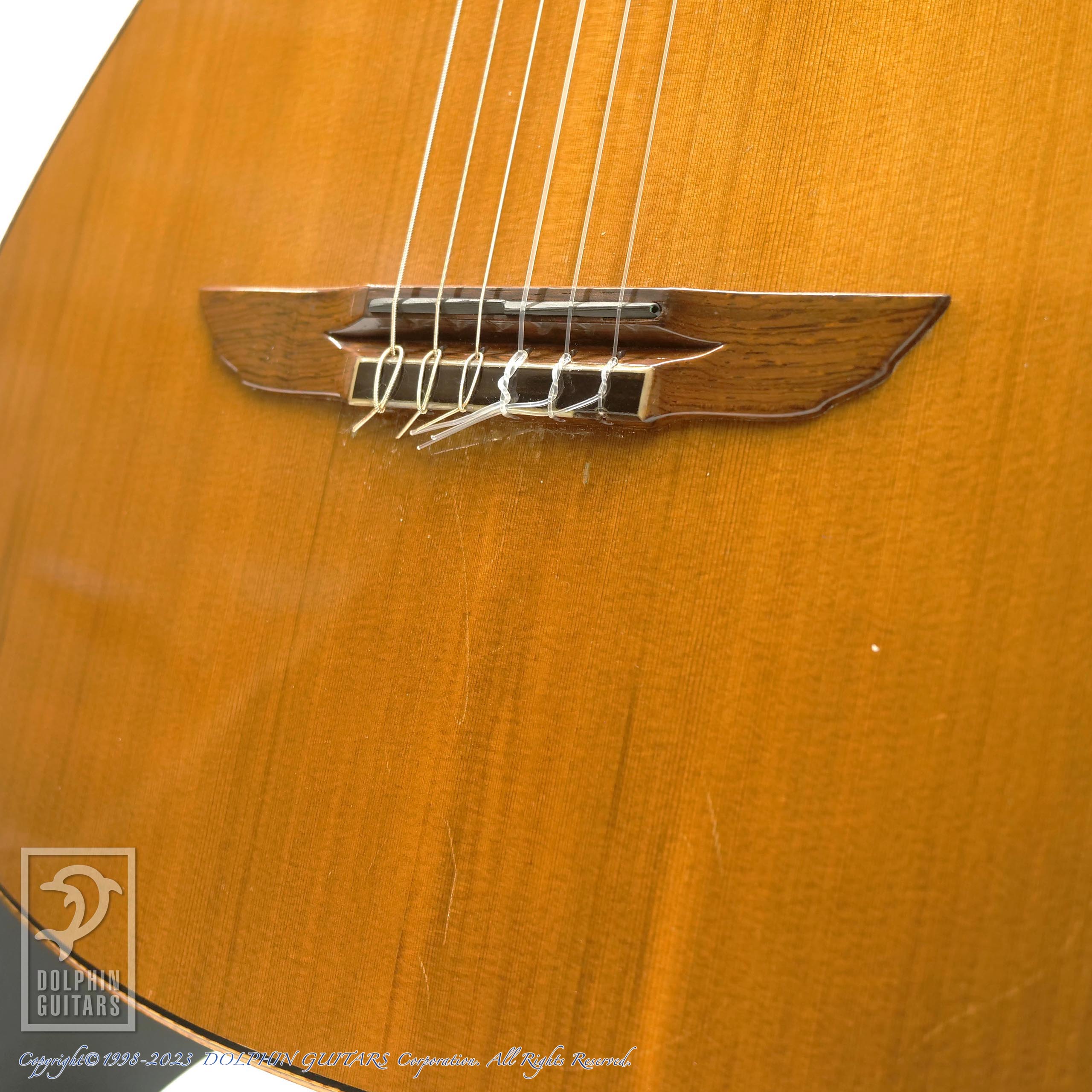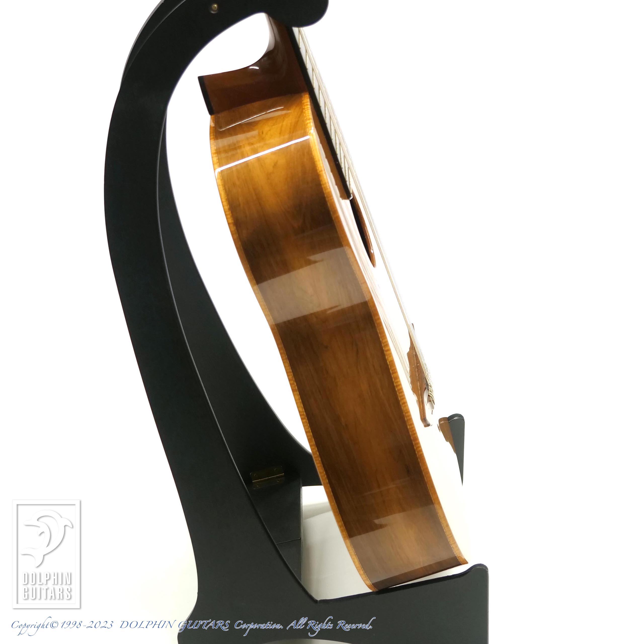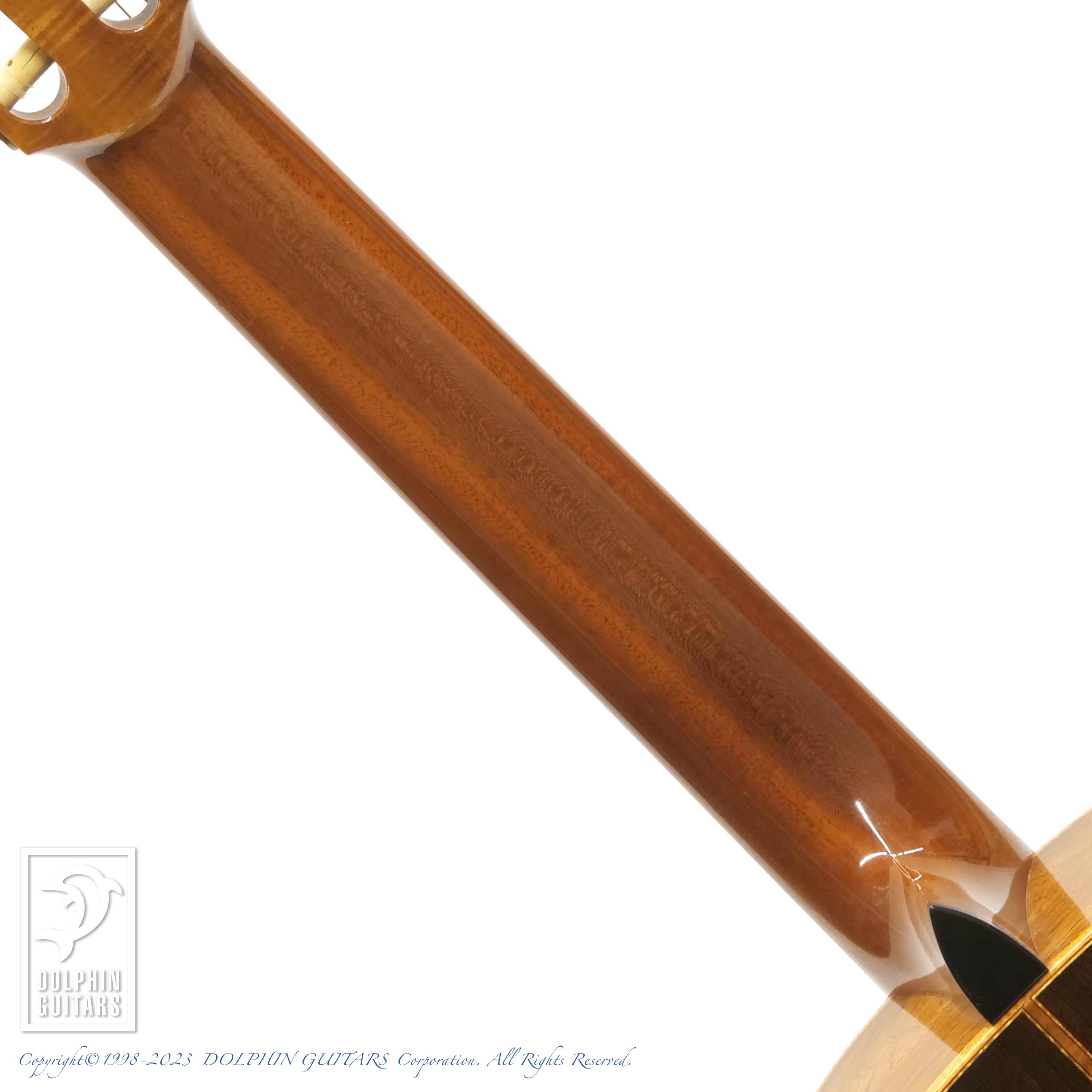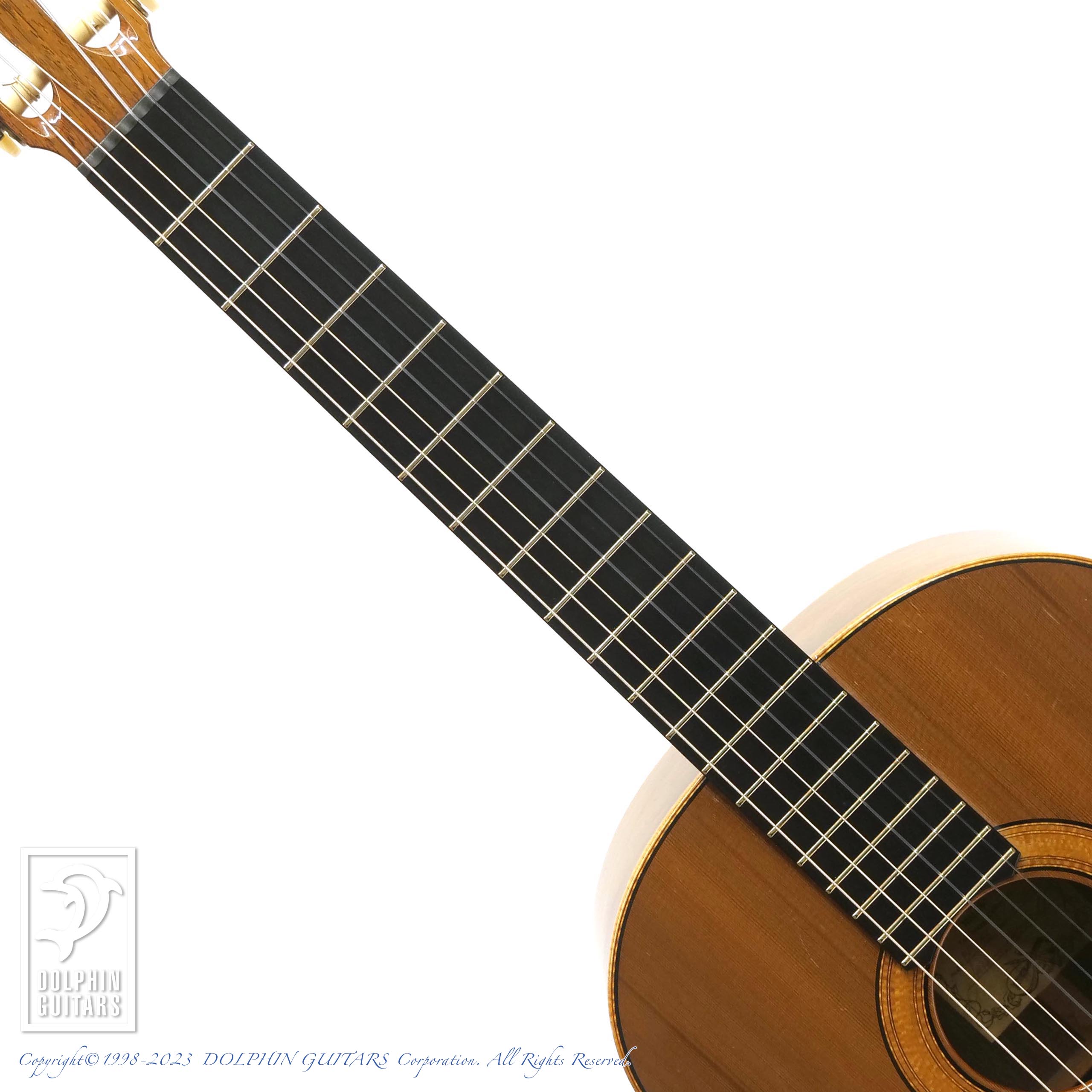バックのハカランダは目の詰まった非常にグレードの高いものを使用しており、杢目フェチも納得の風格です。トップのシダーのカラーと淡い色味のサイドバックの統一感や、弾き込まれた様子も渋さを演出しております。